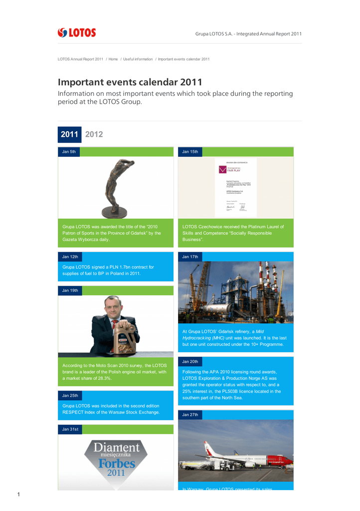 Grupa LOTOS S.A. - Integrated Annual Report 2011 LOTOS Annual Report 2011 / Home / Useful information / Important events calendar 2011 Important events calendar 2011 Information on most important events which took place during the reporting period at the LOTOS Group. 2011 2012 Jan 5th Jan 15th Grupa LOTOS was awarded the title of the “2010 Patron of Sports in the Province of Gdańsk” by the Gazeta Wyborcza daily. LOTOS Czechowice received the Platinum Laurel of Skills and Competence “Socially Responsible Business”. Jan 12th Jan 17th Grupa LOTOS signed a PLN 1.7bn contract for supplies of fuel to BP in Poland in 2011. Jan 19th At Grupa LOTOS’ Gdańsk refinery, a Mild Hydrocrack ing (MHC) unit was launched. It is the last but one unit constructed under the 10+ Programme. According to the Moto Scan 2010 survey, the LOTOS brand is a leader of the Polish engine oil market, with a market share of 28.3%. Jan 25th Grupa LOTOS was included in the second edition RESPECT Index of the Warsaw Stock Exchange. Jan 20th Following the APA 2010 licensing round awards, LOTOS Exploration & Production Norge AS was granted the operator status with respect to, and a 25% interest in, the PL503B licence located in the southern part of the North Sea. Jan 27th Jan 31st In Warsaw, Grupa LOTOS presented its sales 1 LOTOS Kolej received a distinction in the “2011 Forbes’ Diamonds” ranking of companies with annual revenues exceeding PLN 250m. LOTOS Kolej came fifth in the ranking of companies from the Province of Gdańsk. Jan 31st In Warsaw, Grupa LOTOS presented its sales strategy until 2015 – Supply, Trading and Optimatization (STO). Grupa LOTOS will focus primarily on the effective management of increased oil and product streams, anticipated on the completion of the 10+ Programme, diversification of feedstock sources and projects designed to optimally exploit the flexibility of the modernised refinery. Additionally, the trading unit will attempt to optimise the valuation and use of feedstock reserves held (delivery to the refinery, sale and barter transactions) and to reach more remote markets for petroleum products, characterised by more attractive demand and price structures. Jan 31st LOTOS Asfalt received a distinction in the “2011 Forbes’ Diamonds” ranking of companies with annual revenues exceeding PLN 250m. LOTOS Asfalt came eighth in the ranking of companies from the Province of Gdańsk. Feb 3rd LOTOS Parafiny received a distinction in the “2011 Forbes’ Diamonds”, coming 23rd on the Rzeszów Province’s list of middle-sized enterprises with revenues of PLN 50-250m. Feb 3rd Through its subsidiary - LOTOS Petrobaltic, Grupa LOTOS acquired a 100% interest in AB Geonafta, which produces crude oil in the territory of Lithuania. Feb 4th Grupa LOTOS received the title of the Gdynia Sport Partner 2010. Feb 8th LOTOS Parafiny won the “2011 Business Cheetah” title in the Province of Rzeszów, in the “Market value increase and dynamic growth” category. Feb 11th Grupa LOTOS won the first place in the “Investor relations” category of the annual ranking “Listed Company of the Year”, and the fifth place in the “Listed Company of the Year” ranking prepared by the Pentor Institute for the Puls Biznesu weekly. Feb 25th Grupa LOTOS is among the leaders of the BI-NGO 2010 Index. The index focuses on the quality of internet communications related to social commitment of the 500 largest Polish companies, as listed by the Rzeczpospolita daily. Feb 25th 2 LOTOS Kolej purchased three more electric locomotives Bombardier TRAXX MS. The company has the largest fleet of modern locomotives in Poland. Mar 1st LOTOS Petrobaltic’s ship “Aphrodite I” played an important part in the rescue of the crew of the fishing boat "Wła-97" in the Baltic Sea. Mar 3rd The LOTOS brand received a Business Superbrand distinction from The Superbrands Ltd. Mar 7th According to a report published by Polska Organizacja Przemysłu i Handlu Naftowego (Polish Organisation of Oil Industry and Trade), Grupa LOTOS’ share in the domestic fuel market stood at 31.3% in 2010. This means a 3.1 pp increase year on year. The Company’s strategy for 2011–2015 assumes a 30% share in the market. LOTOS Kolej opened a new railway dispatching office in Wrocław. Mar 30th Mar 28th Aliten – a modern open gearing lubricant manufactured by LOTOS Oil – received an award in the “2010 Product of the Year” competition. Prime Ministers Donald Tusk honoured with his presence the gala event at the Gdańsk refinery of Grupa LOTOS organized to celebrate the completion of the 10+ Programme – the biggest Polish investment project in the last 20 years. Next to the new Crude and Vacuum Distillation Unit (CDU/VDU), a press briefing was held with representatives of Polish television networks TVP, TVN and Polsat, and a several dozen journalists as well as the management of Grupa LOTOS and persons in charge of the 10+ Programme. Mar 31st At Grupa LOTOS’ Gdańsk refinery, a Residiuum Oil Supercritical Extraction (ROSE) unit was launched. It is the last unit constructed under the 10+ Programme. Apr 20th The fourth issue of the bonus Navigator programme started. As part of the programme, customers collect credits redeemable for prizes at over 250 LOTOS service stations all over the Poland. Apr 20th The LOTOS Group came fifth in the 2010 “500 List”, having advanced four places relative to 2009. The ranking, prepared by the Rzeczpospolita daily, lists the largest companies in Poland. Apr 20th-22nd Following replacement of leg shock absorbers and overhaul of the main crane, the Petrobaltic drilling platform left Port Północny in Gdańsk and was towed to the B3 field. The B3 field is located around 70 km north off Cape Rozewie. LOTOS Petrobaltic produces about 4,000 barrels of crude oil daily from the field. May 11th 3 May 11th In 2011, during the 18th edition of the “Petrol Station” International Trade Fair, LOTOS Paliwa p