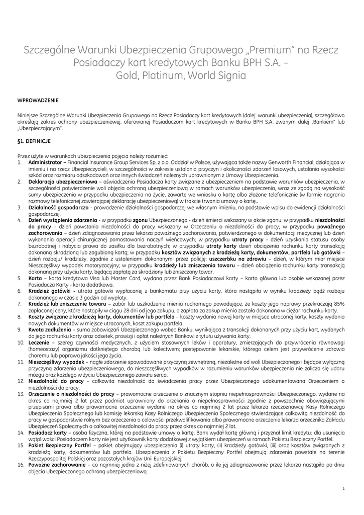 Szczególne Warunki Ubezpieczenia Grupowego „Premium” na Rzecz Posiadaczy kart kredytowych Banku BPH S.A. – Gold, Platinum, World Signia WPROWADZENIE Niniejsze Szczególne Warunki Ubezpieczenia Grupowego na Rzecz Posiadaczy kart kredytowych (dalej: warunki ubezpieczenia), szczegółowo określają zakres ochrony ubezpieczeniowej, oferowanej Posiadaczom kart kredytowych w Banku BPH S.A. zwanym dalej „Bankiem” lub „Ubezpieczającym”. §1. DEFINICJE Przez użyte w warunkach ubezpieczenia pojęcia należy rozumieć: 1. Administrator – Financial Insurance Group Services Sp. z o.o. Oddział w Polsce, używająca także nazwy Genworth Financial, działająca w imieniu i na rzecz Ubezpieczycieli, w szczególności w zakresie ustalania przyczyn i okoliczności zdarzeń losowych, ustalania wysokości szkód oraz rozmiaru odszkodowań oraz innych świadczeń należnych uprawnionym z Umowy Ubezpieczenia. 2. Deklaracja ubezpieczeniowa – oświadczenia Posiadacza karty związane z ubezpieczeniem na podstawie warunków ubezpieczenia, w szczególności potwierdzenie woli objęcia ochroną ubezpieczeniową w ramach warunków ubezpieczenia, wraz ze zgodą na wysokość sumy ubezpieczenia w przypadku ubezpieczenia na życie, zawarte we wniosku o kartę albo złożone telefonicznie (w formie nagrania rozmowy telefonicznej zawierającej deklarację ubezpieczeniową) w trakcie trwania umowy o kartę.. 3. Działalność gospodarcza - prowadzenie działalności gospodarczej we własnym imieniu, na podstawie wpisu do ewidencji działalności gospodarczej. 4. Dzień wystąpienia zdarzenia - w przypadku zgonu Ubezpieczonego - dzień śmierci wskazany w akcie zgonu; w przypadku niezdolności do pracy - dzień powstania niezdolności do pracy wskazany w Orzeczeniu o niezdolności do pracy; w przypadku poważnego zachorowania – dzień zdiagnozowania przez lekarza poważnego zachorowania, potwierdzonego w dokumentacji medycznej lub dzień wykonania operacji chirurgicznej pomostowania naczyń wieńcowych; w przypadku utraty pracy - dzień uzyskania statusu osoby bezrobotnej i nabycia prawa do zasiłku dla bezrobotnych; w przypadku utraty karty dzień obciążenia rachunku karty transakcją dokonaną skradzioną lub zagubioną kartą; w przypadku kosztów związanych z kradzieżą karty, dokumentów, portfela lub gotówki – dzień rozboju/ kradzieży, zgodnie z ustaleniami dokonanymi przez policję; uszczerbku na zdrowiu – dzień, w którym miał miejsce Nieszczęśliwy wypadek motoryzacyjny; w przypadku kradzieży lub zniszczenia towaru – dzień obciążenia rachunku karty transakcją dokonaną przy użyciu karty, będącą zapłatą za skradziony lub zniszczony towar. 5. Karta – karta kredytowa Visa lub Master Card, wydana przez Bank Posiadaczowi karty – karta główna lub osobie wskazanej przez Posiadacza Karty - karta dodatkowa. 6. Kradzież gotówki - utrata gotówki wypłaconej z bankomatu przy użyciu karty, która nastąpiła w wyniku kradzieży bądź rozboju dokonanego w czasie 3 godzin od wypłaty. 7. Kradzież lub zniszczenie towaru – zabór lub uszkodzenie mienia ruchomego powodujące, że koszty jego naprawy przekraczają 85% zapłaconej ceny, które nastąpiły w ciągu 28 dni od jego zakupu, a zapłata za zakup mienia została dokonana w ciężar rachunku karty. 8. Koszty związane z kradzieżą karty, dokumentów lub portfela – koszty wydania nowej karty w miejsce utraconej karty, koszty wydania nowych dokumentów w miejsce utraconych, koszt zakupu portfela. 9. Kwota zadłużenia – suma zobowiązań Ubezpieczonego wobec Banku, wynikająca z transakcji dokonanych przy użyciu kart, wydanych do jego rachunku karty oraz odsetek, prowizji i opłat należnych Bankowi z tytułu używania karty. 10. Leczenie – szereg czynności medycznych, z użyciem stosownych leków i aparatury, zmierzających do przywrócenia równowagi (homeostazy) organizmu dotkniętego chorobą lub kalectwem; postępowanie lekarskie, którego celem jest przywrócenie zdrowia choremu lub poprawa jakości jego życia. 11. Nieszczęśliwy wypadek – nagłe zdarzenie spowodowane przyczyną zewnętrzną, niezależne od woli Ubezpieczonego i będące wyłączną przyczyną zdarzenia ubezpieczeniowego, do nieszczęśliwych wypadków w rozumieniu warunków ubezpieczenia nie zalicza się udaru mózgu oraz każdego w życiu Ubezpieczonego zawału serca. 12. Niezdolność do pracy - całkowita niezdolność do świadczenia pracy przez Ubezpieczonego udokumentowana Orzeczeniem o niezdolności do pracy. 13. Orzeczenie o niezdolności do pracy – prawomocne orzeczenie o znacznym stopniu niepełnosprawności Ubezpieczonego, wydane na okres co najmniej 2 lat przez podmiot uprawniony do orzekania o niepełnosprawności zgodnie z powszechnie obowiązującymi przepisami prawa albo prawomocne orzeczenie wydane na okres co najmniej 2 lat przez lekarza rzeczoznawcę Kasy Rolniczego Ubezpieczenia Społecznego lub komisję lekarską Kasy Rolniczego Ubezpieczenia Społecznego stwierdzające całkowitą niezdolność do pracy w gospodarstwie rolnym bez orzeczenia o celowości przekwalifikowania albo prawomocne orzeczenie lekarza orzecznika Zakładu Ubezpieczeń Społecznych o całkowitej niezdolności do pracy przez okres co najmniej 2 lat. 14. Posiadacz karty – osoba fizyczna, której na podstawie umowy o kartę, Bank wydał kartę główną i przyznał limit kredytu; dla usunięcia wątpliwości Posiadaczem karty nie jest użytkownik karty dodatkowej z wyjątkiem ubezpieczeń w ramach Pakietu Bezpieczny Portfel. 15. Pakiet Bezpieczny Portfel – pakiet obejmujący ubezpieczenia (i) utraty karty, (ii) kradzieży gotówki, (iii) oraz kosztów związanych z kradzieżą karty, dokumentów lub portfela. Ubezpieczenia z Pakietu Bezpieczny Portfel obejmują zdarzenia powstałe na terenie Rzeczypospolitej Polskiej oraz pozostałych krajów Unii Europejskiej. 16. Poważne zachorowanie – co najmniej jedna z niżej zdefiniowanych