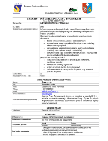 European Employment Services Wojewódzki Urząd Pracy w Rzeszowie (Opole) CZECHY - INŻYNIER PROCESU PRODUKCJI Nr ref. EURES: CZBEA70117W Stanowisko: INŻYNIER PROCESU PRODUKCJI Kod ISCO: Opis stanowiska/ zakres obowiązków: 2146 Liczba etatów: Miejsce zatrudnienia – kraj: 20 Czechy Inżynier procesu jest odpowiedzialny za część procesu wytwarzania, pakowania lub procesu logistycznego od pierwszego dnia pracy dla Procter & Gamble Obejmuje to odpowiedzialność w szczególności w następujących obszarach: dbanie o niezawodność, jakość i bezpieczeństwo wprowadzanie nowych projektów i inicjatyw (nowe materiały, zwiększanie wydajności) wprowadzanie ulepszeń (zmniejszanie awarii, optymalizacja produkcji, oszczędność energii i materiałów) komunikowanie się z ośrodkami inżynierii, badań i rozwoju oraz innymi zakładami P&G oraz dostawcami przykładowe obszary produkcji: linia pakowania proszków do prania (pudła kartonowe, plastikowe torby itp.) wewnętrzne procesy logistyczne system produkcji płynów do mycia naczyń końcowe mieszanie bazy proszku do prania przy tworzeniu proszku do prania DANE PODMIOTU OFERUJĄCEGO PRACĘ Nazwa: Kraj: Adres: Telefon: e-mail: Strona internetowa: Krótki opis działalności gospodarczej Anyx s. r. o. Republika Czeska Masarykova 1418, Hořovice +420739202531 [email protected] www.anyx.cz Agencja Pracy Tymczasowej Anyx s.r.o. powstała w grudniu 2010 r. , posiada zezwolenie czeskiego Ministerstwa Pracy i Spraw Socjalnych do prowadzenia działalności pośrednictwa pracy o charakterze agencji pracy tymczasowej. MIEJSCE PRACY Lokalizacja: Rakovnik - 60 km od Pragi WYMAGANIA Wykształcenie: Doświadczenie zawodowe: wyższe (chemiczne lub techniczne) nie jest wymagane ale pożądane Znajomość języków: Język Angielski Inne istotne wymagania: • umiejętności analityczne, umiejętność samodzielnej pracy na podstawie dostarczonych danych i informacji • zdolność i gotowość do rozwiązywania problemów • własna inicjatywa i otwartości na zmiany Poziom komunikatywny • gotowość do uczenia się nowych rzeczy i chęć rozwoju • umiejętności przywódcze, umiejętność kierowania małym zespołem projektu WYNAGRODZENIE I WARUNKI ZATRUDNIENIA Wysokość wynagrodzenia: Rodzaj stawki wynagrodzenia: Dodatkowe świadczenia: zakwaterowanie wyżywienie inne Rodzaj umowy: Wymiar czasu pracy Czas trwania umowy: Liczba godzin tygodniowo: od 40 000 KCZ (1650 euro) brutto korona czeska Data rozpoczęcia: od zaraz możliwa pomoc ze strony pracodawcy bony na posiłki możliwe dodatki do kosztów podróży Umowa o pracę Pełny etat Na czas nieokreślony 40 godz. tyg. SPOSÓB SKŁADANIA DOKUMENTÓW APLIKACYJNYCH Osoby zainteresowane powyższą ofertą proszone są o przesłanie CV i listu motywacyjnego w języku angielskim lub czeskim drogą elektroniczną do pracodawcy na adres e-mail: [email protected] Dodatkowe informacje pod nr tel. +420 739 202 531 (w języku czeskim lub niemieckim) WAŻNOŚĆ 05.05.2011 Data publikacji: Termin przedkładania podań o pracę / zakończenia ważności oferty: DO ODWOŁANIA „Agencja pracy tymczasowej Anyx s.r.o. oświadczyła, że prowadzi działalność zgodnie z przepisami obowiązującymi w Republice Czeskiej”. Uprzejmie informujemy, że skontaktujemy się wyłącznie z wybranymi kandydatami. Urząd Pracy dokłada wszelkich starań, aby oferty pracy będące w zasobach urzędu, były rzetelne i wiarygodne. Ponieważ wszystkie oferty pracy pochodzą od osób trzecich Urząd Pracy zastrzega, że odpowiedzialność za ewentualne rozbieżności pomiędzy warunkami pracy zaprezentowanymi w niniejszej ofercie a warunkami zaproponowanymi przez potencjalnego pracodawcę ponosi pracodawca. Stosunek pracy z pracodawcą zagranicznym będzie zawarty w ramach prawa obowiązującego w kraju zatrudnienia. Oznacza to, że wszelkie roszczenie z tytułu nie wywiązywania się pracodawcy z warunków zawartych w umowie o pracę, dochodzić można wyłącznie w sądzie pracy w kraju zatrudnienia. W sytuacjach losowych pomoc polskich placówek konsularnych ogranicza się do ewentualnego udzielenia doraźnej pomocy (np. kredytu na zakup biletu powrotnego do Polski ). Na podstawie ustawy o ochronie danych osobowych z dnia 29 sierpnia 1997 r. (Dz. U. z 2002 r. Nr 101, poz. 926 ze zm.) informujemy, że administratorem danych osobowych wskazanych w dokumentach przekazanych w odpowiedzi na ofertę pracy jest pracodawca zagraniczny oraz Wojewódzki Urząd Pracy w Opolu, ul. Głogowska 25C, 45-315 Opole. Dane osobowe wskazane dobrowolnie w ww. dokumentach będą przetwarzane i udostępniane publicznym służbom zatrudnienia, pracodawcom lub podmiotom reprezentującym pracodawców do celów związanych z pośrednictwem pracy w ramach sieci EURES, na podstawie ustawy z dnia 20 kwietnia 2004 r. o promocji zatrudnienia i instytucjach rynku pracy (Dz. U. z 2008 r. Nr 69, poz. 415 ze zm.) przez okres konieczny do osiągnięcia celu określonego w przedmiotowej ustawie. Osobie, której dane osobowe dotyczą przysługuje prawo dostępu do ich treści i prawo ich poprawiania. OFERTA WAŻNA DO ODWOŁANIA www.eures.europa.eu www.wup-rzeszow.pl