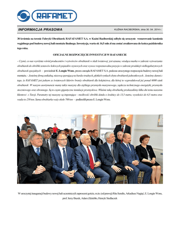 INFORMACJA PRASOWA KUŹNIA RACIBORSKA, dnia 30. 04. 2014 r. 30 kwietnia na terenie Fabryki Obrabiarek RAFAFAMET S.A. w Kuźni Raciborskiej odbyło się uroczyste wmurowanie kamienia węgielnego pod budowę nowej hali montażu finalnego. Inwestycja, warta ok 16,5 mln zł ma zostać zrealizowana do końca października tego roku. OFICJALNE ROZPOCZĘCIE INWESTYCJI W RAFAMECIE - Czymś, co nas wyróżnia wśród producentów i wytwórców obrabiarek w skali światowej jest uznana, wiodąca marka w zakresie wytwarzania obrabiarek do obróbki zestawów kołowych pojazdów szynowych oraz wysoce rozpoznawalna pozycja w zakresie produkcji wielkogabarytowych obrabiarek specjalnych – powiedział E. Longin Wons, prezes zarządu RAFAMET S.A. podczas uroczystego rozpoczęcia budowy nowej hali montażu. - Jesteśmy firmą unikalną, niszową operującą na bardzo trudnych, płytkich rynkach zbytu obrabiarek jednostkowych. Jesteśmy dumni z tego, że RAFAMET jest jednym ze światowych liderów branży obrabiarek dla kolejnictwa, dla której to wyprodukował już ponad 6000 sztuk obrabiarek W naszym asortymencie mamy także maszyny dla ciężkiego przemysłu maszynowego, zaplecza technicznego energetyki, przemysłu stoczniowego oraz obronnego. Są to często gigantyczne instalacje przemysłowe. Właśnie taką obrabiarkę przekazaliśmy kilka dni temu naszemu klientowi z Turcji. Parametry tej maszyny są imponujące : możliwość obróbki detalu o średnicy do 13,5 metra, wysokości do 6,5 metra oraz wadze to 250 ton. Sama obrabiarka waży około 700 ton – podkreślił prezes E. Longin Wons. W uroczystej inauguracji budowy nowej hali uczestniczyli zaproszeni goście, m.in. (od prawej) Rita Serafin, Arkadiusz Nagięć, E. Longin Wons, prof. Jerzy Buzek, Adam Zdziebło, Henryk Siedlaczek INFORMACJA PRASOWA KUŹNIA RACIBORSKA, dnia 30. 04. 2014 r. - Decyzja o rozpoczęciu inwestycji została podjęta już dawno. Chcieliśmy jednak powiązać termin oddania do eksploatacji nowej hali z okresem ożywienia gospodarczego na światowych rynkach, na jakich operuje przedsiębiorstwo. Musieliśmy wybrać również odpowiedni moment na rozpoczęcie inwestycji pod kątem najefektywniejszego jej wykorzystania. – wyjaśnił prezes. - Nasze serce bije w Polsce i dla Polski, ale biznesowo w większości funkcjonujemy na rynkach międzynarodowych, dla których corocznie kierujemy 70-80% swojej produkcji – dodał prezes. Poświęcenia inwestycji dokonał ksiądz proboszcz parafii w Kuźni Raciborskiej, dr Andrzej Pyttlik Generalnym wykonawcą inwestycji jest firma PRO-INVEST z Dąbrowy Górniczej, specjalizująca się w projektowaniu i realizacji dużych obiektów przemysłowych. - To bardzo nowoczesny i skomplikowany technologicznie projekt. Będą tu montowane bardzo ciężkie elementy. Przez to potrzebna jest silna konstrukcja. Obiekt będzie spełniać wszystkie wymagane normy – powiedział Arkadiusz Nagięć, właściciel firmy PROINVEST. - Z jednej strony to dla nas typowy projekt, ponieważ specjalizujemy się w realizacji inwestycji z różnych gałęzi przemysłu. Jednak w tym przypadku mamy do czynienia z obiektem specyficznym, ze względu na parametry techniczne hali jak i jej przeznaczenie. Spędziliśmy z załogą wiele godzin, by jak najlepiej poznać profil produkcji, aby przygotować klientowi obiekt spełniający jego oczekiwania i potrzeby. RAFAMET jest INFORMACJA PRASOWA KUŹNIA RACIBORSKA, dnia 30. 04. 2014 r. też oczywiście bardzo prestiżowym klientem, który wiele sobą reprezentuje. Dla nas to ogromna przyjemność pracować z takim partnerem – zapewnił A. Nagięć. Wśród gości uczestniczących w uroczystej inauguracji inwestycji byli były premier, prof. Jerzy Buzek, sentaor Adam Zdziebło – podsekretarz stanu w Ministerstwie Infrastruktury i Rozwoju, poseł Henryk Siedlaczek, burmistrz Kuźni Raciborskiej Rita Serafin, członek zarządu powiatu raciborskiego Józef Stukator, prezes Zespołu Odlewni Rafamet Adam Witecki oraz przedstawiciele firmy PRO-INVEST, podwykonawców, pracowników Spółki i Zespołu Odlewni Rafamet. Przybyli goście mieli okazję nie tylko poznać działalność RAFAMETU na podstawie krótkiej prezentacji, ale także zwiedzić halę montażu i na własne oczy przekonać się o skali produkowanych tu obrabiarek. Na zdjęciu: prof. Jerzy Buzek, Arkadiusz Nagięć, E. Longin Wons, Ewa Czubek INFORMACJA PRASOWA KUŹNIA RACIBORSKA, dnia 30. 04. 2014 r. - Dziś zdefiniowaliśmy dwa pojęcia. Pierwsze dotyczy słowa „detal”, które w RAFAMECIE oznacza przedmiot co najmniej 100-tonowy. Drugie to kwestia globalizacji, w najlepszym tego słowa znaczeniu. Jesteśmy w miejscowości, która w powiecie raciborskim nie należy do największych, a to właśnie tu produkuje się na cały świat urządzenia, które mają swoją klasę, znaczenie i ugruntowaną pozycję. RAFAMET już wiele lat temu dokonał olbrzymiego skoku do przodu w dziedzinie produkcji największych obrabiarek. Teraz jest to kwestia umocnienia pozycji na rynkach światowych – powiedział prof. Jerzy Buzek. - Tu jak w soczewce skupia się siła polskiej gospodarki – podkreślił. prof. J. Buzek, który następnie, wspólnie z E. Longinem Wonsem i Arturem Nagięciem uroczyście wmurowali kamień węgielny pod budowę nowej hali. Inwestycja została poświęcona przez księdza, proboszcza miejscowej parafii. - RAFAMET to stabilna firma, lider w zakresie produkcji obrabiarek, z dobrymi perspektywami rozwoju na przyszłość. Rozpoczęcie tej inwestycji to bardzo dobra informacja dla mieszkańców całego powiatu raciborskiego. O takie przedsiębiorstwa należy dbać, bo niosą w sobie też miastotwórczy charakter – powiedział wiceminister Adam Zdziebło. - To jest efekt ustawicznej, ciężkiej pracy i talentu pracowników. Decyzja o realizacji inwestycji pokazuje, że RAFAMET się rozwija, a te wszystkie rynki zbytu na całym świecie to nie przypadek. Jest się z czego cieszyć. Gratuluję te