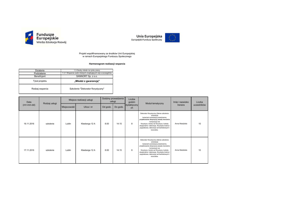 Projekt współfinansowany ze środków Unii Europejskiej w ramach Europejskiego Funduszu Społecznego Harmonogram realizacji wsparcia Działanie Podziałanie Beneficjent 1.3 Osoby młode na rynku pracy 1.3.1 Wsparcie osób młodych znajdujących się w szczególnie trudnej sytuacji Tytuł projektu „Młodzi z gwarancją" Rodzaj wsparcia Szkolenie "Dekorator florystyczny" SANNORT Sp. z o.o. Miejsce realizacji usługi Data (rrrr-mm-dd) 16.11.2016 17.11.2016 Godziny prowadzenia usługi Rodzaj usługi Miejscowość szkolenie szkolenie Lublin Lublin Ulica i nr Kleeberga 12 A Kleeberga 12 A Od godz. 8.00 8.00 Liczba godzin dydaktyczny Do godz. ch 14.15 14.15 8 8 Moduł tematyczny Dekorator florystyczny.Zakres szkolenia: aranżacja kwiaciarni,aranżacje przestrzenne, projektowanie ekspozycji,zasady tworzenia kompozycji we florystyce, trendy we florystyce, bukiety okazjonalne i dekoracje, florystyka ślubna i pogrzebowa, dekoracje sal bankietowych i kościołów. Dekorator florystyczny.Zakres szkolenia: aranżacja kwiaciarni,aranżacje przestrzenne, projektowanie ekspozycji,zasady tworzenia kompozycji we florystyce, trendy we florystyce, bukiety okazjonalne i dekoracje, florystyka ślubna i pogrzebowa, dekoracje sal bankietowych i kościołów. Imię i nazwisko trenera Liczba uczestników Anna Niedziela 10 Anna Niedziela 10 18.11.2016 21.11.2016 22.11.2016 23.11.2016 24.11.2016 25.11.2016 szkolenie szkolenie szkolenie szkolenie szkolenie szkolenie Lublin Lublin Lublin Lublin Lublin Lublin Kleeberga 12 A Kleeberga 12 A Kleeberga 12 A Kleeberga 12 A Kleeberga 12 A Kleeberga 12 A 8.00 8.00 8.00 8.00 8.00 8.00 14.15 14.15 14.15 14.15 14.15 14.15 8 8 8 8 8 8 Dekorator florystyczny.Zakres szkolenia: aranżacja kwiaciarni,aranżacje przestrzenne, projektowanie ekspozycji,zasady tworzenia kompozycji we florystyce, trendy we florystyce, bukiety okazjonalne i dekoracje, florystyka ślubna i pogrzebowa, dekoracje sal bankietowych i kościołów. Dekorator florystyczny.Zakres szkolenia: aranżacja kwiaciarni,aranżacje przestrzenne, projektowanie ekspozycji,zasady tworzenia kompozycji we florystyce, trendy we florystyce, bukiety okazjonalne i dekoracje, florystyka ślubna i pogrzebowa, dekoracje sal bankietowych i kościołów. Dekorator florystyczny.Zakres szkolenia: aranżacja kwiaciarni,aranżacje przestrzenne, projektowanie ekspozycji,zasady tworzenia kompozycji we florystyce, trendy we florystyce, bukiety okazjonalne i dekoracje, florystyka ślubna i pogrzebowa, dekoracje sal bankietowych i kościołów. Dekorator florystyczny.Zakres szkolenia: aranżacja kwiaciarni,aranżacje przestrzenne, projektowanie ekspozycji,zasady tworzenia kompozycji we florystyce, trendy we florystyce, bukiety okazjonalne i dekoracje, florystyka ślubna i pogrzebowa, dekoracje sal bankietowych i kościołów. Dekorator florystyczny.Zakres szkolenia: aranżacja kwiaciarni,aranżacje przestrzenne, projektowanie ekspozycji,zasady tworzenia kompozycji we florystyce, trendy we florystyce, bukiety okazjonalne i dekoracje, florystyka ślubna i pogrzebowa, dekoracje sal bankietowych i kościołów. Dekorator florystyczny.Zakres szkolenia: aranżacja kwiaciarni,aranżacje przestrzenne, projektowanie ekspozycji,zasady tworzenia kompozycji we florystyce, trendy we florystyce, bukiety okazjonalne i dekoracje, florystyka ślubna i pogrzebowa, dekoracje sal bankietowych i kościołów. Anna Niedziela 10 Anna Niedziela 10 Anna Niedziela 10 Anna Niedziela 10 Anna Niedziela 10 Anna Niedziela 10 28.11.2016 29.11.2016 30.11.2016 1.12.2016 szkolenie szkolenie szkolenie szkolenie Lublin Lublin Lublin Lublin Kleeberga 12 A Kleeberga 12 A Kleeberga 12 A Kleeberga 12 A 8.00 8.00 8.00 8.00 16.15 14.15 14.15 16.15 Razem 100 godzin 10 8 8 10 Dekorator florystyczny.Zakres szkolenia: aranżacja kwiaciarni,aranżacje przestrzenne, projektowanie ekspozycji,zasady tworzenia kompozycji we florystyce, trendy we florystyce, bukiety okazjonalne i dekoracje, florystyka ślubna i pogrzebowa, dekoracje sal bankietowych i kościołów. Dekorator florystyczny.Zakres szkolenia: aranżacja kwiaciarni,aranżacje przestrzenne, projektowanie ekspozycji,zasady tworzenia kompozycji we florystyce, trendy we florystyce, bukiety okazjonalne i dekoracje, florystyka ślubna i pogrzebowa, dekoracje sal bankietowych i kościołów. Dekorator florystyczny.Zakres szkolenia: aranżacja kwiaciarni,aranżacje przestrzenne, projektowanie ekspozycji,zasady tworzenia kompozycji we florystyce, trendy we florystyce, bukiety okazjonalne i dekoracje, florystyka ślubna i pogrzebowa, dekoracje sal bankietowych i kościołów. Dekorator florystyczny.Zakres szkolenia: aranżacja kwiaciarni,aranżacje przestrzenne, projektowanie ekspozycji,zasady tworzenia kompozycji we florystyce, trendy we florystyce, bukiety okazjonalne i dekoracje, florystyka ślubna i pogrzebowa, dekoracje sal bankietowych i kościołów. Anna Niedziela 10 Anna Niedziela 10 Anna Niedziela 10 Anna Niedziela 10