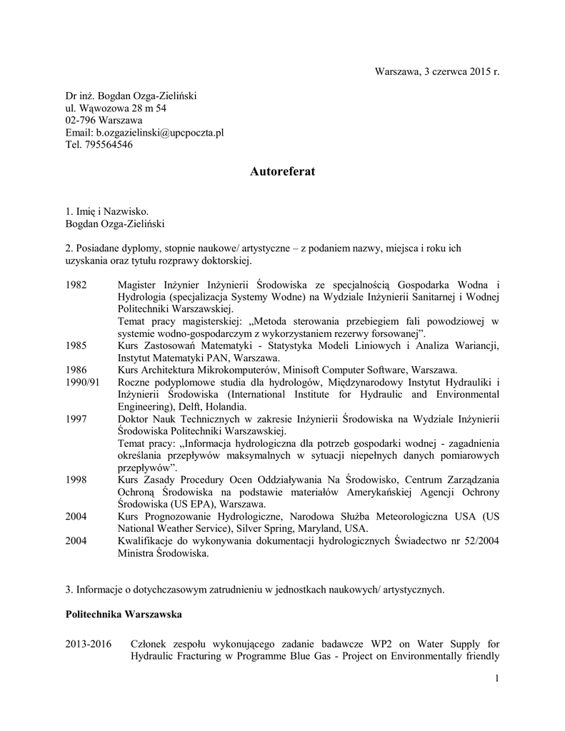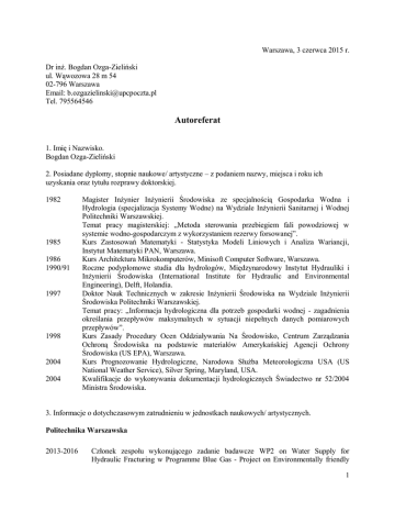 Warszawa, 3 czerwca 2015 r. Dr inż. Bogdan Ozga-Zieliński ul. Wąwozowa 28 m 54 02-796 Warszawa Email: [email protected] Tel. 795564546 Autoreferat 1. Imię i Nazwisko. Bogdan Ozga-Zieliński 2. Posiadane dyplomy, stopnie naukowe/ artystyczne – z podaniem nazwy, miejsca i roku ich uzyskania oraz tytułu rozprawy doktorskiej. 1982 1985 1986 1990/91 1997 1998 2004 2004 Magister Inżynier Inżynierii Środowiska ze specjalnością Gospodarka Wodna i Hydrologia (specjalizacja Systemy Wodne) na Wydziale Inżynierii Sanitarnej i Wodnej Politechniki Warszawskiej. Temat pracy magisterskiej: „Metoda sterowania przebiegiem fali powodziowej w systemie wodno-gospodarczym z wykorzystaniem rezerwy forsowanej”. Kurs Zastosowań Matematyki - Statystyka Modeli Liniowych i Analiza Wariancji, Instytut Matematyki PAN, Warszawa. Kurs Architektura Mikrokomputerów, Minisoft Computer Software, Warszawa. Roczne podyplomowe studia dla hydrologów, Międzynarodowy Instytut Hydrauliki i Inżynierii Środowiska (International Institute for Hydraulic and Environmental Engineering), Delft, Holandia. Doktor Nauk Technicznych w zakresie Inżynierii Środowiska na Wydziale Inżynierii Środowiska Politechniki Warszawskiej. Temat pracy: „Informacja hydrologiczna dla potrzeb gospodarki wodnej - zagadnienia określania przepływów maksymalnych w sytuacji niepełnych danych pomiarowych przepływów”. Kurs Zasady Procedury Ocen Oddziaływania Na Środowisko, Centrum Zarządzania Ochroną Środowiska na podstawie materiałów Amerykańskiej Agencji Ochrony Środowiska (US EPA), Warszawa. Kurs Prognozowanie Hydrologiczne, Narodowa Służba Meteorologiczna USA (US National Weather Service), Silver Spring, Maryland, USA. Kwalifikacje do wykonywania dokumentacji hydrologicznych Świadectwo nr 52/2004 Ministra Środowiska. 3. Informacje o dotychczasowym zatrudnieniu w jednostkach naukowych/ artystycznych. Politechnika Warszawska 2013-2016 Członek zespołu wykonującego zadanie badawcze WP2 on Water Supply for Hydraulic Fracturing w Programme Blue Gas - Project on Environmentally friendly 1 2012-2015 1997-2012 1992 1987 1985-1997 1983-1985 and economically feasible technologies for water supply, wastewater and waste management associated with shale gas exploration, finansowanego ze środków NCBiR, PGNiG, Orlen i Lotos. Starszy Wykładowca w Katedrze Ochrony i Kształtowania Środowiska na Wydziale Inżynierii Środowiska. Zajęcia dydaktyczne z zakresu hydrologii dla studentów specjalności Inżynieria Środowiska. Adiunkt w Zakładzie Gospodarki Wodnej i Hydrologii w Instytucie Systemów Inżynierii Środowiska (od 2007 Zakład Ochrony i Kształtowania Środowiska na Wydziale Inżynierii Środowiska, od 2011 Katedra OiKŚ). Praca badawcza w dziedzinie hydrologii, gospodarki wodnej i systemów ochrony środowiska. Zajęcia dydaktyczne z zakresu hydrologii dla studentów specjalności Systemy Ochrony Środowiska, Zaopatrzenia w Wodę, Unieszkodliwianie Ścieków i Odpadów oraz wydziału Mechanicznego, Energetyki i Lotnictwa. 6 miesięczny staż naukowy na Wydziale Hydrologii, Fizyki Gleby i Hydrauliki w Uniwersytecie Rolniczym w Wageningen, Holandia. 3 miesięczny staż naukowy na Wydziale Nauki i Inżynierii w Uniwersytecie w Ottawie, Kanada. Pracownik naukowo-badawczy w Zakładzie Gospodarki Wodnej i Hydrologii w Instytucie Inżynierii Środowiska Praca badawcza w dziedzinie hydrologii, gospodarki wodnej i systemów ochrony środowiska. Asystent Koordynatora Tematu „Podstawy metodyczne dla zarządzania zasobami wodnymi w systemach wodno-gospodarczych” w Programie Rządowym PR-7 „Kształtowanie i wykorzystanie zasobów wodnych”. Koordynacja wykonywanych prac badawczych. Sprawdzanie i recenzowanie raportów z wykonanych prac. Organizowanie seminariów naukowych. Instytut Meteorologii i Gospodarki Wodnej – Państwowy Instytut Badawczy 2003-2013 Adiunkt w Instytucie Meteorologii i Gospodarki Wodnej - Państwowym Instytucie Badawczym w tym: 2010-2013 Koordynator i członek zespołu wykonującego zadanie badawcze WP6. Joint transnational strategy development – a new model of environmental governance w projekcie European Lakes Under Environmental Stressors - Supporting lake governance to mitigate the impact of climate change – EULAKES finansowanego ze środków European Regional Development Fund dla Europy Środkowej. Koordynator i wykonawca ze strony IMGW-PIB zadania WG-2. Assessment of statistical methods for flood frequency estimation w FLOODFREQ COST Action ES0901 European Procedures for Flood Frequency Estimation. Koordynator i członek zespołu wykonującego temat badawczy B.2. Środowisko przyrodnicze jako czynnik rozwoju Mazowsza w projekcie Trendy Rozwojowe Mazowsza finansowanego ze środków UE Europejskiego Funduszu Społecznego i Kapitału Ludzkiego Narodowej Strategii Spójności. Kierownik Ośrodka Hydrologii. 2010-2013 2010-2011 2010-2011 2 2006-2009 2006-2009 2005 - 2009 2004-2013 2004 2003 1998 - 2003 Prowadzenie prac badawczo-rozwojowych w dziedzinie szeroko pojętej hydrologii (od pomiaru wielkości hydrologicznych do obliczania i udostępniania wymaganej informacji hydrologicznej). Zastępca Dyrektora ds. Służby Prognoz Hydrologicznych – Główny Hydrolog. Kierowanie pracami Służby Prognoz Hydrologicznych. Prace metodyczne na rzecz PSHM i TKZ w zakresie metod prognozowania i modelowania dla potrzeb osłony hydrologicznej kraju. Prace badawcze z zakresu hydrologii stosowanej w celu oceny i ochrony zasobów wodnych oraz określania charakterystyk hydrologicznych dla potrzeb projektowania obiektów gospodarki wodnej. Koordynator Programu Hydrologii DS-H i członek zespołu wykonującego zadanie badawcze DS-H8 w ramach Statutowej Działalności Badawczo-Rozwojowej IMGW finansowanej ze środków MNiSW. Kierownik Zakładu Hydrologii Stosowanej. Prowadzenie prac badawczo-rozwojowych w dziedzinie hydrologii inżynierskiej. Hydrological Advisor to Permanent Representative of Poland with WMO