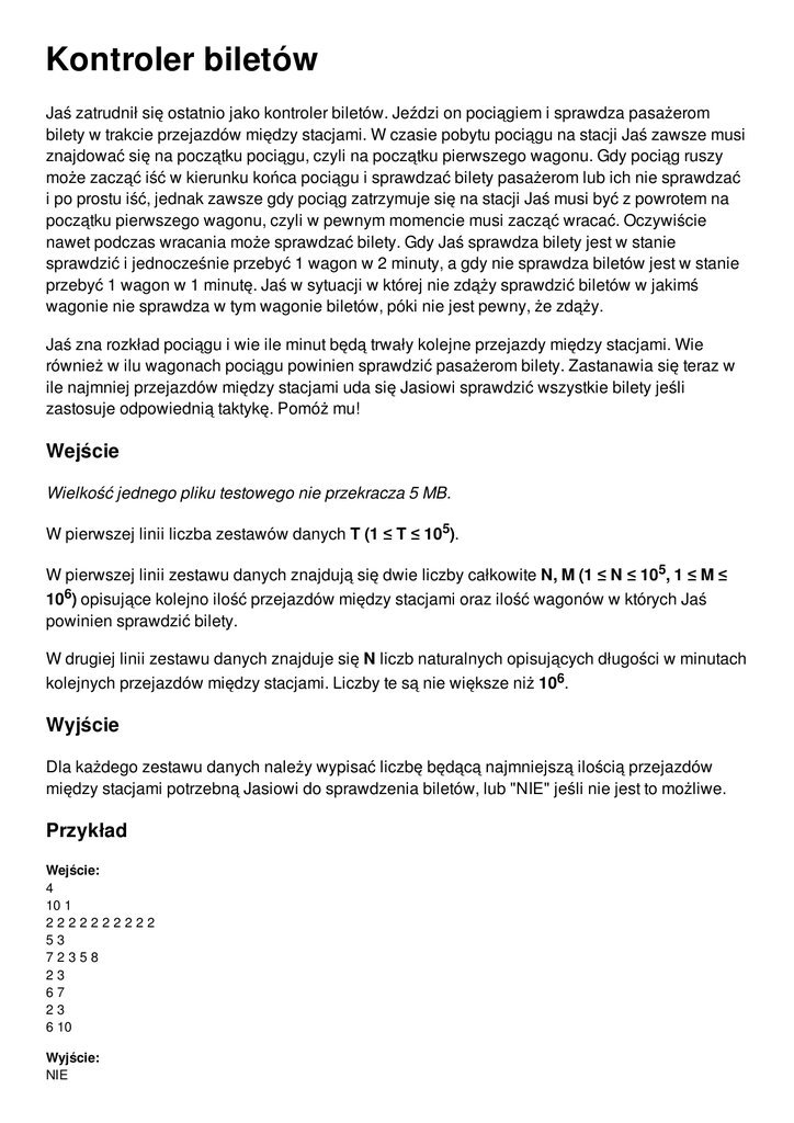 Kontroler biletów Jaś zatrudnił się ostatnio jako kontroler biletów. Jeździ on pociągiem i sprawdza pasażerom bilety w trakcie przejazdów między stacjami. W czasie pobytu pociągu na stacji Jaś zawsze musi znajdować się na początku pociągu, czyli na początku pierwszego wagonu. Gdy pociąg ruszy może zacząć iść w kierunku końca pociągu i sprawdzać bilety pasażerom lub ich nie sprawdzać i po prostu iść, jednak zawsze gdy pociąg zatrzymuje się na stacji Jaś musi być z powrotem na początku pierwszego wagonu, czyli w pewnym momencie musi zacząć wracać. Oczywiście nawet podczas wracania może sprawdzać bilety. Gdy Jaś sprawdza bilety jest w stanie sprawdzić i jednocześnie przebyć 1 wagon w 2 minuty, a gdy nie sprawdza biletów jest w stanie przebyć 1 wagon w 1 minutę. Jaś w sytuacji w której nie zdąży sprawdzić biletów w jakimś wagonie nie sprawdza w tym wagonie biletów, póki nie jest pewny, że zdąży. Jaś zna rozkład pociągu i wie ile minut będą trwały kolejne przejazdy między stacjami. Wie również w ilu wagonach pociągu powinien sprawdzić pasażerom bilety. Zastanawia się teraz w ile najmniej przejazdów między stacjami uda się Jasiowi sprawdzić wszystkie bilety jeśli zastosuje odpowiednią taktykę. Pomóż mu! Wejście Wielkość jednego pliku testowego nie przekracza 5 MB. W pierwszej linii liczba zestawów danych T (1 ≤ T ≤ 105). W pierwszej linii zestawu danych znajdują się dwie liczby całkowite N, M (1 ≤ N ≤ 105, 1 ≤ M ≤ 106) opisujące kolejno ilość przejazdów między stacjami oraz ilość wagonów w których Jaś powinien sprawdzić bilety. W drugiej linii zestawu danych znajduje się N liczb naturalnych opisujących długości w minutach kolejnych przejazdów między stacjami. Liczby te są nie większe niż 106. Wyjście Dla każdego zestawu danych należy wypisać liczbę będącą najmniejszą ilością przejazdów między stacjami potrzebną Jasiowi do sprawdzenia biletów, lub "NIE" jeśli nie jest to możliwe. Przykład Wejście: 4 10 1 2222222222 53 72358 23 67 23 6 10 Wyjście: NIE 4 2 2 Wyjaśnienie do ostatniego przykładu: W czasie pierwszego przejazdu między stacjami Jaś nic nie robi :) W czasie drugiego przejazdu Jaś sprawdza bilety w pierwszych trzech wagonach co zajmuje mu łącznie 6 minut. Następnie wraca na początek pierwszego wagonu co zajmuje mu kolejne 3 minuty. Łącznie 9 minut, więc wyrabia się w czasie.