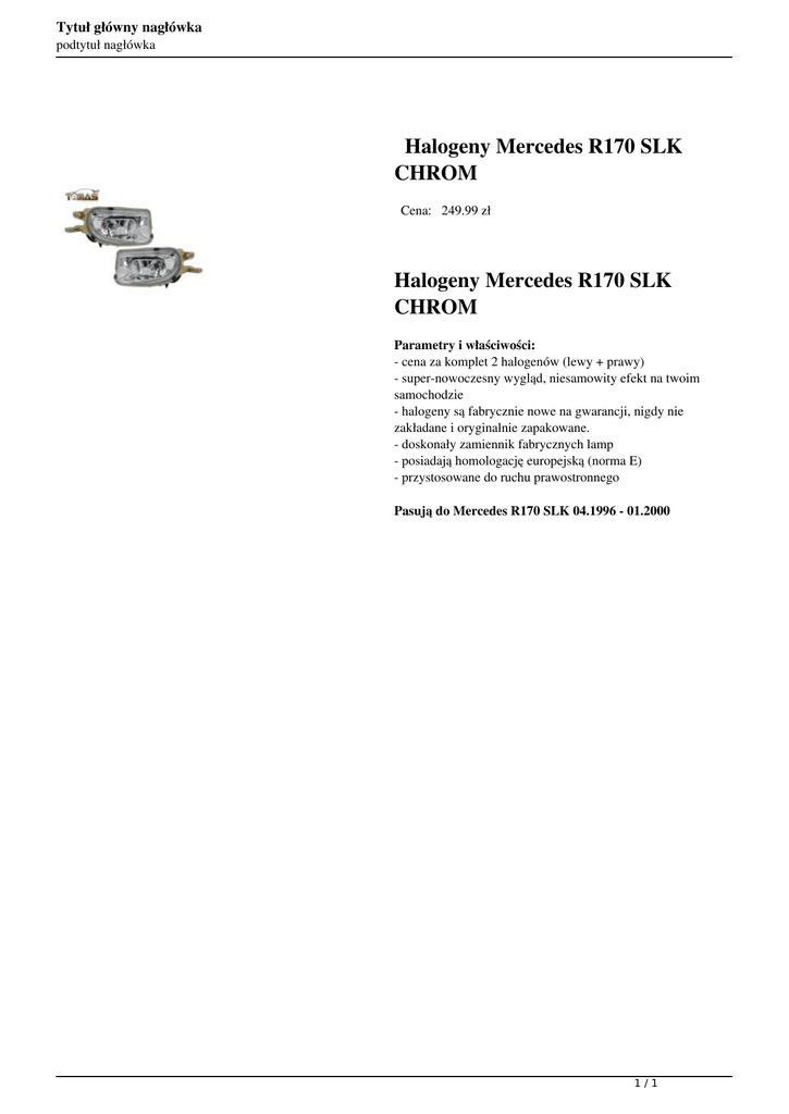 Tytuł główny nagłówka podtytuł nagłówka Halogeny Mercedes R170 SLK CHROM Cena: 249.99 zł Halogeny Mercedes R170 SLK CHROM Parametry i właściwości: - cena za komplet 2 halogenów (lewy + prawy) - super-nowoczesny wygląd, niesamowity efekt na twoim samochodzie - halogeny są fabrycznie nowe na gwarancji, nigdy nie zakładane i oryginalnie zapakowane. - doskonały zamiennik fabrycznych lamp - posiadają homologację europejską (norma E) - przystosowane do ruchu prawostronnego Pasują do Mercedes R170 SLK 04.1996 - 01.2000 1/1 Powered by TCPDF (www.tcpdf.org)