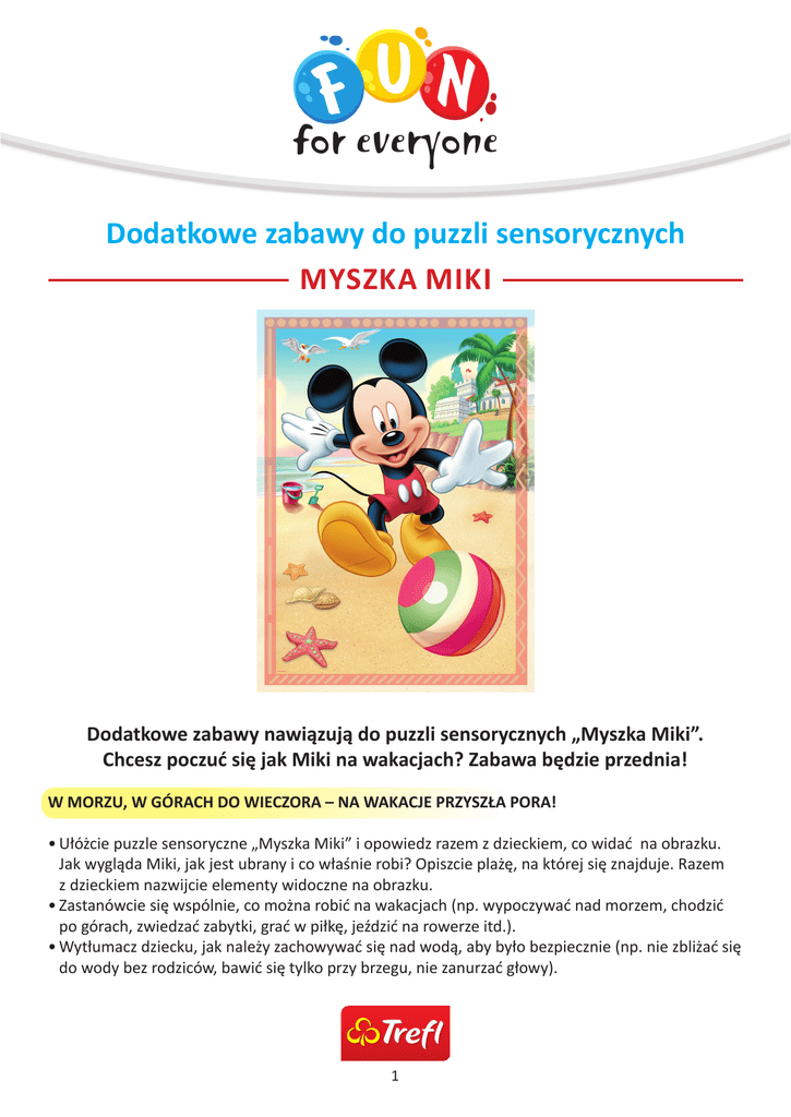 Dodatkowe zabawy do puzzli sensorycznych MYSZKA MIKI Dodatkowe zabawy nawiązują do puzzli sensorycznych „Myszka Miki”. Chcesz poczuć się jak Miki na wakacjach? Zabawa będzie przednia! W MORZU, W GÓRACH DO WIECZORA – NA WAKACJE PRZYSZŁA PORA! •Ułóżcie puzzle sensoryczne „Myszka Miki” i opowiedz razem z dzieckiem, co widać na obrazku. Jak wygląda Miki, jak jest ubrany i co właśnie robi? Opiszcie plażę, na której się znajduje. Razem z dzieckiem nazwijcie elementy widoczne na obrazku. •Zastanówcie się wspólnie, co można robić na wakacjach (np. wypoczywać nad morzem, chodzić po górach, zwiedzać zabytki, grać w piłkę, jeździć na rowerze itd.). •Wytłumacz dziecku, jak należy zachowywać się nad wodą, aby było bezpiecznie (np. nie zbliżać się do wody bez rodziców, bawić się tylko przy brzegu, nie zanurzać głowy). 1 •Przy najbliższej wycieczce nad morze pobawcie się w zbieranie i grupowanie muszelek. Zebrane muszelki wymieszajcie na plażowym kocu. Poproś dziecko, aby na jedną kupkę położyło muszelki małe, a na drugą – większe. Jeszcze raz pomieszajcie wszystko. Teraz na jednej kupce powinny znaleźć się muszelki białe, a na drugiej – kolorowe. •Powiedz dziecku, do czego służą muszle, kto w nich mieszka i dlaczego można znaleźć je na plaży. Wytłumacz mu, że większe muszelki, przyłożone do ucha, wydają dźwięk szumu morza. Czy wiecie, jaki to dźwięk? •Czas na zabawę rowerkową. Połóż się z dzieckiem na podłodze i pokaż, jak się jeździ na rowerze. Następnie poruszajcie nogami w tym samym tempie – na początku przez 10, a potem przez 20 sekund. Możecie zmieniać tempo: najpierw pedałujcie wolniej, potem szybciej. •Pobawcie się razem z dzieckiem w naśladowanie surfera. Zamiast deski użyjcie kartki papieru albo kocyka i na ugiętych nogach udawajcie razem przygodę na falach. Na hasło: „rekin” dziecko musi podskoczyć, na hasło: „wysoka fala” – kucnąć, a na hasło: „nurek” zejść z kocyka / kartki papieru. Przeczytaj dziecku poniższy wierszyk pt. „Paluszek i główka”. Zapytaj, czy rozumie, o czym on opowiada. Jeśli nie, wytłumacz mu znaczenie takich pojęć jak: głowa, oczy, łydka, udo czy stopa. Poproś malucha, aby przy kolejnym czytaniu wskazywał palcem części ciała, o których mowa jest w wierszyku. Autor: Marta Cebera „Paluszek i główka” Na mej głowie włosy widać, Są też uszy – wszystko słychać! Mam tu ładnych oczek parę, Niżej nosek, dacie wiarę? A usteczka wciąż gotowe Chronić ząbki bardzo zdrowe. Całą głowę dźwiga szyja, Duet ten jej nawet sprzyja. A to brzuszek z pępkiem małym, Po obiedzie pełny cały! Głaszczę go rączkami dwiema, Złego w tym nic przecież nie ma. Pięć paluszków w rączce mojej, No i w stópce – również Twojej. Jedna noga, druga noga, Każda równie bardzo droga. Tu kolanko, tam kosteczka, A pod udem jest łydeczka. Chociaż latek u mnie mało, Znam ja dobrze moje ciało! 2