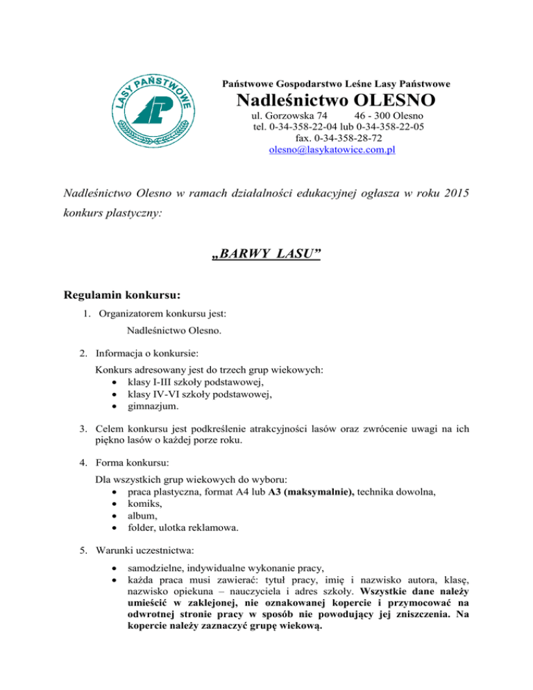 Państwowe Gospodarstwo Leśne Lasy Państwowe Nadleśnictwo OLESNO ul. Gorzowska 74 46 - 300 Olesno tel. 0-34-358-22-04 lub 0-34-358-22-05 fax. 0-34-358-28-72 [email protected] Nadleśnictwo Olesno w ramach działalności edukacyjnej ogłasza w roku 2015 konkurs plastyczny: „BARWY LASU” Regulamin konkursu: 1. Organizatorem konkursu jest: Nadleśnictwo Olesno. 2. Informacja o konkursie: Konkurs adresowany jest do trzech grup wiekowych: klasy I-III szkoły podstawowej, klasy IV-VI szkoły podstawowej, gimnazjum. 3. Celem konkursu jest podkreślenie atrakcyjności lasów oraz zwrócenie uwagi na ich piękno lasów o każdej porze roku. 4. Forma konkursu: Dla wszystkich grup wiekowych do wyboru: praca plastyczna, format A4 lub A3 (maksymalnie), technika dowolna, komiks, album, folder, ulotka reklamowa. 5. Warunki uczestnictwa: samodzielne, indywidualne wykonanie pracy, każda praca musi zawierać: tytuł pracy, imię i nazwisko autora, klasę, nazwisko opiekuna – nauczyciela i adres szkoły. Wszystkie dane należy umieścić w zaklejonej, nie oznakowanej kopercie i przymocować na odwrotnej stronie pracy w sposób nie powodujący jej zniszczenia. Na kopercie należy zaznaczyć grupę wiekową. 6. Konkurs jest dwuetapowy: Etap I – szkolny, w którym zostanie wyłonionych 6 prac (3 pierwsze miejsca i 3 wyróżnienia), w każdej grupie wiekowej, Etap II – prace będą ocenione w siedzibie Nadleśnictwa Olesno, przez komisję konkursową, powołaną przez Nadleśniczego. 7. Prace konkursowe (wyłonione w I etapie), należy dostarczyć do siedziby Nadleśnictwa Olesno w terminie do 27 lutego 2015 roku (czwartek). 8. W dniu 02 marca 2015r. zostaną ogłoszone wyniki konkursu i przesłane do wszystkich szkół, których uczniowie wzięli udział w konkursie. Jednocześnie poinformujemy o miejscu i terminie wręczenia nagród. 9. Przewidziano nagrody: rzeczowe dla trzech pierwszych miejsc i trzech wyróżnień w każdej grupie wiekowej, dyplomy i drobne upominki dla wszystkich uczestników II etapu, nagrody rzeczowe dla nauczycieli, których uczniowie zajęli trzy pierwsze miejsca w każdej grupie wiekowej, 10. Nadleśnictwo zastrzega sobie prawo wykorzystania nagrodzonych prac, poprzez wystawienie ich w muzeum, umieszczenie na stronie internetowej Nadleśnictwa Olesno oraz opublikowanie w folderach i prasie leśnej. 11. Nadleśnictwo zobowiązuje szkoły, których uczniowie wezmą udział w konkursie do uzyskania zgód opiekunów prawnych uczniów na przetwarzanie ich danych osobowych przez szkoły oraz Nadleśnictwo Olesno w celach związanych z przeprowadzeniem konkursu, jak również na wykorzystanie wizerunku uczniów, którzy brali udział w konkursie. Dane osobowe laureatów konkursu (imię, nazwisko, nazwa szkoły i nazwisko opiekuna – nauczyciela) zostaną opublikowane na stronie internetowej nadleśnictwa, a dane osobowe wszystkich uczestników konkursu zostaną podane przy pracach podczas ich wystawy w Izbie leśno-łowieckiej Muzeum Regionalnego w Oleśnie. 12. Regulamin konkursu jest do pobrania na stronie internetowej nadleśnictwa w zakładce edukacja. 13. Wszelkich informacji o konkursie udziela mgr inż. Joanna Kubiak (tel. 608 401 702). Sporządziła: Zatwierdzam: mgr inż. Joanna Kubiak Nadleśniczy mgr inż. Edward Rosół