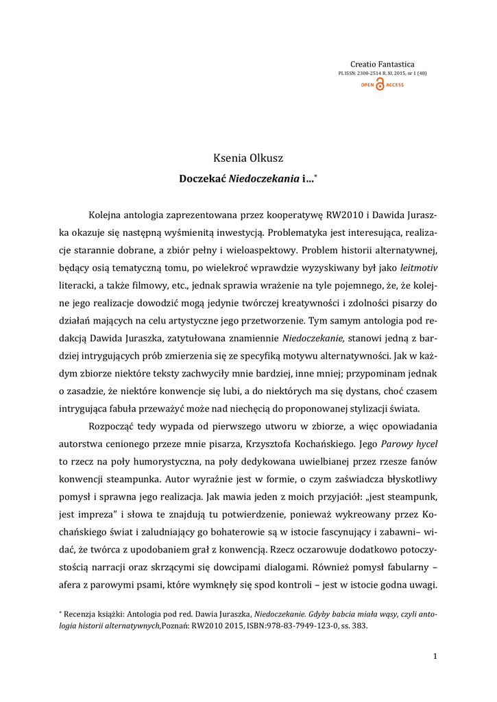 Creatio Fantastica PL ISSN: 2300-2514 R. XI, 2015, nr 1 (48) Ksenia Olkusz Doczekać Niedoczekania i… Kolejna antologia zaprezentowana przez kooperatywę RW2010 i Dawida Juraszka okazuje się następną wyśmienitą inwestycją. Problematyka jest interesująca, realizacje starannie dobrane, a zbiór pełny i wieloaspektowy. Problem historii alternatywnej, będący osią tematyczną tomu, po wielekroć wprawdzie wyzyskiwany był jako leitmotiv literacki, a także filmowy, etc., jednak sprawia wrażenie na tyle pojemnego, że, że kolejne jego realizacje dowodzić mogą jedynie twórczej kreatywności i zdolności pisarzy do działań mających na celu artystyczne jego przetworzenie. Tym samym antologia pod redakcją Dawida Juraszka, zatytułowana znamiennie Niedoczekanie, stanowi jedną z bardziej intrygujących prób zmierzenia się ze specyfiką motywu alternatywności. Jak w każdym zbiorze niektóre teksty zachwyciły mnie bardziej, inne mniej; przypominam jednak o zasadzie, że niektóre konwencje się lubi, a do niektórych ma się dystans, choć czasem intrygująca fabuła przeważyć może nad niechęcią do proponowanej stylizacji świata. Rozpocząć tedy wypada od pierwszego utworu w zbiorze, a więc opowiadania autorstwa cenionego przeze mnie pisarza, Krzysztofa Kochańskiego. Jego Parowy hycel to rzecz na poły humorystyczna, na poły dedykowana uwielbianej przez rzesze fanów konwencji steampunka. Autor wyraźnie jest w formie, o czym zaświadcza błyskotliwy pomysł i sprawna jego realizacja. Jak mawia jeden z moich przyjaciół: „jest steampunk, jest impreza” i słowa te znajdują tu potwierdzenie, ponieważ wykreowany przez Kochańskiego świat i zaludniający go bohaterowie są w istocie fascynujący i zabawni– widać, że twórca z upodobaniem grał z konwencją. Rzecz oczarowuje dodatkowo potoczystością narracji oraz skrzącymi się dowcipami dialogami. Również pomysł fabularny – afera z parowymi psami, które wymknęły się spod kontroli – jest w istocie godna uwagi. Recenzja książki: Antologia pod red. Dawia Juraszka, Niedoczekanie. Gdyby babcia miała wąsy, czyli antologia historii alternatywnych,Poznań: RW2010 2015, ISBN:978-83-7949-123-0, ss. 383. 1 Tym, co nieco psuje czytelniczą radość, jest finał opowiadania, w którym wszystko, co dotychczas dobrze się sprawdzało, zostaje rozmyte i rozmienione na drobne, a wszystko za sprawą – mam wrażenie – braku pomysłu na godziwe zakończenie tej cudnej historii. Kolejne opowiadanie, autorstwa Hanny Fronczak, Jeden na milion, to lektura przyjemna i w pewien sposób czarująca. Tekst, zrealizowany w narracji pierwszoosobowej, zainicjowany zostaje cytatem z Biblii Tysiąclecia, czytanym przez protagonistkę, MarfęIgnatiewnę Morozową, niespecjalnie atrakcyjną trzydziestosiedmiolatkę, masażystkę z zawodu. Akcja dzieje się w latach 80. XX w. Biblijny cytat przywołany zostaje z pełnym uzasadnieniem, bowiem długowieczność staje się leitmotivem opowiadania Fronczak. Przywołane tu zostają postaci znane z historii (powszechnej, lecz i historii sztuki), których życiorysy i późniejsze losy zostały przekonstruowane w taki sposób, aby pasować do relacjonowanych zdarzeń. Osią tych wypadków jest dążenie do kolejnej przemiany w obrębie ustroju i państwowości, realizowane w niezwykle oryginalny sposób. Bardzo sprytnie zostaje tutaj połączona historia z problemami, które doskonale znamy ze współczesnych wydarzeń (rozprzestrzenianie się islamizmu), co czyni tę opowieść tym atrakcyjniejszą, że czytelnik wie doskonale to, o czym główna bohaterka nie ma najmniejszego pojęcia. Warto zaznaczyć, że narracja jest niezwykle płynna, a tło opowieści zarysowane zostaje w sposób drobiazgowy i wnikliwy. Niestety zakończenie również i tego tekstu wydaje się rozmyte i niewyraźne na tle spektakularnej fabuły. Tego błędu ustrzegł się z pewnością Przemysław Hytroś w opowiadaniu Jak Maciek wojnę wygrał, będącym wariacją na temat legendy Śpiących Rycerzy, w interpretacji wikłającej w fabułę pojawienie się obcych. Zupełnie inną optykę proponuje czytelnikowi Iwona Kowalczyk w utworze Drahim, napisanym bardzo zgrabnie, z dużą swadą i swobodą. Ogromne wrażenie sprawiają na odbiorcy dynamiczne, plastycznie wykreowane sceny walk. Warto wspomnieć też, że autorka zastosowała tutaj bardzo sympatyczny zabieg, a mianowicie wprowadziła przyjemną archaizację języka wypowiedzi literackiej, obecną a to w dialogach, a to znów w partiach narracyjnych. Jest to przepysznie skrojona opowieść, z fascynującą intrygą i malowniczymi postaciami. Rzecz opisana zostaje z punktu widzenia cudzoziemca, który za towarzysza podróży i pobytu w Polsce dostaje szlachcica, wywodzącego się ze starej i dość tajemniczej 2 rodziny. Raczej sztampowo niestety potraktowane zostają kwestie polskiej gościnności oraz hucznych a zasobnych w trunki biesiad, co zaczyna już nużyć, skoro niemal w każdej z literackich relacji obcokrajowców pojawiają te same, do znudzenia identyczne motywy związane z pijaństwem, kacem i miejscowymi sposobami nań. Oryginalnym, acz miejscami przaśnym tekstem jest bez wątpienia Klątwa biskupa Kaczmarka, autorstwa Przemysława Karbowskiego. W mojej ocenie jest to bardzo udanarzecz, ze świetnymi, błyskotliwymi dialogami i barwnymi postaciami. Fabuła jest wariacją na temat zimnej wojny i porachunków amerykańsko-radzieckich z wykorzystaniem Polaków i Polski. Niektóre partie tekstu uznać można za zdecydowanie humorystyczne, co wskazuje na tendencję satyryczną. Znajdziemy tu też jednak gorzkie odwołanie do decyzji, które zapadły w odniesieniu do Polski w Jałcie, ale całość – mimo nieco fekalnego finału – jest w istocie dośćbardzo zabawna, zawiera także sporo odniesień – bardzo szczegółowych zresztą – do postaci autentycznych. Utwór Stanisława Truchana, Operacja Greta, to kunsztowne opowiadanie o 