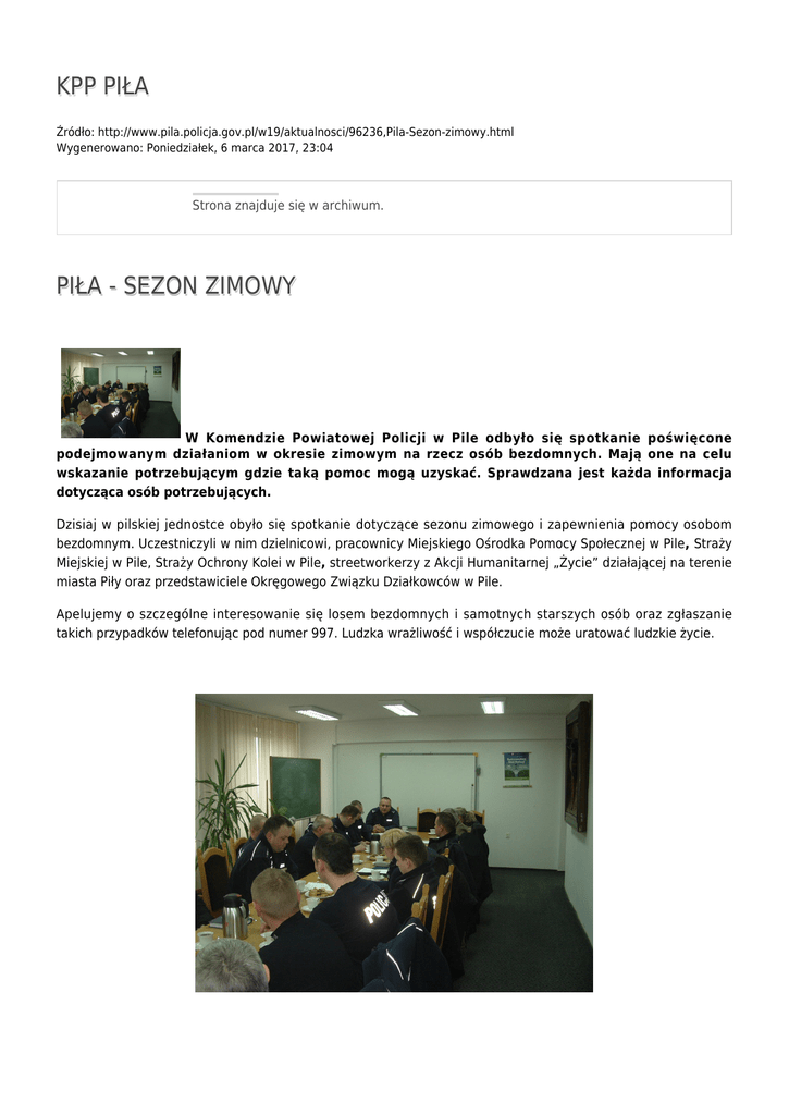 KPP PIŁA Źródło: http://www.pila.policja.gov.pl/w19/aktualnosci/96236,Pila-Sezon-zimowy.html Wygenerowano: Poniedziałek, 6 marca 2017, 23:04 Strona znajduje się w archiwum. PIŁA - SEZON ZIMOWY W Komendzie Powiatowej Policji w Pile odbyło się spotkanie poświęcone podejmowanym działaniom w okresie zimowym na rzecz osób bezdomnych. Mają one na celu wskazanie potrzebującym gdzie taką pomoc mogą uzyskać. Sprawdzana jest każda informacja dotycząca osób potrzebujących. Dzisiaj w pilskiej jednostce obyło się spotkanie dotyczące sezonu zimowego i zapewnienia pomocy osobom bezdomnym. Uczestniczyli w nim dzielnicowi, pracownicy Miejskiego Ośrodka Pomocy Społecznej w Pile, Straży Miejskiej w Pile, Straży Ochrony Kolei w Pile, streetworkerzy z Akcji Humanitarnej „Życie” działającej na terenie miasta Piły oraz przedstawiciele Okręgowego Związku Działkowców w Pile. Apelujemy o szczególne interesowanie się losem bezdomnych i samotnych starszych osób oraz zgłaszanie takich przypadków telefonując pod numer 997. Ludzka wrażliwość i współczucie może uratować ludzkie życie. Ważne telefony: Miejski Ośrodek Pomocy Społecznej w Pile ul. Kwiatowa 5 tel. 67 210 42 85 Całodobowo Monar-Markot Piła ul. Długosza 33 tel. 67 214 41 21 Straż Miejska w Pile tel. 986 Akcja Humanitarna „Życie” Piła ul. Okrzei 4A tel. 669 418 484, 506 706 939 Policja 997 Ocena: 0/5 (0) Tweetnij