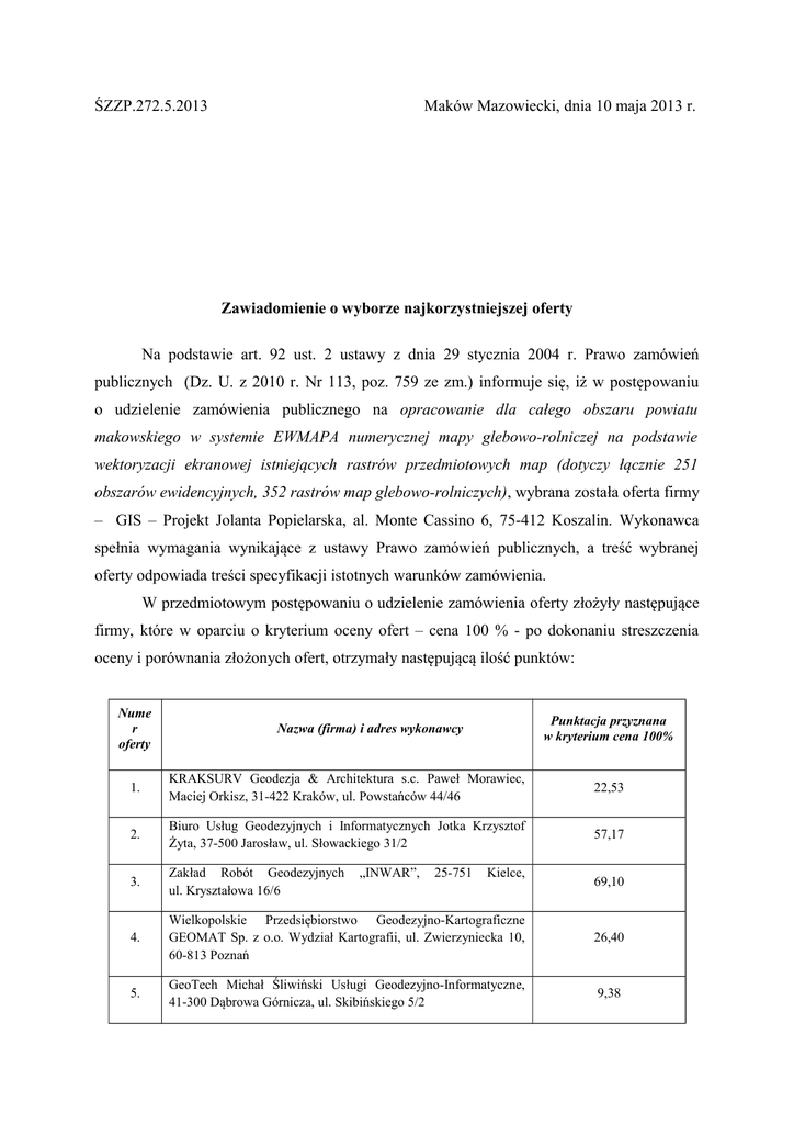 ŚZZP.272.5.2013 Maków Mazowiecki, dnia 10 maja 2013 r. Zawiadomienie o wyborze najkorzystniejszej oferty Na podstawie art. 92 ust. 2 ustawy z dnia 29 stycznia 2004 r. Prawo zamówień publicznych (Dz. U. z 2010 r. Nr 113, poz. 759 ze zm.) informuje się, iż w postępowaniu o udzielenie zamówienia publicznego na opracowanie dla całego obszaru powiatu makowskiego w systemie EWMAPA numerycznej mapy glebowo-rolniczej na podstawie wektoryzacji ekranowej istniejących rastrów przedmiotowych map (dotyczy łącznie 251 obszarów ewidencyjnych, 352 rastrów map glebowo-rolniczych), wybrana została oferta firmy – GIS – Projekt Jolanta Popielarska, al. Monte Cassino 6, 75-412 Koszalin. Wykonawca spełnia wymagania wynikające z ustawy Prawo zamówień publicznych, a treść wybranej oferty odpowiada treści specyfikacji istotnych warunków zamówienia. W przedmiotowym postępowaniu o udzielenie zamówienia oferty złożyły następujące firmy, które w oparciu o kryterium oceny ofert – cena 100 % - po dokonaniu streszczenia oceny i porównania złożonych ofert, otrzymały następującą ilość punktów: Nume r oferty Punktacja przyznana w kryterium cena 100% Nazwa (firma) i adres wykonawcy 1. KRAKSURV Geodezja & Architektura s.c. Paweł Morawiec, Maciej Orkisz, 31-422 Kraków, ul. Powstańców 44/46 22,53 2. Biuro Usług Geodezyjnych i Informatycznych Jotka Krzysztof Żyta, 37-500 Jarosław, ul. Słowackiego 31/2 57,17 3. Zakład Robót Geodezyjnych ul. Kryształowa 16/6 69,10 4. Wielkopolskie Przedsiębiorstwo Geodezyjno-Kartograficzne GEOMAT Sp. z o.o. Wydział Kartografii, ul. Zwierzyniecka 10, 60-813 Poznań 26,40 5. GeoTech Michał Śliwiński Usługi Geodezyjno-Informatyczne, 41-300 Dąbrowa Górnicza, ul. Skibińskiego 5/2 9,38 „INWAR”, 25-751 Kielce, 6. OPEGIEKA Okręgowe Przedsiębiorstwo GeodezyjnoKartograficzne OPEGIEKA Sp. z o.o. w Elblągu, Aleja Tysiąclecia 11, 82-300 Elbląg 23,67 7. „APE – GEO” Adrian Pałęga Usługi Geodezyjne, 42-400 Zawiercie, ul. Modrzewiowa 14a 18,50 8. ART – GEO ul. Elektorska 11 46,43 9. GEO EXPRES Joanna Kołda Usługi Geodezyjne, 41-303 Dąbrowa Górnicza, Al. J. Piłsudskiego 33/48 14,15 10. „GEO-MED” mgr inż. M. Górski Usługi Geodezyjno – Informatyczne, 41-219 Sosnowiec, ul. Gwiezdna 12/10, 41-216 Sosnowiec, ul. Armii Krajowej 64 8,47 11. Okręgowe Przedsiębiorstwo Geodezyjno – Kartograficzne Sp. z o.o. w Olsztynie, 10-117 Olsztyn, ul. 1 Maja 13 30,70 12. Unimap Jerzy Bryk, ul. Kossutha 11/505, 40-844 Katowice 33,68 13. ADAMIR Przedsiębiorstwo Usług Geodezyjnych s.c. Adam Kuchciński, Mirosław Łukasiak, ul. Płońska 7, 06-400 Ciechanów 10,08 14. Globmatix Spółka z o.o. 20-209 Lublin, ul. Mełgiewska 2 24,28 15. Usługi Geodezyjne i Kartograficzne „GEOSTANDARD” Piotr Łopaciuk, ul. 11 Listopada 6/18, 17-300 Siematycze 47,15 16. Usługi Geodezyjno-Kartograficzne Tomasz Klepacze, ul. Wierzbowa 38, 15-641 Białystok 58,54 17. LAND-STUDIO ul. Sportowa 7 18. „TRANS-GEO” Tomasz Zasowski, 26-807 Radzanów, Młodynie Dolne 47 / 26-800 Białobrzegi, Plac Zygmunta Starego 6a 35,40 19. GEO Geospatial Solutions dr 53-512 Wrocław, ul. Pochyła 8/5 19,20 20. Kancelaria Geodezyjna Jan Zasowski, 26-800 Białobrzegi, Plac Zygmunta Starego 6 46,05 21. Przedsiębiorstwo Usług Geodezyjnych S.C. Alicja Bugno & Robert Woiński, 38-300 Gorlice, ul. Kopernika 10 47,72 22. NetLand Sp. z o.o. Al. M. J. Piłsudskiego 77, 10-449 Olsztyn 28,85 23. GO4GEO Anna Posłuszna, ul. S. Grota-Roweckiego 32, 55-200 Oława 66,53 24. Geodezja XYZ sp. z o.o. 43-360 Bystra, ul. Szczyrkowska 71 29,32 25. Biuro Usługowo – Handlowe „ERMIS” Dariusz Karaszewski, Przyłęki, ul. Wodna 14, 86-005 Białe Błota 13,54 26. HOME EWA CIBOR, 10-343 Olsztyn, ul. Limanowskiego 22/6 16,27 Paweł J.Ł Lewandowski, Ptasiewicz, inż. 59-100 Polkowice, Wendołowicz, 09-100 Wojciech Płońsk, Milczarek, 12,14 27. RGPROJEKT Sp. z o.o. 30-394 Kraków, ul. Skotnicka 210 33,90 28. Tukaj Mapping Central Europe Sp. z o.o. ul. Odrzańska 7, 30-408 Kraków / Aleksander Żarkowski Tukaj Mapping Central Europe Sp. z o.o. ul. Nowogrodzka 49, 00-695 Warszawa 11,58 29. GEOSYSTEM spółka jawna Jerzy Cieszko, Jerzy Martyniuk, ul. Koszalińska 89, 78-400 Szczecinek 34,32 30. GEOKART – INTERNATIONAL 35-113 Rzeszów, ul. Wita Stwosza 44 20,64 31. Okręgowe Przedsiębiorstwo Geodezyjno – Kartograficzne w Bydgoszczy Spółka z o.o. ul. J. K. Chodkiewicza 15, 85-065 Bydgoszcz 20,07 32. Okręgowe Przedsiębiorstwo Geodezyjno Kartograficzne w Krakowie Sp. z o.o. 31-530 Kraków, ul. Grzegórzecka 10 29,27 33. „GEKO” Usługi Geodezyjne i Kartograficzne mgr inż. Jacek Knap, 07-200 Wyszków, ul. 3 Maja 1 10,78 34. KUGiK Kompleksowe Usługi Geodezyjne i Kartograficzne Marcin Skowronek, ul. Mochnackiego 5A, 20-452 Lublin 28,75 35. GISPRO Spółka z o.o. ul. Piotra Skargi 23, 70-487 Szczecin 6,73 36. TAXUS UL Sp. z o.o. ul. Płomyka 56A, 02-491 Warszawa 11,65 37. Przedsiębiorstwo Usług Geodezyjnych Spółka z o.o. ul. Jarcza 4, 42-200 Częstochowa 17,31 38. Przedsiębiorstwo Branżowe ul. Górna 7, 98-100 Łask 14,14 39. Usługi Geodezyjne 40-748 Katowice 40. Przedsiębiorstwo Produkcyjno-Usługowo-Montażowo-Handlowe „MIARBUD” S.C. Andrzej Żochowski, Piotr Żochowski, 06-500 Mława, ul. Ks. Piotra Skargi 7 25,39 41. SHH Sp. z o.o. 50-214 Wrocław, ul. Kaszubska 6 23,36 42. Przedsiębiorstwo Usług Geodezyjnych „GEOS” s.c. Bogdan Krawczyk, Wiesław Mielczarek, 98-300 Wieluń, ul. Wodna 3 25,43 43. CADExpert Sp. z o.o. 94-104 Łódź, ul. Obywatelska 137 36,82 44. Przedsiębiorstwo Geodezyjno-Kartograficzne OPGK Rzeszów S.A. 35-328 Rzeszów, ul. Geodetów 1 33,22 45. Wielobranżowa Pracownia Geodezyjna GEOIDA Sp. z o.o. 87100 Toruń, ul. M. Skłodowskiej – Curie 41 26,92 46. RADIUS mgr inż. Adrian Rubik, 84-230 Rumia, ul. Wałowa 8/13 25,96 Tomasz GEO-GLOB Smolorz, Spółka Jerzy ul. z o.o. Sierszeń, Sołtysia 71, 50,91 47. P.U.H. „GEO-TOP” Usługi Geode