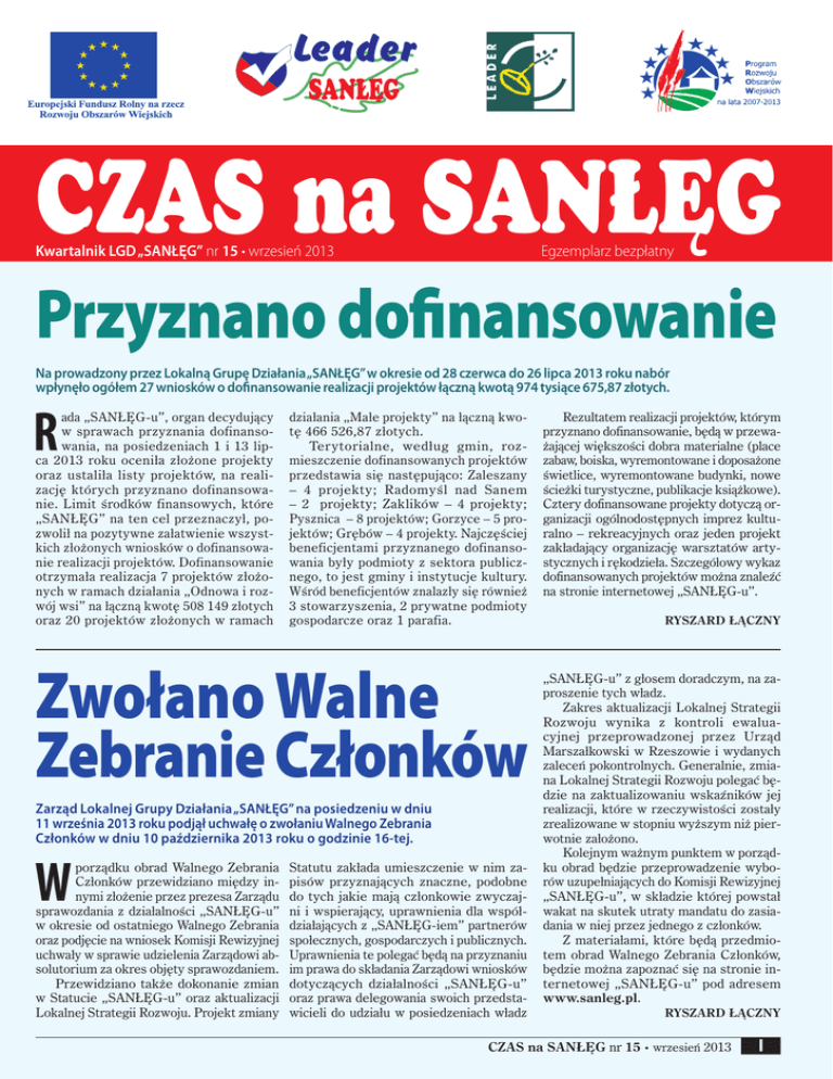 CZAS na SANŁĘG Kwartalnik LGD „SANŁĘG” nr 15 • wrzesień 2013 Egzemplarz bezpłatny Przyznano dofinansowanie Na prowadzony przez Lokalną Grupę Działania „SANŁĘG” w okresie od 28 czerwca do 26 lipca 2013 roku nabór wpłynęło ogółem 27 wniosków o dofinansowanie realizacji projektów łączną kwotą 974 tysiące 675,87 złotych. R ada „SANŁĘG-u”, organ decydujący w sprawach przyznania dofinansowania, na posiedzeniach 1 i 13 lipca 2013 roku oceniła złożone projekty oraz ustaliła listy projektów, na realizację których przyznano dofinansowanie. Limit środków finansowych, które „SANŁĘG” na ten cel przeznaczył, pozwolił na pozytywne załatwienie wszystkich złożonych wniosków o dofinansowanie realizacji projektów. Dofinansowanie otrzymała realizacja 7 projektów złożonych w ramach działania „Odnowa i rozwój wsi” na łączną kwotę 508 149 złotych oraz 20 projektów złożonych w ramach działania „Małe projekty” na łączną kwotę 466 526,87 złotych. Terytorialne, według gmin, rozmieszczenie dofinansowanych projektów przedstawia się następująco: Zaleszany – 4 projekty; Radomyśl nad Sanem – 2 projekty; Zaklików – 4 projekty; Pysznica – 8 projektów; Gorzyce – 5 projektów; Grębów – 4 projekty. Najczęściej beneficjentami przyznanego dofinansowania były podmioty z sektora publicznego, to jest gminy i instytucje kultury. Wśród beneficjentów znalazły się również 3 stowarzyszenia, 2 prywatne podmioty gospodarcze oraz 1 parafia. Zwołano Walne Zebranie Członków Zarząd Lokalnej Grupy Działania „SANŁĘG” na posiedzeniu w dniu 11 września 2013 roku podjął uchwałę o zwołaniu Walnego Zebrania Członków w dniu 10 października 2013 roku o godzinie 16-tej. W porządku obrad Walnego Zebrania Członków przewidziano między innymi złożenie przez prezesa Zarządu sprawozdania z działalności „SANŁĘG-u” w okresie od ostatniego Walnego Zebrania oraz podjęcie na wniosek Komisji Rewizyjnej uchwały w sprawie udzielenia Zarządowi absolutorium za okres objęty sprawozdaniem. Przewidziano także dokonanie zmian w Statucie „SANŁĘG-u” oraz aktualizacji Lokalnej Strategii Rozwoju. Projekt zmiany Statutu zakłada umieszczenie w nim zapisów przyznających znaczne, podobne do tych jakie mają członkowie zwyczajni i wspierający, uprawnienia dla współdziałających z „SANŁĘG-iem” partnerów społecznych, gospodarczych i publicznych. Uprawnienia te polegać będą na przyznaniu im prawa do składania Zarządowi wniosków dotyczących działalności „SANŁĘG-u” oraz prawa delegowania swoich przedstawicieli do udziału w posiedzeniach władz Rezultatem realizacji projektów, którym przyznano dofinansowanie, będą w przeważającej większości dobra materialne (place zabaw, boiska, wyremontowane i doposażone świetlice, wyremontowane budynki, nowe ścieżki turystyczne, publikacje książkowe). Cztery dofinansowane projekty dotyczą organizacji ogólnodostępnych imprez kulturalno – rekreacyjnych oraz jeden projekt zakładający organizację warsztatów artystycznych i rękodzieła. Szczegółowy wykaz dofinansowanych projektów można znaleźć na stronie internetowej „SANŁĘG-u”. RYSZARD ŁĄCZNY „SANŁĘG-u” z głosem doradczym, na zaproszenie tych władz. Zakres aktualizacji Lokalnej Strategii Rozwoju wynika z kontroli ewaluacyjnej przeprowadzonej przez Urząd Marszałkowski w Rzeszowie i wydanych zaleceń pokontrolnych. Generalnie, zmiana Lokalnej Strategii Rozwoju polegać będzie na zaktualizowaniu wskaźników jej realizacji, które w rzeczywistości zostały zrealizowane w stopniu wyższym niż pierwotnie założono. Kolejnym ważnym punktem w porządku obrad będzie przeprowadzenie wyborów uzupełniających do Komisji Rewizyjnej „SANŁĘG-u”, w składzie której powstał wakat na skutek utraty mandatu do zasiadania w niej przez jednego z członków. Z materiałami, które będą przedmiotem obrad Walnego Zebrania Członków, będzie można zapoznać się na stronie internetowej „SANŁĘG-u” pod adresem www.sanleg.pl. RYSZARD ŁĄCZNY CZAS na SANŁĘG nr 15 • wrzesień 2013 I Tak dla LGD Z MARIANEM GRZEGORZKIEM, wójtem gminy Gorzyce, rozmawia PIOTR JACKOWSKI Kilkuletnie funkcjonowanie Lo kalnej Grupy Działania „SANŁĘG” skłania do podsumowań w zakresie dotychczas przebytej drogi w ramach zawiązanego partnerstwa. Czy z dzi siejszej perspektywy może Pan stwier dzić, że przystąpienie Gminy Gorzyce do LGD było właściwym i potrzebnym krokiem? Gmina Gorzyce przystąpiła do LGD „SANŁĘG” w marcu 2008 roku. Pamiętam dyskusję na sesji Rady Gminy, pamiętam wątpliwości i obawy radnych i to, jak musiałem przekonywać Radę Gminy do podjęcia uchwały o przystąpieniu do LGD. Dzisiaj już nikt tego nie pamięta i sprawą oczywistą wydaje się być fakt przynależności naszej Gminy do tego stowarzyszenia oraz oczywistymi stają się dla wielu osób informacje o realizowanych projektach, pozyskanych pieniądzach... Tak, jakby się to wszystko nam należało. Tak jednak przecież nie jest. Każdy pozytywny element czy sukces w działalności LGD to duży wysiłek władz samego stowarzyszenia, ale istotnie wsparty aktywnością mieszkańców naszej gminy, stowarzyszeń oraz pracowników Urzędu Gminy. Czy, zostając członkiem „SANŁĘG-u”, Gmina stawiała sobie jakieś szczególne cele i zadania? Wtedy dysponowaliśmy wiedzą ogólną o zasadach i celach funkcjonowania lokalnych grup działania, znaliśmy potencjalny budżet – kwotę środków możliwą do pozyskania do roku 2015 (2013 + 2). W odniesieniu do Gminy Gorzyce było około 1,6 mln zł do pozyskania na różne przedsięwzięcia zgodne z Lokalną Strategią Rozwoju oraz właściwymi przepisami dotyczącymi zasad wspierania rozwoju obszarów wiejskich. Cele szczególne, jakie wtedy sobie stawialiśmy, dotyczyły dokonywania zmian w tzw. przestrzeni publicznej – popr