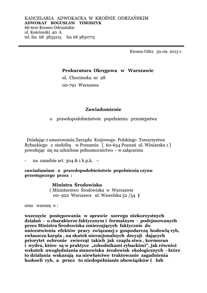 KANCELARIA ADWOKACKA W KROŚNIE ODRZAŃSKIM ADWOKAT BOGUSŁAW TIMOSZYK 66-600 Krosno Odrzańskie ul. Kościuszki 40 A tel. fax 68 3835215 fax 68 3830775 Krosno Odrz. 30.09. 2013 r. Prokuratura Okręgowa w Warszawie ul. Chocimska nr 28 00-791 Warszawa Zawiadomienie o prawdopodobieństwie popełnienia przestępstwa Działając z umocowania Zarządu Krajowego Polskiego Towarzystwa Rybackiego z siedzibą w Poznaniu [ 60-654 Poznań ul. Winiarska 1 ] powołując się na udzielone pełnomocnictwo – w załączeniu - na zasadzie art. 304 & 1 k.p.k. – zawiadamiam o prawdopodobieństwie popełnienia czynu przestępczego przez : Ministra Środowiska ( Ministerstwo Środowiska w Warszawie 00- 922 Warszawa ul. Wawelska 52 /54 ) oraz wnoszę o : wszczęcie postępowania w sprawie szeregu niekorzystnych działań - o charakterze faktycznym i formalnym - podejmowanych przez Ministra Środowiska zmierzających faktycznie do unicestwienia efektów pracy związanej z gospodarczą hodowlą ryb, zwłaszcza karpia , na skutek nieracjonalnych decyzji dających priorytet ochronie zwierząt takich jak czapla siwa , kormoran i wydra, które są w praktyce „szkodnikami rybackimi”, jak również wskutek uwzględniania stanowiska środowisk ekologicznych - które to działania wskazują na niewłaściwe traktowanie zagadnienia hodowli ryb, a przez to niedopełnianie obowiązków ( lub /2 / przekroczenie uprawnień ) w tym zakresie - determinujących powodowanie zniszczeń w świecie zwierząt ( ryb hodowlanych ) w znacznym rozmiarze, oraz narażenie podmiotów instytucjonalnych i osób fizycznych wykonujących działalność zarobkową związaną z procesem hodowli ryb na niekorzystne skutki w szczególności w postaci niemożności lub istotnych utrudnień w realizowania zobowiązań finansowych ( w tym na rzecz zatrudnianych pracowników ). Uzasadnienie Ministerstwo Środowiska, kierowane przez naczelny organ administracji – Ministra Środowiska - wykonuje zadania w zakresie szeroko rozumianej ochrony środowiska naturalnego. W naszym kraju kwestie związane z obowiązkiem ochrony środowiska reguluje ustawa z dnia 27 kwietnia 2001 r. Prawo ochrony środowiska (Dz. U. z 2008 r. Nr 25, poz. 150, z późn. zm. ) Właściwy podmiot do realizowania zadań w tym zakresie wskazany jest przez Konstytucję RP. W świetle wiedzy encyklopedycznej ochrona środowiska to całokształt działań ( także zaniechanie działań) mających na celu właściwe wykorzystanie oraz odnawianie zasobów i składników środowiska naturalnego, zarówno jego składników abiotycznych, jak i żywych (ochrona przyrody). Sposobami ochrony środowiska - w ujęciu naukowym i teoretycznym są w szczególności : - racjonalne kształtowanie środowiska i gospodarowanie zasobami środowiska zgodnie z zasadą zrównoważonego rozwoju, - przeciwdziałanie zanieczyszczeniom, - utrzymywanie i przywracanie elementów przyrodniczych do stanu właściwego. Takie zadania i powinności spoczywają na Ministrze Środowiska. Minister Środowiska powinien zatem poprzez współtworzenie polityki państwa, troszczyć się o środowisko w Polsce oraz wpływać na długofalowy, realizowany z poszanowaniem przyrody i praw człowieka rozwój kraju tak, aby uwzględnić potrzeby zarówno współcześnie żyjących ludzi, jak i przyszłych pokoleń. Jest logicznym i zdroworozsądkowym poglądem – oczekiwanie , iż takie podejście odnosić się powinno do wszystkich dziedzin i podmiotów związanych z funkcjonowaniem w obrębie szeroko rozumianego środowiska naturalnego /3 / Ministrowi Środowiska do realizacji powyższych zadań służy profesjonalny urząd jakim jest Ministerstwo Środowiska. Oficjalna witryna tego organu na stronach internetowych podaje , że : ... Ministerstwo jest nowoczesną, profesjonalną, darzoną zaufaniem społecznym instytucją, racjonalnie zarządzającą zasobami naturalnymi, dbającą o edukację ekologiczną społeczeństwa oraz otwartą na współpracę w zakresie ochrony środowiska. Takie postrzeganie swojej roli obliguje i nakazuje zrównoważone podejście do wszystkich elementów środowiska , a nie tylko do niektórych , czyli w sposób selektywny. Takie postrzegania pozwala zasadnie oczekiwać ze wszech miar profesjonalnego działania oraz równego traktowania wszelkich podmiotów związanych z działalnością w obrębie środowiska naturalnego. W przekonaniu Polskiego Towarzystwa Rybackiego środowisko rybackie jest utrwalonym , tradycyjnym i – jak się wydaje - ważnym ogniwem funkcjonującym na niwie środowiska naturalnego. Niestety – w przekonaniu zawiadamiającego - werbalne stwierdzenia misji Ministra Środowiska jak wyżej zacytowane - nie mają odzwierciedlenia w rzeczywistości. Na podstawie doświadczeń członków Polskiego Towarzystwa Rybackiego podmiotów instytucjonalnych i wielu osób fizycznych zajmujących się lub związanych z profesjonalną hodowlą ryb zwłaszcza z ostatnich lat - można wywieść zasadny wniosek, że Minister Środowiska w ostatnim okresie większą uwagę przywiązuje do wybranych przez siebie – irracjonalnie i doraźnie, a przy tym selektywnie - elementów środowiska i to takich , które je degradują, a nie wzbogacają. Tak bowiem należy określić fakt , że większą uwagę Minister Środowiska przywiązuje do ochrony szkodników degradujących i niszczących hodowlę ryb - takich jak czapla siwa , kormoran i wydra – niż do ryb hodowlanych , będących ważnym elementem polskiego rynku spożywczego. Tak również należy odnieść dostrzeganą politykę Ministra Środowiska , który popiera działania różnych zorganizowanych grup „ekologów”, zawiązujących rozmaite stowarzyszenia w imię propagowania idei i haseł – sprzecznych z polską tradycją i dobrze rozumianym tzw. „dobrostanem” ryb hodowlanych. Przyjmuje się , że dobrostan to stan zdrowia zwierząt , zarówno fizyczny , jak /4/ i psychiczny, osiągany przez ich stan harmonii ze środ