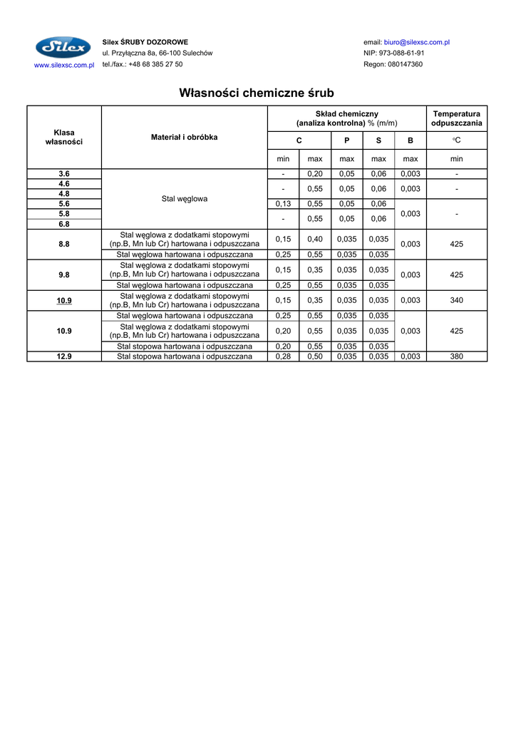 www.silexsc.com.pl Silex ŚRUBY DOZOROWE email: [email protected] ul. Przyłączna 8a, 66-100 Sulechów NIP: 973-088-61-91 tel./fax.: +48 68 385 27 50 Regon: 080147360 Własności chemiczne śrub Skład chemiczny (analiza kontrolna) % (m/m) Klasa własności 3.6 4.6 4.8 5.6 5.8 6.8 8.8 9.8 10.9 10.9 12.9 Materiał i obróbka Stal węglowa Stal węglowa z dodatkami stopowymi (np.B, Mn lub Cr) hartowana i odpuszczana Stal węglowa hartowana i odpuszczana Stal węglowa z dodatkami stopowymi (np.B, Mn lub Cr) hartowana i odpuszczana Stal węglowa hartowana i odpuszczana Stal węglowa z dodatkami stopowymi (np.B, Mn lub Cr) hartowana i odpuszczana Stal węglowa hartowana i odpuszczana Stal węglowa z dodatkami stopowymi (np.B, Mn lub Cr) hartowana i odpuszczana Stal stopowa hartowana i odpuszczana Stal stopowa hartowana i odpuszczana C Temperatura odpuszczania P S B C o min max max max max min - 0,20 0,05 0,06 0,003 - - 0,55 0,05 0,06 0,003 - 0,13 0,55 0,05 0,06 - 0,55 0,05 0,06 0,003 - 0,15 0,40 0,035 0,035 0,003 425 0,25 0,55 0,035 0,035 0,15 0,35 0,035 0,035 0,003 425 0,25 0,55 0,035 0,035 0,15 0,35 0,035 0,035 0,003 340 0,25 0,55 0,035 0,035 0,20 0,55 0,035 0,035 0,003 425 0,20 0,28 0,55 0,50 0,035 0,035 0,035 0,035 0,003 380