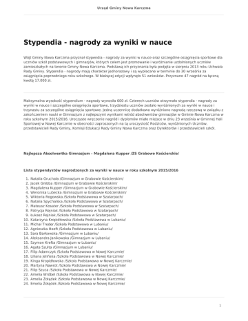 Urząd Gminy Nowa Karczma Stypendia - nagrody za wyniki w nauce Wójt Gminy Nowa Karczma przyznał stypendia - nagrody za wyniki w nauce oraz szczególne osiągnięcia sportowe dla uczniów szkół podstawowych i gimnazjów, których celem jest promowanie i wyróżnianie uzdolnionych uczniów zamieszkałych na terenie Gminy Nowa Karczma. Podstawą ich przyznania była podjęta w sierpniu 2013 roku Uchwała Rady Gminy. Stypendia - nagrody mają charakter jednorazowy i są wypłacane w terminie do 30 września za osiągnięcia poprzedniego roku szkolnego. W bieżącej edycji wpłynęło 51 wniosków. Przyznano 47 nagród na łączną kwotę 17.000 zł. Maksymalna wysokość stypendium - nagrody wynosiła 600 zł. Czterech uczniów otrzymało stypendia - nagrody za wyniki w nauce i szczególne osiągnięcia sportowe, trzydziestu uczniów zostało wyróżnionych za wyniki w nauce i trzynastu za szczególne osiągnięcia sportowe. Jedną uczennicę dodatkowo wyróżniono nagrodą rzeczową w związku z zakończeniem nauki w Gimnazjum z najlepszymi wynikami wśród absolwentów gimnazjów w Gminie Nowa Karczma w roku szkolnym 2015/2016. Uroczyste wręczenie nagród i dyplomów miało miejsce w dniu 23 września w Gminnej Hali Sportowej w Nowej Karczmie w obecności zaproszonych na tą uroczystość Rodziców, wyróżnionych Uczniów, przedstawicieli Rady Gminy, Komisji Edukacji Rady Gminy Nowa Karczma oraz Dyrektorów i przedstawicieli szkół. Najlepsza Absolwentka Gimnazjum – Magdalena Kupper /ZS Grabowo Kościerskie/ Lista stypendystów nagrodzonych za wyniki w nauce w roku szkolnym 2015/2016 1. 2. 3. 4. 5. 6. 7. 8. 9. 10. 11. 12. 13. 14. 15. 16. 17. 18. 19. 20. 21. 22. 23. 24. Natalia Gruchała /Gimnazjum w Grabowie Kościerskim/ Jacek Gnibba /Gimnazjum w Grabowie Kościerskim/ Magdalena Kupper /Gimnazjum w Grabowie Kościerskim/ Weronika Lubecka /Gimnazjum w Grabowie Kościerskim/ Wiktoria Rogowska /Szkoła Podstawowa w Szatarpach/ Natalia Spychalska /Szkoła Podstawowa w Szatarpach/ Mateusz Kosater /Szkoła Podstawowa w Szatarpach/ Patrycja Rejniak /Szkoła Podstawowa w Szatarpach/ Łukasz Rejniak /Szkoła Podstawowa w Szatarpach/ Katarzyna Kropidłowska /Szkoła Podstawowa w Lubaniu/ Michał Treder /Szkoła Podstawowa w Lubaniu/ Agnieszka Hoeft /Szkoła Podstawowa w Lubaniu/ Sara Barkowska /Gimnazjum w Lubaniu/ Aleksandra Janikowska /Gimnazjum w Lubaniu/ Szymon Krefta /Gimnazjum w Lubaniu/ Agata Szulta /Gimnazjum w Lubaniu/ Filip Adamczyk /Szkoła Podstawowa w Nowej Karczmie/ Liliana Jelińska /Szkoła Podstawowa w Nowej Karczmie/ Kinga Kropidłowska /Szkoła Podstawowa w Nowej Karczmie/ Martyna Nawrot /Szkoła Podstawowa w Nowej Karczmie/ Filip Szuca /Szkoła Podstawowa w Nowej Karczmie/ Amelia Wróbel /Szkoła Podstawowa w Nowej Karczmie/ Amelia Żołądek /Szkoła Podstawowa w Nowej Karczmie/ Emelia Żołądek /Szkoła Podstawowa w Nowej Karczmie/ 1 Urząd Gminy Nowa Karczma 25. 26. 27. 28. 29. 30. Michał Barton /Gimnazjum w Nowej Karczmie/ Martyna Bulczak /Gimnazjum w Nowej Karczmie/ Maria Jakusz /Gimnazjum w Nowej Karczmie/ Mateusz Kowalewski /Gimnazjum w Nowej Karczmie/ Julia Pałkowska /Gimnazjum w Nowej Karczmie/ Paulina Trzebiatowska /Gimnazjum w Nowej Karczmie/ Lista stypendystów nagrodzonych za wyniki w nauce i osiągnięcia sportowe w roku szkolnym 2015/2016 1. 2. 3. 4. Paweł Burczyk /Szkoła Podstawowa w Nowej Karczmie/ Piotr Burczyk /Szkoła Podstawowa w Nowej Karczmie/ Kacper Lipiński /Szkoła Podstawowa w Nowej Karczmie/ Michał Myszka /Gimnazjum w Nowej Karczmie - Laureat Wojewódzkiego Konkursu Historycznego/ Lista stypendystów nagrodzonych za wyniki w nauce i osiągnięcia sportowe w roku szkolnym 2015/2016 1. 2. 3. 4. 5. 6. 7. 8. 9. 10. 11. 12. 13. Jan Gromowski /Szkoła Podstawowa w Nowej Karczmie/ Mikołaj Korda /Szkoła Podstawowa w Nowej Karczmie/ Mateusz Myszka /Szkoła Podstawowa w Nowej Karczmie/ Kacper Romski /Szkoła Podstawowa w Nowej Karczmie/ Dawid Rymon-Lipiński /Szkoła Podstawowa w Nowej Karczmie/ Sebastian Wydrowski /Szkoła Podstawowa w Nowej Karczmie/ Mateusz Mering /Szkoła Podstawowa w Nowej Karczmie/ Hubert Klimczak /Szkoła Podstawowa w Nowej Karczmie/ Wiktor Smuczyński /Gimnazjum w Nowej Karczmie/ Kacper Parszewski /Gimnazjum w Nowej Karczmie/ Mateusz Jach /Gimnazjum w Nowej Karczmie/ Witold Bieliński /Gimnazjum w Nowej Karczmie/ Miłosz Guse / III Liceum Ogólnokształcące z Oddziałami Dwujęzycznymi im. Marynarki Wojennej w Gdyni – III miejsce w Mistrzostwach Polski Juniorów Młodszych w Piłce Ręcznej/ 2