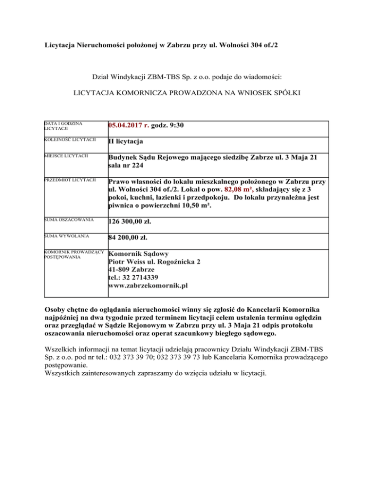 Licytacja Nieruchomości położonej w Zabrzu przy ul. Wolności 304 of./2 Dział Windykacji ZBM-TBS Sp. z o.o. podaje do wiadomości: LICYTACJA KOMORNICZA PROWADZONA NA WNIOSEK SPÓŁKI DATA I GODZINA LICYTACJI 05.04.2017 r. godz. 9:30 KOLEJNOŚĆ LICYTACJI II licytacja MIEJSCE LICYTACJI Budynek Sądu Rejowego mającego siedzibę Zabrze ul. 3 Maja 21 sala nr 224 PRZEDMIOT LICYTACJI Prawo własności do lokalu mieszkalnego położonego w Zabrzu przy ul. Wolności 304 of./2. Lokal o pow. 82,08 m², składający się z 3 pokoi, kuchni, łazienki i przedpokoju. Do lokalu przynależna jest piwnica o powierzchni 10,50 m². SUMA OSZACOWANIA 126 300,00 zł. SUMA WYWOŁANIA 84 200,00 zł. KOMORNIK PROWADZĄCY POSTĘPOWANIA Komornik Sądowy Piotr Weiss ul. Rogoźnicka 2 41-809 Zabrze tel.: 32 2714339 www.zabrzekomornik.pl Osoby chętne do oglądania nieruchomości winny się zgłosić do Kancelarii Komornika najpóźniej na dwa tygodnie przed terminem licytacji celem ustalenia terminu oględzin oraz przeglądać w Sądzie Rejonowym w Zabrzu przy ul. 3 Maja 21 odpis protokołu oszacowania nieruchomości oraz operat szacunkowy biegłego sądowego. Wszelkich informacji na temat licytacji udzielają pracownicy Działu Windykacji ZBM-TBS Sp. z o.o. pod nr tel.: 032 373 39 70; 032 373 39 73 lub Kancelaria Komornika prowadzącego postępowanie. Wszystkich zainteresowanych zapraszamy do wzięcia udziału w licytacji.