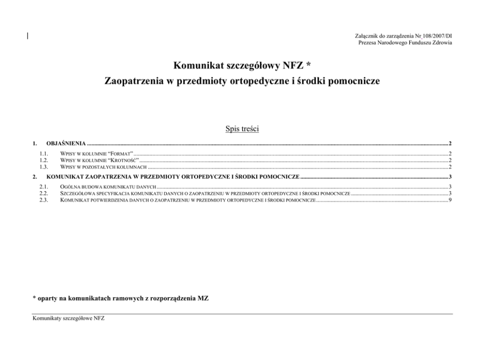 SZCZEGÓŁOWA SPECYFIKACJA KOMUNIKATU DANYCH O ZAOPATRZENIU W PRZEDMIOTY ORTOPEDYCZNE I ŚRODKI POMOCNICZE ................................................................... 3