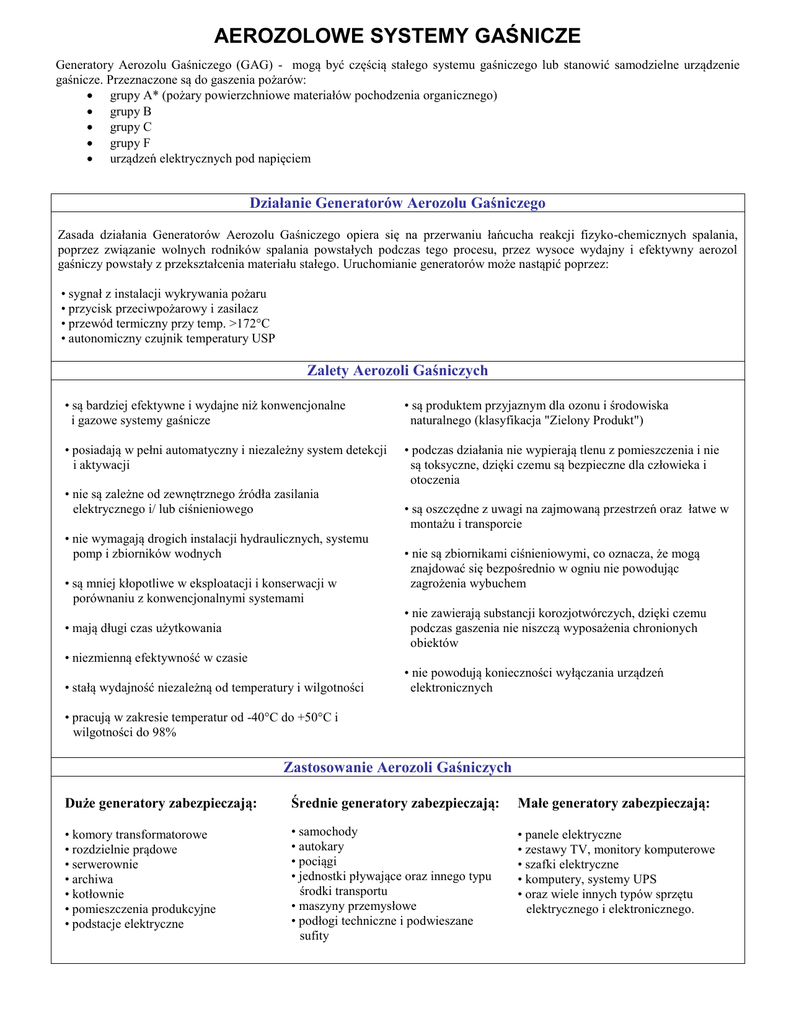 AEROZOLOWE SYSTEMY GAŚNICZE Generatory Aerozolu Gaśniczego (GAG) - mogą być częścią stałego systemu gaśniczego lub stanowić samodzielne urządzenie gaśnicze. Przeznaczone są do gaszenia pożarów: grupy A* (pożary powierzchniowe materiałów pochodzenia organicznego) grupy B grupy C grupy F urządzeń elektrycznych pod napięciem Działanie Generatorów Aerozolu Gaśniczego Zasada działania Generatorów Aerozolu Gaśniczego opiera się na przerwaniu łańcucha reakcji fizyko-chemicznych spalania, poprzez związanie wolnych rodników spalania powstałych podczas tego procesu, przez wysoce wydajny i efektywny aerozol gaśniczy powstały z przekształcenia materiału stałego. Uruchomianie generatorów może nastąpić poprzez: • sygnał z instalacji wykrywania pożaru • przycisk przeciwpożarowy i zasilacz • przewód termiczny przy temp. >172°C • autonomiczny czujnik temperatury USP Zalety Aerozoli Gaśniczych • są bardziej efektywne i wydajne niż konwencjonalne i gazowe systemy gaśnicze • są produktem przyjaznym dla ozonu i środowiska naturalnego (klasyfikacja "Zielony Produkt") • posiadają w pełni automatyczny i niezależny system detekcji i aktywacji • podczas działania nie wypierają tlenu z pomieszczenia i nie są toksyczne, dzięki czemu są bezpieczne dla człowieka i otoczenia • nie są zależne od zewnętrznego źródła zasilania elektrycznego i/ lub ciśnieniowego • nie wymagają drogich instalacji hydraulicznych, systemu pomp i zbiorników wodnych • są mniej kłopotliwe w eksploatacji i konserwacji w porównaniu z konwencjonalnymi systemami • są oszczędne z uwagi na zajmowaną przestrzeń oraz łatwe w montażu i transporcie • nie są zbiornikami ciśnieniowymi, co oznacza, że mogą znajdować się bezpośrednio w ogniu nie powodując zagrożenia wybuchem • nie zawierają substancji korozjotwórczych, dzięki czemu podczas gaszenia nie niszczą wyposażenia chronionych obiektów • mają długi czas użytkowania • niezmienną efektywność w czasie • stałą wydajność niezależną od temperatury i wilgotności • nie powodują konieczności wyłączania urządzeń elektronicznych • pracują w zakresie temperatur od -40°C do +50°C i wilgotności do 98% Zastosowanie Aerozoli Gaśniczych Duże generatory zabezpieczają: Średnie generatory zabezpieczają: Małe generatory zabezpieczają: • komory transformatorowe • rozdzielnie prądowe • serwerownie • archiwa • kotłownie • pomieszczenia produkcyjne • podstacje elektryczne • samochody • autokary • pociągi • jednostki pływające oraz innego typu środki transportu • maszyny przemysłowe • podłogi techniczne i podwieszane sufity • panele elektryczne • zestawy TV, monitory komputerowe • szafki elektryczne • komputery, systemy UPS • oraz wiele innych typów sprzętu elektrycznego i elektronicznego.