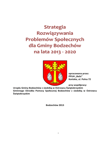 Strategia Rozwiązywania Problemów Społecznych dla Gminy Bodzechów na lata 2013 - 2020 opracowana przez: PPUH „BaSz” Końskie, ul. Polna 72 przy współpracy: Urzędu Gminy Bodzechów z siedzibą w Ostrowcu Świętokrzyskim Gminnego Ośrodka Pomocy Społecznej Bodzechów z siedzibą w Ostrowcu Świętokrzyskim Bodzechów 2013 1 Strategia Rozwiązywania Problemów Społecznych w Gminie Bodzechów na lata 2013-2020 ___________________________________________________________________________ SPIS TREŚCI 1. Informacje wstępne................................................................................................................ 3 1.1. Podstawa prawna systemu pomocy społecznej w Polsce .................................................. 3 1.2. Procedura przygotowania i uspołeczniania „Strategii Rozwiązywania Problemów Społecznych w Gminie Bodzechów na lata 2013-2020” ........................................................ 5 2. Charakterystyka gminy Bodzechów ....................................................................................... 7 2.1. Informacje ogólne o gminie ................................................................................................ 7 2.2. Sytuacja demograficzna gminy Bodzechów ........................................................................ 9 2.3. Infrastruktura społeczna na terenie gminy Bodzechów ................................................... 10 2.2. Infrastruktura techniczna gminy Bodzechów.................................................................... 15 3. Diagnoza problemów społecznych gminy Bodzechów ........................................................ 15 3.1. Obszary problemów społecznych objęte pomocą socjalną zgodnie z „Ustawą o pomocy społecznej” ........................................................................................................................ 15 3.1.1. Ubóstwo ......................................................................................................................... 16 3.1.2. Sieroctwo........................................................................................................................ 17 3.1.3. Bezdomność ................................................................................................................... 18 3.1.4. Bezrobocie ...................................................................................................................... 19 3.1.5. Niepełnosprawność ........................................................................................................ 23 3.1.6. Długotrwała lub ciężka choroba ..................................................................................... 25 3.1.7. Przemoc w rodzinie ........................................................................................................ 26 3.1.8. Ochrona macierzyństwa i wielodzietności ..................................................................... 28 3.1.9. Bezradność w sprawach opiekuńczo-wychowawczych i prowadzenia gospodarstwa domowego zwłaszcza w rodzinach niepełnych i wielodzietnych......................................... 29 3.1.10. Brak umiejętności w przystosowaniu do życia młodzieży opuszczającej placówki opiekuńczo-wychowawcze ................................................................................................... 30 3.1.11. Trudności w integracji osób posiadających status uchodźcy ....................................... 30 3.1.12. Trudności w przystosowaniu po opuszczeniu zakładów karnych ................................ 31 3.1.13. Alkoholizm i narkomania .............................................................................................. 31 3.1.14. Wystąpienie zdarzenia losowego, sytuacji kryzysowej, klęski żywiołowej lub ekologicznej ........................................................................................................................ 34 3.2. Pozostałe problemy społeczne występujące w gminie Bodzechów ................................. 34 3.2.1. Problemy dzieci i młodzieży ........................................................................................... 34 3.2.2. Problemy ludzi starszych ................................................................................................ 35 3.2.3. Problemy czasu wolnego i wypoczynku ......................................................................... 35 4. System pomocy społecznej w gminie Bodzechów ............................................................... 36 4.1. Działalność Gminnego Ośrodka Pomocy Społecznej ........................................................ 36 4.2. Współpraca Gminy z organizacjami pozarządowymi ........................................................ 40 4.3. Instytucje zajmujące się pomocą społeczną ..................................................................... 41 5. Wnioski z ankiet „Identyfikacja problemów społecznych w Gminie Bodzechów” .............. 44 6. Podsumowanie sytuacji społecznej w gminie i analiza SWOT ............................................. 46 7.Cele strategiczne pomocy społecznej zapisane w dokumentach wyższego rzędu ............... 48 8.Cel główny i cele pośrednie w zakresie rozwiązywania problemów społecznych na terenie gminy Bodzechów .................................................................................................................... 50 9. Kierunki działań na lata 2013-2020 ...................................................................................... 53 10. Wdrażanie, zarządzanie i monitoring realizacji strategii ................................................... 63 11. Potencjalne źródła finansowania ....................................................................................... 65 12. Wykaz materiałów źródłowych .......................................................................................... 65 2 Strat