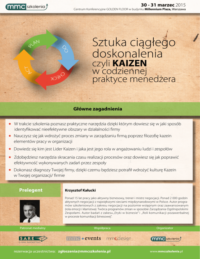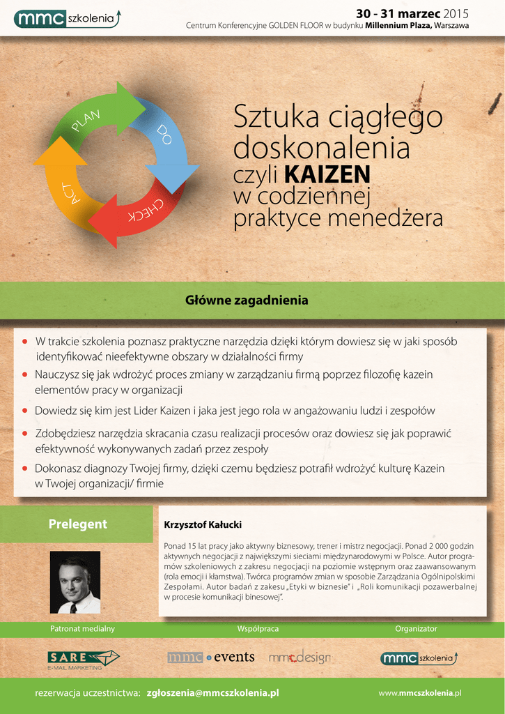 30 - 31 marzec 2015 Centrum Konferencyjne GOLDEN FLOOR w budynku Millennium Plaza, Warszawa Sztuka ciągłego doskonalenia czyli KAIZEN w codziennej praktyce menedżera Główne zagadnienia W trakcie szkolenia poznasz praktyczne narzędzia dzięki którym dowiesz się w jaki sposób identyfikować nieefektywne obszary w działalności firmy Nauczysz się jak wdrożyć proces zmiany w zarządzaniu firmą poprzez filozofię kazein elementów pracy w organizacji Dowiedz się kim jest Lider Kaizen i jaka jest jego rola w angażowaniu ludzi i zespołów Zdobędziesz narzędzia skracania czasu realizacji procesów oraz dowiesz się jak poprawić efektywność wykonywanych zadań przez zespoły Dokonasz diagnozy Twojej firmy, dzięki czemu będziesz potrafił wdrożyć kulturę Kazein w Twojej organizacji/ firmie Prelegent Krzysztof Kałucki Ponad 15 lat pracy jako aktywny biznesowy, trener i mistrz negocjacji. Ponad 2 000 godzin aktywnych negocjacji z największymi sieciami międzynarodowymi w Polsce. Autor programów szkoleniowych z zakresu negocjacji na poziomie wstępnym oraz zaawansowanym (rola emocji i kłamstwa). Twórca programów zmian w sposobie Zarządzania Ogólnipolskimi Zespołami. Autor badań z zakesu „Etyki w biznesie” i „Roli komunikacji pozawerbalnej w procesie komunikacji binesowej”. Patronat medialny Współpraca rezerwacja uczestnictwa: zgł[email protected] Organizator www.mmcszkolenia.pl 30 - 31 marzec 2015 Centrum Konferencyjne GOLDEN FLOOR w budynku Millennium Plaza, Warszawa Sztuka ciągłego doskonalenia czyli KAIZEN w codziennej praktyce menadżera Dzień 1 PROGRAM 9:00 – 9:30 Rejestracja i poranna kawa 9:00 - 10:30 Zarządzanie zmianą Psychologiczne aspekty wprowadzania zmiany – tworzenie warunków do wprowadzenia zmiany Efekt Hawthorne – rola komunikacji we wprowadzaniu zmian i zwiększaniu efektywności pracy Narzędzia i metody zwiększania jakości – 5S, diagram Ishikawy, podejście six sigma Typowe błędy i ryzyka wprowadzania zmiany 9:30 - 10:30 „Odchudzanie” zarządzania – w jaki sposób poznać czy potrzebuję wprowadzić zarządzanie w duchu kaizen? Podstawowe pojęcia lean management i lean manufacturing Geneza i istota kaizen w zarządzaniu Innowacje a proces kaizen – jak wprowadzać ewolucyjne zmiany, przynoszące szybkie i wymierne rezultaty? 10 zasad kaizen – fundamenty filozofii ciągłęgo doskonalenia 10:30 – 10:45 Przerwa kawowa 10:45 - 13:00 Opanowanie czasu Zasada Pareto, zasada Parkinsona, metody wyznaczania priorytetów i mierzenia efektywności pracy własnej Praca z graficznymi reprezentacjami zadań w czasie – wykresy Gantta Metoda PERT – ustalanie i obliczanie czasu pracy na poszczególnych etapach projektu Łańcuchy krytyczne – narzędzie kolejkowania zadań w projekcie 10:30 – 10:45 Przerwa kawowa 10:45 - 13:00 Usprawnianie procesów w duchu kaizen – rozpoznawanie i eliminowanie nieefektywnych elementów pracy Toyota Production System – japońskie metody zarządzania i „błędoodporność” Straty i rodzaje marnotrawstwa jak temu przeciwdziałać? Cykl Deminga – kontrola i eksperyment w zarządzaniu przez filozofię kaizen VSM – mapowanie strumienia wartości jako tworzenie wizualizacji cyklu pracy i produkcji 13:00 – 14:00 Przerwa na lunch 14:00 - 15:30 Kaizen case studies Electrolux – „odchudzanie” czasu produkcji, czyli dobre praktyki skracania czasu dostarczania produktu Kyly – „odchudzanie” zasobów, czyli dobre praktyki ograniczania zużycia zasobów KOMMASH – „odchudzanie” kosztów, czyli dobre praktyki racjonalizacji wydatków Unilever – „odchudzanie” procesów, czyli dobre praktyki w przekształcaniu procesu produkcji 13:00 – 14:00 Przerwa na lunch 14:00 - 15:30 Kreatywność w pracy zespołowej Czynniki sprzyjające pracy zespołowej Bariery myślenia kreatywnego Metody wspomagające kreatywność – metoda de Bono, metoda Disneya Gra – wieża – praktyczne rozpoznawanie przeszkód w odnajdywaniu kreatywnych rozwiązań w pracy zespołowej 15:30 Dzień 2 15:30 Zakończenie drugiego dnia szkolenia oraz wręczenie certyfikatów Zakończenie pierwszego dnia szkolenia Patronat medialny Współpraca rezerwacja uczestnictwa: zgł[email protected] Organizator www.mmcszkolenia.pl 30 - 31 marzec 2015 Centrum Konferencyjne GOLDEN FLOOR w budynku Millennium Plaza, Warszawa Sztuka ciągłego doskonalenia czyli KAIZEN w codziennej praktyce menadżera Metody szkoleniowe Dlaczego warto wziąć udział w szkoleniu Case study z biznesu Poznasz metodę KAIZEN od podstaw Praktyczne rozwiązania metodyki KAIZEN Dowiesz się jak wykorzystać KAIZEN do maksymalizacji zysków w firmie Gry szkoleniowe Praca indywidualna Nauczysz sie rozpoznawać warotści dodatne i stratne w firmie Praca w parach Organizator Nauczysz się wprowadzać standardy w firmie przez zarządzanie zespołami, delegowanie zadań, dysponowanie czasem pracy MMC Szkolenia to marka wchodząca w skład Grupy MMC, która została powołana aby w specjalistyczny sposób zadbać o podniesienie kwalifikacji personalnych i umiejętności osobistych członków zespołów, tak aby zdobyta wiedza przełożyła się na wzrost efektywności jednostki w firmie oraz wzrost pozycji organizacji w mikrootoczeniu. Oferta skierowana jest do firm, które podnoszą rozwój kadry pracowniczej i mają świadomość, że to ludzie tworzą firmę i poprawa ich umiejętności przenosi się na pozytywne efekty całej organizacji. Na ofertę składają się pojedyncze szkolenia ukierunkowane na rozwój umiejętności miękkich, jak i również kompleksowe pakiety szkoleń, w których Uczestnik przechodzi przez cały proces kształcenia, zaczynając od budowania samoświadomości,a skończywszy na rozwoju umiejętności zawodowych związanych 30 - 31zarządzania marzeczespołem. 2015 z poprawą kompetencji Dowiesz się jakich technik użyć, by skutecznie zarządzać sobą w czasie, ustalać priorytety, cele pracy Grupa docelowa 
