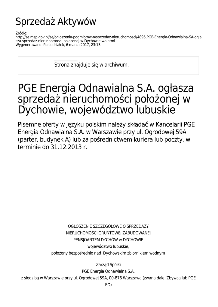Sprzedaż Aktywów Źródło: http://se.msp.gov.pl/se/ogloszenia-podmiotow-n/sprzedaz-nieruchomosci/4895,PGE-Energia-Odnawialna-SA-ogla sza-sprzedaz-nieruchomosci-polozonej-w-Dychowie-wo.html Wygenerowano: Poniedziałek, 6 marca 2017, 23:13 Strona znajduje się w archiwum. PGE Energia Odnawialna S.A. ogłasza sprzedaż nieruchomości położonej w Dychowie, województwo lubuskie Pisemne oferty w języku polskim należy składać w Kancelarii PGE Energia Odnawialna S.A. w Warszawie przy ul. Ogrodowej 59A (parter, budynek A) lub za pośrednictwem kuriera lub poczty, w terminie do 31.12.2013 r. OGŁOSZENIE SZCZEGÓŁOWE O SPRZEDAŻY NIERUCHOMOŚCI GRUNTOWEJ ZABUDOWANEJ PENSJOANTEM DYCHÓW w DYCHOWIE województwo lubuskie, położony bezpośrednio nad Dychowskim zbiornikiem wodnym Zarząd Spółki PGE Energia Odnawialna S.A. z siedzibą w Warszawie przy ul. Ogrodowej 59A, 00-876 Warszawa (zwana dalej Zbywcą lub PGE EO) ZAPRASZA do zapoznania się z przedmiotową nieruchomością i składania pisemnych ofert I. Opis nieruchomości. Nieruchomość objęta jest wieczystym prawem użytkowanie do 5 grudnia 2089 roku. Grunt przeznaczony do sprzedaży składa się z dwóch działek ewidencyjnych o łącznej powierzchni 19.498 m2. Powierzchnia zabudowy to 1.520 m2 a łączna powierzchnia użytkowa wszystkich zabudowań to 3.082,66 m2. Bezpośrednie sąsiedztwo nieruchomości stanowi od zachodu Dychowski zbiornik wodny oraz pas techniczny dostępu do zbiornika, od północnego i południowego wschodu las. Na północ od nieruchomości znajduje się zabudowa mieszkaniowa wielorodzinna oraz zabudowania wsi Dychów. Zabudowa Pensjonatu Dychów znajduje się na ogrodzonej części jednej z działek, dodatkowo poza ogrodzeniem część tej samej działki zabudowana jest kolektorami słonecznymi, z których energia jest wykorzystywana na potrzeby obiektu. W skład zabudowań wchodzą: hotel, pawilon hotelowy, budynek basenu, wolnostojący budynek gospodarczy z garażami oraz budowle sportowo - rekreacyjne. Dla gości przygotowanych jest 71 miejsc noclegowych w 38 pokojach o zróżnicowanym standardzie w tym 9 pokoi z łazienkami, 24 pokoje z łazienkami i klimatyzacją oraz 5 pokoi bez łazienek. Na terenie nieruchomości znajduje się sala restauracyjna, sala konferencyjna, korty tenisowe, pole do mini golfa, basen, małe centrum fitness wraz z sauna i solarium oraz salą do ćwiczeń. Obiekt jest przystosowany do organizacji konferencji i uroczystości zamkniętych. Przed głównymi budynkami znajduje się wybrukowany podjazd i parking. Budynek hotelowy i połączony z nim pawilon hotelowy to budynki trzykondygnacyjne, całkowicie podpiwniczone. W starszej części w piwnicy znajdują się pomieszczenia gospodarcze oraz rozdzielnia elektryczne, natomiast na piętrze mieści się część restauracyjno - konferencyjna wraz z zapleczem socjalnym. W piwnicy pawilonu hotelowego zlokalizowana jest część rekreacyjna (sauna, siłownia, solarium, sala do ćwiczeń). Wejście do budynku basenowego zlokalizowane jest w łączniku. Pokoje gościnne znajdują się głównie w nowszej części obiektu oraz na piętrze w budynku hotelu. Stan techniczny budynków jest dobry - wykonano konieczne remonty i modernizacje. Prezentacja przedmiotowej nieruchomości została dołączona do niniejszego dokumentu. Minimalna cena nieruchomości wynosi 3.280.512,00 zł. Treść niniejszego ogłoszenia nie stanowi oferty handlowej w rozumieniu Kodeksu Cywilnego. I. Wizja lokalna Wszystkich zainteresowanych zapraszamy do oglądania nieruchomości w dni robocze po wcześniejszym uzgodnieniu telefonicznym. Kontakt w tej sprawie: Anna Smyk tel. 691 855 880 I. Termin, miejsce, tryb składania ofert oraz wymogi stawiane nadsyłanym ofertom A. Pisemne oferty w języku polskim należy składać w Kancelarii PGE Energia Odnawialna S.A. w Warszawie przy ul. Ogrodowej 59A (parter, budynek A) lub za pośrednictwem kuriera lub poczty, w terminie do 31.12.2013r., w zabezpieczonych kopertach z napisem: >> sprzedaż Pensjonatu Dychów - do otwarcia przez Komisję<< B. W postępowaniu mogą brać udział osoby fizyczne oraz osoby prawne, a także jednostki organizacyjne nie posiadające osobowości prawnej. C. Termin związania z ofertą powinien wynosić minimum 90 dni. D. Oferty pisemne składane w zamkniętych i opieczętowanych lub oznaczonych nazwiskiem składającego kopertach, zaopatrzone w podaną nazwę postępowania powinny ponadto zawierać: 1. firmę lub imię i nazwisko oraz adres oferenta, 2. datę sporządzenia oferty, 3. wskazanie nieruchomości, której oferta dotyczy, 4. ofertowaną cenę, 5. oznaczenie terminu związania ofertą, przy czym termin ten nie może być krótszy niż 90 dni; 6. oświadczenie o: a. zapoznaniu się i akceptacji stanu prawnego i faktycznego (technicznego) przedmiotu postępowania, w tym w szczególności z dokumentacją dotyczącą nieruchomości udostępnianą zgodnie z powszechnie obowiązującymi przepisami prawa przez sądy oraz organy administracji, b. zapoznaniu się i akceptacji informacji zawartych w Ogłoszeniu szczegółowym, c. akceptacji wszelkich warunków postępowania, w tym również w zakresie konieczności zatwierdzenia przez Zarząd PGE EO w formie uchwały wyników postępowania oraz uzależnienia zawarcia umowy z wybranym Oferentem od uzyskania przez PGE EO zgód korporacyjnych stosownych organów na zawarcie tej umowy, 7. podpis Oferenta lub osoby upoważnionej do składania w imieniu Oferenta oświadczeń woli w zakresie praw i obowiązków majątkowych, 8. odpis z właściwego rejestru lub ewidencji działalności gospodarczej oraz inne dokumenty, w tym pełnomocnictwo, jeżeli z wyżej wymienionych odpisów nie wynika umocowanie do podpisania oferty. II. Pozostałe informacje PGE Energia Odnawialna S.A. nie ponosi kosztów poniesionych przez podmioty zainteresowane nabyciem nieruchomości, w związku z ich uczestnictwem w postępowaniu w/s sprzedaży przedmiotowej nieruchomo