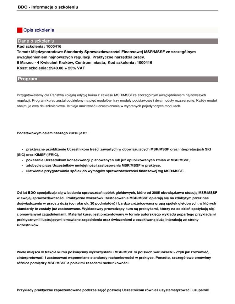 BDO - informacje o szkoleniu Opis szkolenia Dane o szkoleniu Kod szkolenia: 1000416 Temat: Międzynarodowe Standardy Sprawozdawczości Finansowej MSR/MSSF ze szczególnym uwzględnieniem najnowszych regulacji. Praktyczne narzędzia pracy. 6 Marzec - 4 Kwiecień Kraków, Centrum miasta, Kod szkolenia: 1000416 Koszt szkolenia: 2940.00 + 23% VAT Program Przygotowaliśmy dla Państwa kolejną edycję kursu z zakresu MSR/MSSFze szczególnym uwzględnieniem najnowszych regulacji. Program kursu został podzielony na pięć modułów- trzy moduły podstawowe i dwa moduły rozszerzone. Każdy moduł obejmuje dwa dni szkoleniowe. Istnieje możliwość uczestniczenia w wybranych pojedynczych modułach. Podstawowym celem naszego kursu jest: - praktyczne przybliżenie Uczestnikom treści zawartych w obowiązujących MSR/MSSF oraz interpretacjach SKI (SIC) oraz KIMSF (IFRIC), - pokazanie Uczestnikom konsekwencji planowanych lub już opublikowanych zmian w MSR/MSSF, - zdobycie przez Uczestników umiejętności zastosowania MSR/MSSF w praktyce, - ułatwienie przygotowania spółek do wymogów sprawozdawczości finansowej wg MSR/MSSF. Od lat BDO specjalizuje się w badaniu sprawozdań spółek giełdowych, które od 2005 obowiązkowo stosują MSR/MSSF w swojej sprawozdawczości. Praktyczne wskazówki zastosowania MSR/MSSF opierają się na zdobytym przez nas doświadczeniu w pracy z dużą (co roku ok. 30 podmiotów) i bardzo zróżnicowaną grupą spółek giełdowych, w których standardy te zostały już zastosowane. Wykładowcy prowadzący kurs są praktykami, którzy na co dzień spotykają się z omawianymi zagadnieniami. Materiał kursu jest prezentowany w formie autorskiego wykładu popartego przykładami praktycznymi ilustrującymi omawiane zagadnienia oraz ćwiczeniami z oczekiwaną dużą interakcją ze strony Uczestników. Wiele miejsca w trakcie kursu poświęcimy wykorzystaniu MSR/MSSF w polskich warunkach - czyli jak zrozumieć, zinterpretować i zastosować wspomniane standardy rachunkowości w praktyce. Ponadto, szczegółowo omówimy różnice pomiędzy MSR/MSSF a polskimi zasadami rachunkowości. Przykłady praktyczne zaprezentowane podczas zajęć pozwolą Uczestnikom również usystematyzować i uzupełnić BDO - informacje o szkoleniu wiedzę z zakresu MSR/MSSF. Ćwiczenia będą miały formę testów, zadań poświęconych poszczególnym MSR/MSSF, jak również ,,case studies". W trakcie całego kursu Uczestnicy będą mogli skonfrontować omawiane zagadnienia, w tym zakres wymaganych ujawnień, z przykładowym wzorcowym sprawozdaniem finansowym wg MSR/MSSF opracowanym przez ekspertów BDO. MODUŁY PODSTAWOWE: Moduł I - Sprawozdanie finansowe wg MSR/MSSF - zasady sporządzania i prezentacji: Głównym celem tego modułu jest przedstawienie Uczestnikom kursu zasad sporządzania i prezentacji sprawozdań finansowych wg MSR/MSSF oraz zakresu niezbędnych ujawnień. Omówimy przykładową zawartość sprawozdania finansowego wg MSR/MSSF i wskażemy główne obszary sprawiające największe problemy sporządzającym sprawozdania. Oddzielną część kursu poświęcimy zagadnieniom związanym ze sprawozdawczością jednostek publicznych - prezentacji zysku przypadającego na jedną akcję i sprawozdawczości śródrocznej. W ramach modułu omówione zostaną - w zakresie odpowiadającym programowi danego modułu - stosowne standardy: MSR 1, MSR 7, MSR 8, MSR 10, MSR 21, MSR 29, MSR 33, MSR 34, MSSF 8, MSSF 13, MSSF 15, MSSF 16 wraz ze stosownymi interpretacjami dotyczącymi tych standardów oraz wybrane projekty nowych regulacji Dzień 1: 1. Wprowadzenie do MSR/MSSF: - MSR/MSSF jako globalny i uniwersalny język sprawozdawczości - Fundacja MSSF i Rada Międzynarodowych Standardów Rachunkowości (IASB), Komitet Interpretacji Międzynarodowych Standardów Sprawozdawczości Finansowej (IFRIC) - Zasady powstawania i wdrażania standardów oraz interpretacji - MSSF w Unii Europejskiej i w polskim prawie bilansowym - obowiązki/możliwości zastosowania - Źródła wiedzy na temat MSR/MSSF i sposobu ich zastosowania 2. Założenia koncepcyjne sprawozdawczości finansowej według MSR/MSSF: - MSR/MSSF jako język sprawozdawczości opartej na zasadach a nie regułach Nadrzędne zasady sprawozdawczości wg MSR/MSSF Cechy jakościowe sprawozdania finansowego Główne elementy sprawozdania finansowego Zasady ujmowania (recognition) elementów sprawozdania finansowego BDO - informacje o szkoleniu - Zasady wyceny (measurement) elementów sprawozdania finansowania Istota jednostki sprawozdawczej wg MSR/MSSF Struktura standardu Jak czytać i stosować MSR/MSSF? 3. Polityka rachunkowości i jej zmiany oraz sposób ujęcia 4. Szacunki księgowe i ich zmiany oraz sposób ujęcia 5. Korekty błędów popełnionych we wcześniejszych okresach sprawozdawczych 6. Zdarzenia następujące po dacie bilansu: - Data zatwierdzenia sprawozdania finansowego do publikacji Zdarzenia po dacie bilansu wymagające korekt sprawozdania finansowego Zdarzenia po dacie bilansu niewymagające korekt sprawozdania finansowego Wpływ zdarzeń po dacie bilansu na zasadę kontynuacji działalności 7. Pojęcie waluty funkcjonalnej i waluty prezentacji 8. Sprawozdawczość w warunkach inflacji Dzień 2 1. Prezentacja sprawozdań finansowych wg MSSF: - Zasady ogólne, nadrzędne zasady sprawozdawczości Istotność, zasady agregacji elementów Sprawozdanie z sytuacji finansowej (bilans) Sprawozdanie z dochodów całkowitych (rachunek zysków i strat) Sprawozdanie ze zmian w kapitale własnym Sprawozdanie z przepływów pieniężnych Zakres i zasady sporządzania informacji dodatkowej Zakres ujawnień w sprawozdaniu finansowym 2. Segmenty operacyjne: - Definicja segmentu - Zasady prezentacji informacji dotyczących segmentów w sprawozdaniu finansowym 3. Zysk przypadający na jedną akcję: - Zwykły i rozwodniony zysk przypadający na jedną akcję - Zasady ujawnień informacji odnośnie zysku przypadającego na jedną akcję BDO - 