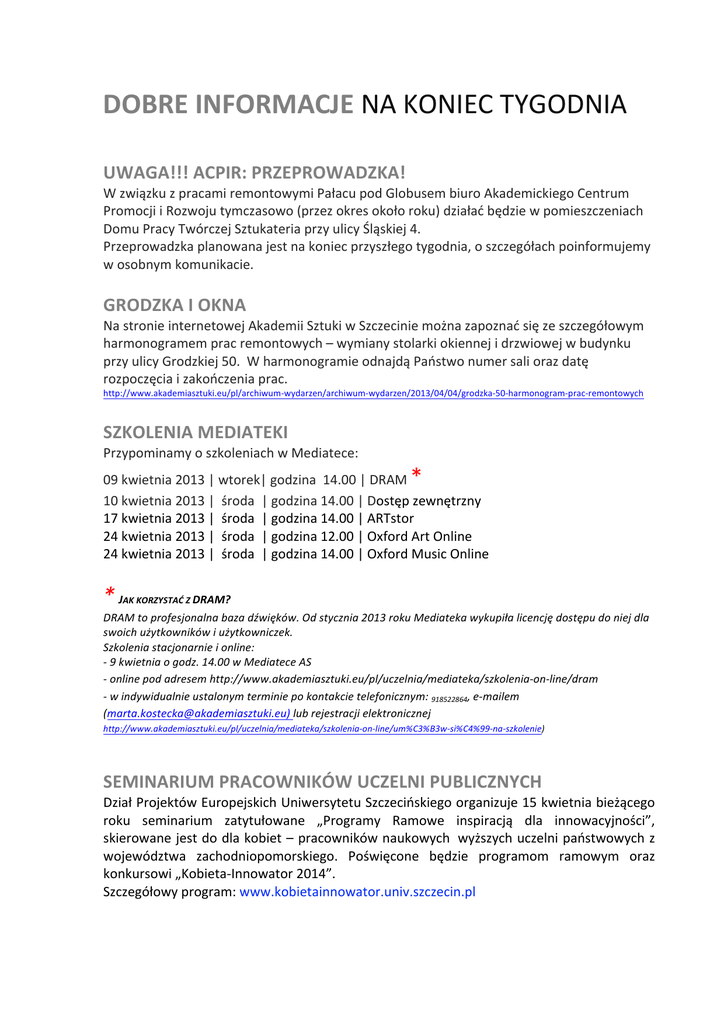 DOBRE INFORMACJE NA KONIEC TYGODNIA UWAGA!!! ACPIR: PRZEPROWADZKA! W związku z pracami remontowymi Pałacu pod Globusem biuro Akademickiego Centrum Promocji i Rozwoju tymczasowo (przez okres około roku) działać będzie w pomieszczeniach Domu Pracy Twórczej Sztukateria przy ulicy Śląskiej 4. Przeprowadzka planowana jest na koniec przyszłego tygodnia, o szczegółach poinformujemy w osobnym komunikacie. GRODZKA I OKNA Na stronie internetowej Akademii Sztuki w Szczecinie można zapoznać się ze szczegółowym harmonogramem prac remontowych – wymiany stolarki okiennej i drzwiowej w budynku przy ulicy Grodzkiej 50. W harmonogramie odnajdą Państwo numer sali oraz datę rozpoczęcia i zakończenia prac. http://www.akademiasztuki.eu/pl/archiwum-‐wydarzen/archiwum-‐wydarzen/2013/04/04/grodzka-‐50-‐harmonogram-‐prac-‐remontowych SZKOLENIA MEDIATEKI Przypominamy o szkoleniach w Mediatece: * 09 kwietnia 2013 | wtorek| godzina 14.00 | DRAM 10 kwietnia 2013 | środa | godzina 14.00 | Dostęp zewnętrzny 17 kwietnia 2013 | środa | godzina 14.00 | ARTstor 24 kwietnia 2013 | środa | godzina 12.00 | Oxford Art Online 24 kwietnia 2013 | środa | godzina 14.00 | Oxford Music Online * J AK KORZYSTAĆ Z DRAM? DRAM to profesjonalna baza dźwięków. Od stycznia 2013 roku Mediateka wykupiła licencję dostępu do niej dla swoich użytkowników i użytkowniczek. Szkolenia stacjonarnie i online: -‐ 9 kwietnia o godz. 14.00 w Mediatece AS -‐ online pod adresem http://www.akademiasztuki.eu/pl/uczelnia/mediateka/szkolenia-‐on-‐line/dram -‐ w indywidualnie ustalonym terminie po kontakcie telefonicznym: 918522864, e-‐mailem ([email protected]) lub rejestracji elektronicznej http://www.akademiasztuki.eu/pl/uczelnia/mediateka/szkolenia-‐on-‐line/um%C3%B3w-‐si%C4%99-‐na-‐szkolenie) SEMINARIUM PRACOWNIKÓW UCZELNI PUBLICZNYCH Dział Projektów Europejskich Uniwersytetu Szczecińskiego organizuje 15 kwietnia bieżącego roku seminarium zatytułowane „Programy Ramowe inspiracją dla innowacyjności”, skierowane jest do dla kobiet – pracowników naukowych wyższych uczelni państwowych z województwa zachodniopomorskiego. Poświęcone będzie programom ramowym oraz konkursowi „Kobieta-‐Innowator 2014”. Szczegółowy program: www.kobietainnowator.univ.szczecin.pl PROJEKT REC.ENZJE Pozostały niespełna dwa miesiące do zakończenia konkursu recenzenckiego organizowanego przez szczecińską Filharmonię. W marcu zostało nadesłanych pięć prac konkursowych. Na najciekawszą pracę I edycji projektu REC.enzje głosować mogą także Internauci na blogu http://www.recenzjeprojekt.blogspot.com/. UWAGA! Wśród nadesłanych recenzji sa także teksty o koncertach Akademii Sztuki! ZAPROSZENIA, REKOMENDACJE (chronologicznie) KLASA KLARNETU W ZAMKU W najbliższą niedzielę (7 kwietnia 2013) w Sali Księcia Bogusława X Wielkiego w Zamku Książąt Pomorskich wystąpią studenci Akademii Sztuki z klasy klarnetu prof. Bogusława Jakubowskiego. Początek koncertu o 12.00. Wstęp wolny. PROGRAM KONCERTU: -‐ Franz Poenitz, Capriccio op. 73: Krzysztof Drozdowski – klarnet, Sandra Przyjemska – harfa -‐ Joseph Weinberg, Obrazki Żydowskie: Mateusz Petrykowski – klarnet, Dorota Maciaszczyk – fortepian -‐ Leo Weiner, Peregi Verbunk: Krzysztof Drozdowski – klarnet, Dorota Maciaszczyk – fortepian -‐ Andre Bloch, Denneriana: Hubert Leśniewski – klarnet, Dorota Maciaszczyk – fortepian -‐ Janusz Stalmierski, Krótka Historia: Krzysztof Drozdowski – klarnet, Sandra Przyjemska – harfa -‐ Darius Milhaud, Scaramouche: Paweł Sokołowski – klarnet, Dorota Maciaszczyk – fortepian Przygotowanie: mgr Barbara Stalmierska, prof. Bogusław Jakubowski, mgr Dorota Maciaszczyk WARSZTATY PSYCHOLOGICZNE ASPEKTY RELACJI MUZYCZNYCH 8 kwietnia 2013 | godzina 11.00 | aula, ul. Grodzka 50 Warsztaty dla studentów Akademii Sztuki w Szczecinie: Psychologiczne aspekty relacji muzycznych i wykonawstwa muzycznego. Prowadzenie: prof. Jolanta Kępińska-‐Welbel (Uniwersytet Muzyczny w Warszawie) Plan warsztatów: 10.00 -‐ 11.00 Motywacja i emocje w nauce muzyki 11.15 -‐ 12.15 Psychologiczne przygotowanie do występu muzycznego 12.30 -‐ 13.30 Relacje w zespole – transformacyjny styl prowadzenia zespołu muzycznego 13.30 -‐ 14.30 Podsumowanie i Dyskusja WERNISAŻ W GALERII REKTORSKIEJ -‐ Akordeon; obraz i muzyka 11 kwietnia 2013 | czwartek | godzina 18.00 | Pałac pod Globusem Akordeon; obraz i muzyka zostało pomyślane jako wydarzenie artystyczne mające na celu integrację środowiska studenckiego Akademii Sztuki w Szczecinie poprzez ideę korespondencji sztuk. Pomysł wydarzenia, które prezentowałoby aktywność plastyczną i muzyczną studentów, zrodził się w Pracowni Malarstwa i Rysunku prowadzonej przez dr hab. Elżbietę Wasyłyk i mgr Sylwię Godowską dla studentów Grafiki i Architektury Wnętrz, Wydziału Sztuk Wizualnych Akademii Sztuki w Szczecinie. Ćwiczenia malarskie i rysunkowe w ramach problemu akordeon zostały przeprowadzone w trzech etapach. Pierwszy dotyczył analizy formy instrumentu i mimetycznego sposobu przedstawienia. W drugim etapie studenci dysponowali dużą swobodą w sposobie budowania przestrzeni w obrazie dwuwymiarowym i możliwością stylizacji, uzyskując silną ekspresję formy i koloru. W trzecim etapie przez odpowiednie kadrowanie bryły instrumentu i analityczny, naśladowczy sposób przedstawiania, studenci poszukiwali granic między mimetycznością i abstrakcyjnością w obrazie. Jeżeli przyjmiemy, że abstrakcyjny obraz jest asemantyczny tak jak asemantyczna jest muzyka jako medium, to wydarzenie artystyczne Akordeon; obraz i muzyka, może stać się, nie tylko miejscem wzajemnego dopełniania się poprzez różnorodność medialną, ale również możliwością wspólnego przebywania i spotykania w tej samej, bezinteresownej przestrzeni sztuki. Nie jest zatem zaskoczeniem, że studenci z Wydziału Instrumentalnego
