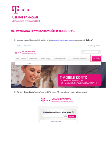 AktywAcjA kArty w BAnkowości internetowej 1. Aby aktywować kartę, należy wejść na stronę www.tmobilebankowe.pl oraz przycisk „Zaloguj”. 2. W polu „Identyfikator” wpisać numer CIF (numer CIF znajduje się na umowie ramowej). 1 Aktywacja karty 3. W polu „Hasło” wpisać brakujące znaki własnego hasła (hasło maskowane). 4. W widoku głównym wybrać „Idź do Kart”. 2 Aktywacja karty 5. Z listy kart wybrać kartę do aktywacji. 3 Aktywacja karty 6. W szczegółach karty wybierz opcję „Aktywacja karty”. 4 Aktywacja karty 7. Po weryfikacji poprawności danych wybrać opcję „Zatwierdź”. 8. Autoryzuj zmianę kodem SMS bądź tokenem mobilnym. 5 Aktywacja karty 9. Na ekranie wyświetlony zostanie kod PIN, który można zmienić w Szczegółach karty. 6