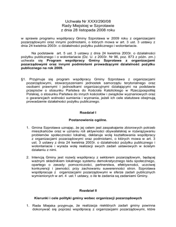 Uchwała Nr XXXI/290/08 Rady Miejskiej w Szprotawie z dnia 28 listopada 2008 roku w sprawie programu współpracy Gminy Szprotawa w 2009 roku z organizacjami pozarządowymi oraz innymi podmiotami, o których mowa w art. 3 ust. 3 ustawy z dnia 24 kwietnia 2003r. o działalności poŜytku publicznego i wolontariacie. Na podstawie art. 5 ust. 3 ustawy z dnia 24 kwietnia 2003r. o działalności poŜytku publicznego i o wolontariacie (Dz. U. z 2003r. Nr 96, poz. 873 z późn. zm.) uchwala się Program współpracy Gminy Szprotawa z organizacjami pozarządowymi oraz innymi podmiotami prowadzącymi działalność poŜytku publicznego na rok 2009. §1. Przyjmuje się program współpracy Gminy Szprotawa z organizacjami pozarządowymi, stowarzyszeniami jednostek samorządu terytorialnego oraz osobami prawnymi i jednostkami organizacyjnymi działającymi na podstawie przepisów o stosunku Państwa do Kościoła Katolickiego w Rzeczpospolitej Polskiej, o stosunku Państwa do innych kościołów i związków wyznaniowych oraz o gwarancjach wolności sumienia i wyznania, jeŜeli ich cele statutowe obejmują prowadzenie działalności poŜytku publicznego. Rozdział I Postanowienia ogólne. 1. Gmina Szprotawa uznając, Ŝe jej celem jest zaspakajanie zbiorowych potrzeb mieszkańców oraz w uznaniu roli aktywności obywatelskiej w rozwiązywaniu problemów społeczności lokalnej, deklaruje wolę kształtowania współpracy z organizacjami pozarządowymi oraz podmiotami, o których mowa w art. 3 ust. 3 ustawy z dnia 24 kwietnia 2003r. o działalności poŜytku publicznego i wolontariacie i wyraŜa wolę realizacji swych zadań ustawowych w ścisłym działaniu z nimi. 2. Intencją Gminy jest rozwój współpracy z sektorem pozarządowym, będącej waŜnym składnikiem lokalnego systemu demokratycznego ładu społecznego, opartego o zasady: pomocniczości, partnerstwa, efektywności, uczciwej konkurencji i jawności; przy zachowaniu suwerenności stron. Szprotawa współpracuje z organizacjami pozarządowymi w sferze zadań publicznych wymienionych w art. 4 ust.1 ustawy, o ile te zadania są zadaniami Gminy. Rozdział II Kierunki i cele polityki gminy wobec organizacji pozarządowych 1. Rada Miejska przyjmuje, Ŝe realizacja niektórych zadań gminy powinna dokonywać się poprzez współpracę z organizacjami pozarządowymi, które w związku z tym będą otrzymywały na ich realizację pomoc, w tym takŜe finansową z budŜetu gminy. 2. Celem programu na rok 2009 jest wzrost partycypacji społecznej, doskonalenie jej form, a takŜe wprowadzenie jasnych i czytelnych rozwiązań prawnych, włączających organizacje pozarządowe i inne podmioty działające w sferze poŜytku publicznego w system demokracji lokalnej. Cele programu obejmują: 2.1 realizację zadań publicznych określonych w art. 4 ust. 1 ustawy o działalności poŜytku publicznego i wolontariacie, obywatelskiego 2.2 kształtowanie lokalnego społeczeństwa i wspomaganie rozwoju społeczności lokalnych, w tym: 2.2.1 organizowanie i wspieranie działań społecznych oraz inicjatyw obywatelskich na rzecz rozwoju gminy i więzi lokalnych, 2.2.2 rozwijanie poczucia przynaleŜności do społeczności lokalnej, promocja postaw obywatelskich i prospołecznych, 2.3 wzmocnienie pozycji organizacji pozarządowych i zapewnienie im równych szans w realizacji zadań publicznych przez powierzanie i wspieranie coraz większej ilości zadań z jednoczesnym zapewnieniem odpowiednich środków na ich realizację, efektywności działań kierowanych do 2.4 podwyŜszenie mieszkańców gminy, 2.5 tworzenie systemowych rozwiązań dla waŜnych problemów społecznych, 2.6 informowanie o moŜliwości pozyskiwania środków finansowych oraz pomoc pracowników Gminnego Centrum Informacji w Szprotawie w wypełnianiu wniosków na pozyskanie funduszy z budŜetu gminy i z instytucji wspomagających. 3. Partnerami gminy w programie współpracy są organizacje pozarządowe i podmioty, o których mowa w art. 3 ust. 3 ustawy o działalności poŜytku publicznego i wolontariacie, nie działające w celu osiągnięcia zysku oraz realizujące cele publiczne. Rozdział III Zakres i formy współpracy 1. Gmina Szprotawa współpracuje z organizacjami pozarządowymi w sferze zadań publicznych wymienionych w art. 4 ust. 1 ustawy o działalności poŜytku publicznego i wolontariacie w zakresie zadań własnych gminy. 2. Współpraca ta moŜe mieć charakter finansowy i pozafinansowy. 3. Współpraca o charakterze finansowym polegająca na zlecaniu realizacji zadań publicznych moŜe odbywać się w formach: 3.1 3.2 powierzania wykonania zadania publicznego wraz z udzieleniem dotacji na finansowanie jego realizacji, wspieranie takiego zadania wraz z udzieleniem dotacji na dofinansowanie jego realizacji. 4. Dotacje o których mowa w ust.1 nie mogą być wykorzystywane w szczególności na: 4.1 zadania i zakupy inwestycyjne, 4.2 zakup gruntów, 4.3 działalność gospodarczą, pokrycie kosztów utrzymania biura organizacji pozarządowej starającej się o przyznanie dotacji, w tym takŜe wydatków na wynagrodzenia pracowników, 4.4 działalność polityczną i religijną. 5. Zlecanie realizacji zadań publicznych następuje w trybie otwartego konkursu ofert, chyba Ŝe przepisy odrębne przewidują inny tryb zlecania. Zlecanie będzie się odbywało w oparciu o wzór oferty zadania publicznego, określony w rozporządzeniu Ministra Pracy i Polityki Społecznej z dnia 27.12.2005r. w sprawie wzoru oferty realizacji zadania publicznego, ramowego wzoru umowy o wykonanie zadania publicznego i wzoru sprawozdania z wykonania tego zadania. 6. Współpraca o charakterze pozafinansowym moŜe odbywać się w formach: 6.1 wzajemnego informowania się o planowanych kierunkach działalności i współdziałaniu w celu zharmonizowania tych kierunków, 6.2 konsultowania z organizacjami pozarządowymi, odpowiednio do zakresu ich działania, projektów aktów normatywnych w dziedzinach dotycząc