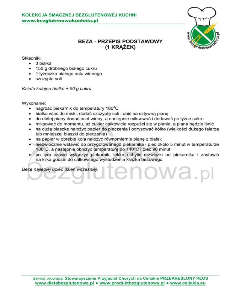 KOLEKCJA SMACZNEJ BEZGLUTENOWEJ KUCHNI www.bezglutenowakuchnia.pl BEZA - PRZEPIS PODSTAWOWY (1 KRĄŻEK) Składniki: 3 białka 150 g drobnego białego cukru 1 łyżeczka białego octu winnego szczypta soli Każde kolejne białko + 50 g cukru Wykonanie: nagrzać piekarnik do temperatury 180oC białka wlać do miski, dodać szczyptę soli i ubić na sztywną pianę do ubitej piany dodać ocet winny, a następnie miksować i dodawać po łyżce cukru miksować do momentu, aż cukier całkowicie rozpuści się w pianie, a piana będzie lśnić na dużą blaszkę nałożyć papier do pieczenia i odrysować kółko (wielkości dużego talerza lub mniejszej blaszki do pieczenia) na papier w obrębie koła nałożyć równomiernie pianę z białek niezwłocznie wstawić do przygotowanego piekarnika i piec około 5 minut w temperaturze 180⁰C, a następnie obniżyć temperaturę do 140⁰C i piec 90 minut po tym czasie wyłączyć piekarnik, lekko uchylić drzwiczki od piekarnika i zostawić na kilka godzin do całkowitego wystudzenia krążka bezowego Bezę najlepiej upiec dzień wcześniej. Serwis prowadzi Stowarzyszenie Przyjaciół Chorych na Celiakię PRZEKREŚLONY KŁOS www.dietabezglutenowa.pl ● www.produktbezglutenowy.pl ● www.celiakia.eu