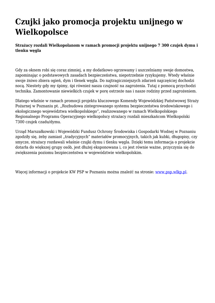 Czujki jako promocja projektu unijnego w Wielkopolsce Strażacy rozdali Wielkopolanom w ramach promocji projektu unijnego 7 300 czujek dymu i tlenku węgla Gdy za oknem robi się coraz zimniej, a my dodatkowo ogrzewamy i uszczelniamy swoje domostwa, zapominając o podstawowych zasadach bezpieczeństwa, niepotrzebnie ryzykujemy. Wtedy właśnie swoje żniwo zbiera ogień, dym i tlenek węgla. Do najtragiczniejszych zdarzeń najczęściej dochodzi nocą. Niestety gdy my śpimy, śpi również nasza czujność na zagrożenia. Tutaj z pomocą przychodzi technika. Zamontowanie niewielkich czujek w porę ostrzeże nas i nasze rodziny przed zagrożeniem. Dlatego właśnie w ramach promocji projektu kluczowego Komendy Wojewódzkiej Państwowej Straży Pożarnej w Poznaniu pt. „Rozbudowa zintegrowanego systemu bezpieczeństwa środowiskowego i ekologicznego województwa wielkopolskiego”, realizowanego w ramach Wielkopolskiego Regionalnego Programu Operacyjnego wielkopolscy strażacy rozdali mieszkańcom Wielkopolski 7300 czujek czadu/dymu. Urząd Marszałkowski i Wojewódzki Fundusz Ochrony Środowiska i Gospodarki Wodnej w Poznaniu zgodziły się, żeby zamiast „tradycyjnych” materiałów promocyjnych, takich jak kubki, długopisy, czy smycze, strażacy rozdawali właśnie czujki dymu i tlenku węgla. Dzięki temu informacja o projekcie dotarła do większej grupy osób, jest dłużej eksponowana i, co jest równie ważne, przyczynia się do zwiększenia poziomu bezpieczeństwa w województwie wielkopolskim. Więcej informacji o projekcie KW PSP w Poznaniu można znaleźć na stronie: www.psp.wlkp.pl.