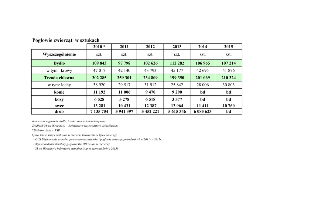 Pogłowie zwierząt w sztukach 2010 * 2011 2012 2013 2014 2015 Wyszczególnienie szt. szt. szt. szt. szt. szt. Bydło 109 843 97 798 102 626 112 282 106 965 107 214 w tym: krowy 47 017 42 140 43 793 45 177 42 695 41 876 Trzoda chlewna 302 285 259 301 234 809 199 350 201 069 210 324 w tym: lochy 38 920 29 517 31 912 25 842 28 006 30 803 konie 11 192 11 006 9 470 9 290 bd bd kozy owce drób 6 528 13 281 7 135 704 5 278 10 431 5 941 397 6 518 12 387 5 452 221 3 577 12 964 5 615 346 bd 11 411 6 085 623 bd 10 760 bd stan w końcu grudnia bydło; trzoda stan w końcu listopoda Żródło:WUS we Wrocławiu - Rolnictwo w województwie dolnośląskim. *2010 rok dane z PSR bydło, konie, kozy i drób stan w czerwcu, trzoda stan w lipcu dane wg: - GUS Użytkowanie gruntów, powierzchnia zasiewów i pogłowie zwierząt gospodarskich w 2011r. i 2012r. - Wyniki badania struktury gospodarstw 2013 (stan w czerwcu) - US we Wrocławiu Informacja sygnalna (stan w czerwcu 2014 i 2015)