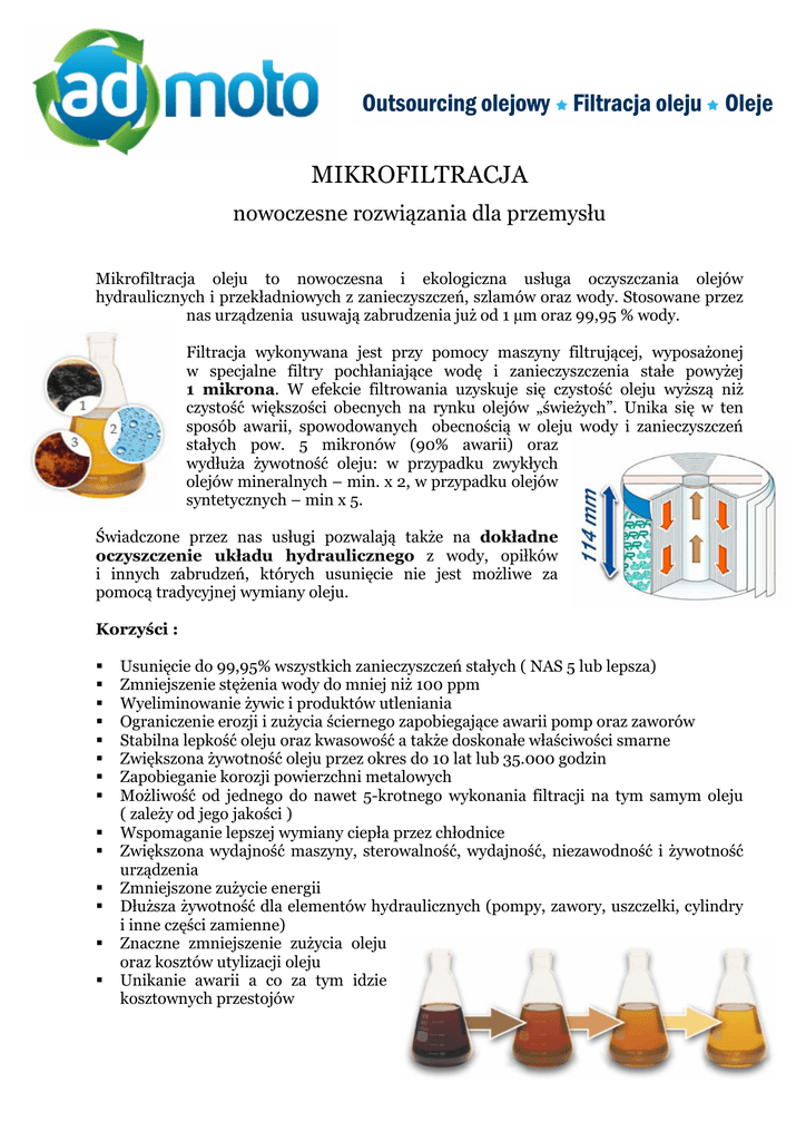 MIKROFILTRACJA nowoczesne rozwiązania dla przemysłu Mikrofiltracja oleju to nowoczesna i ekologiczna usługa oczyszczania olejów hydraulicznych i przekładniowych z zanieczyszczeń, szlamów oraz wody. Stosowane przez nas urządzenia usuwają zabrudzenia już od 1 µm oraz 99,95 % wody. Filtracja wykonywana jest przy pomocy maszyny filtrującej, wyposażonej w specjalne filtry pochłaniające wodę i zanieczyszczenia stałe powyżej 1 mikrona. W efekcie filtrowania uzyskuje się czystość oleju wyższą niż czystość większości obecnych na rynku olejów „świeżych”. Unika się w ten sposób awarii, spowodowanych obecnością w oleju wody i zanieczyszczeń stałych pow. 5 mikronów (90% awarii) oraz wydłuża żywotność oleju: w przypadku zwykłych olejów mineralnych – min. x 2, w przypadku olejów syntetycznych – min x 5. Świadczone przez nas usługi pozwalają także na dokładne oczyszczenie układu hydraulicznego z wody, opiłków i innych zabrudzeń, których usunięcie nie jest możliwe za pomocą tradycyjnej wymiany oleju. Korzyści : Usunięcie do 99,95% wszystkich zanieczyszczeń stałych ( NAS 5 lub lepsza) Zmniejszenie stężenia wody do mniej niż 100 ppm Wyeliminowanie żywic i produktów utleniania Ograniczenie erozji i zużycia ściernego zapobiegające awarii pomp oraz zaworów Stabilna lepkość oleju oraz kwasowość a także doskonałe właściwości smarne Zwiększona żywotność oleju przez okres do 10 lat lub 35.000 godzin Zapobieganie korozji powierzchni metalowych Możliwość od jednego do nawet 5-krotnego wykonania filtracji na tym samym oleju ( zależy od jego jakości ) Wspomaganie lepszej wymiany ciepła przez chłodnice Zwiększona wydajność maszyny, sterowalność, wydajność, niezawodność i żywotność urządzenia Zmniejszone zużycie energii Dłuższa żywotność dla elementów hydraulicznych (pompy, zawory, uszczelki, cylindry i inne części zamienne) Znaczne zmniejszenie zużycia oleju oraz kosztów utylizacji oleju Unikanie awarii a co za tym idzie kosztownych przestojów Transport publiczny Kolejnictwo Maszyny budowlane Utylizacja odpadów Transport Elektrownie Wojsko Wtryskarki Kopalnie Przemysł morski Przemysł samochodowy Huty Filtracja paliw Elektrownie wiatrowe Obrabiarki Lotnictwo Świadczymy usługi: Filtracja zapobiegająca awariom oraz filtracja układów maszyn po awariach Napełnianie układów przez filtry Doczyszczanie układów Wymiana elementów hydraulicznych Uszczelnianie układów Wymiana węży Czyszczenie zbiorników Ciśnieniowe czyszczenie węży Sprzedaż i budowa maszyn filtracyjnych Montaże systemów by-pass Pomiary stopnia zużycia oleju Monitoring czystości Doradztwo w zakresie stosowanych olejów Sprzedaż olejów biodegradowalnych Sprzedaż olejów o wydłużonych okresach żywotności Badania laboratoryjne oleju Sprzedaż, dobór oraz wymiana filtrów hydraulicznych Usuwanie wody, kwasów, osadów i opiłków z oleju. Usługi na miejscu u klienta lub odbiór oleju i zwrot po przefiltrowaniu Serwis 24h AD MOTO Rafał Zawisz Al. Roździeńskiego 188 b, 40-203 Katowice Tel. 32 785 66 04, Kom. 604 580 907, e-mail: [email protected] www.filtracjaoleju.pl, www.oczyszczanieoleju.pl, FILTRACJA = OSZCZĘDNOŚĆ