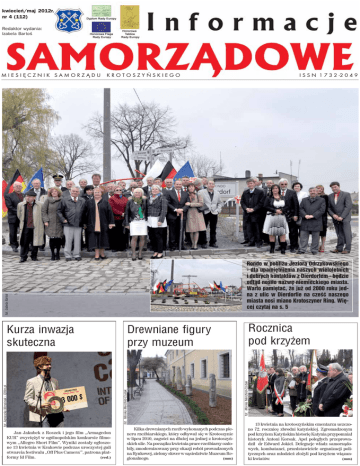 www.is.krotoszyn.pl kwiecieñ/maj 2012r. 4 (112) nr 4 (112) Redaktor wydania: Izabela Bartoœ KROTOSZYŃSKIEGO Rocznica pod krzy¿em Kilka drewnianych rzeźb wykonanych podczas pleneru rzeźbiarskiego, który odbywał się w Krotoszynie w lipcu 2010, zagości na dłużej na jednej z krotoszyńskich ulic. Na początku kwietnia prace rzeźbiarzy ozdobiły, zmodernizowany przy okazji robót prowadzonych na Rynkowej, zielony skwer w sąsiedztwie Muzeum Regionalnego. (mm) fot. Monika Menzfeld-Czubak Drewniane figury przy muzeum fot. Monika Menzfeld-Czubak fot. Agnieszka Wrzeœniak - IDfilm.pl Kurza inwazja skuteczna Jan Jakubek z Roszek i jego film „Armagedon KUR” zwyciężył w ogólnopolskim konkursie filmowym „Allegro Short Film”. Wyniki zostały ogłoszone 13 kwietnia w Krakowie podczas uroczystej gali otwarcia festiwalu „Off Plus Camera'”, patrona plat(red.) formy Id Film. I S S N 1 7 3 2 -2 0 4 9 Rondo w pobli¿u Jeziora Odrzykowskiego - dla upamiêtnienia naszych wieloletnich i dobrych kontaktów z Dierdorfem - bêdzie odt¹d nosi³o nazwê niemieckiego miasta. 28 marca dzieci ze szkó³ i przedszkoli Krotoszyna oraz Warto pamiêtaæ, ¿e ju¿ od 2000 roku jeds¹siednich miast spotka³y siê w Zespole Szkó³ Intena z ulic w Dierdorfie na czeœæ naszego gracyjnych nr 2 w Krotoszynie na VII edycji Przegl¹miasta nosi miano Krotoszyner Ring. Wiêdu Ma³ych Form Teatralnych. (czytaj s. 2) cej czytaj na s. 5 fot. Izabela Bartoœ fot. Izabela Bartoœ MIESIĘCZNIK SAMORZĄDU 13 kwietnia na krotoszyńskim cmentarzu uczczono 72. rocznicę zbrodni katyńskiej. Zgromadzonym pod krzyżem Katyńskim historię Katynia przypomniał historyk Antoni Korsak. Apel poległych przeprowadził dr Edward Jokiel. Delegacje władz samorządowych, kombatanci, przedstawiciele organizacji politycznych oraz młodzież złożyli pod krzyżem wiązanki kwiatów. (mm) 1 4 (112) Zarz¹d Powiatowy LOK zaprasza 6 maja o godz. 10.00 sympatyków strzelectwa sportowego na otwarte zawody strzeleckie z broni kulowej z okazji Tygodnia LOK. Zawody odbêd¹ siê na strzelnicy I LO przy ul Ko³³¹taja. Stowarzyszenie Krotochwile zaprasza 6 maja na piknik. Pocz¹tek o godz. 13.30 na Rynku, nale¿y zabraæ ze sob¹ zu¿yte puszki, butelki lub inne odpady, na których mo¿na graæ. Dalsza czêœæ imprezy odbêdzie siê w parku, gdzie zaplanowano warsztaty plastyczne, wspólne gry i zabawy. Mo¿na bêdzie te¿ zgrillowaæ przyniesione z domu smako³yki. 8 maja w 67. rocznicê zwyciêstwa nad faszyzmem o godz. 12.00 kwiaty pod pomnikiem Wolnoœci na pl. Jana Paw³a II oraz pod pomnikiem 6 Pu³ku Artylerii Lekkiej (ul. Piastowska) z³o¿¹ delegacje samorz¹dowców, kombatantów oraz m³odzie¿y szkolnej. 11 – 12 maja odbêdzie siê 40. Krajoznawczy Zlot M³odzie¿y „Œwiêto Roweru” z trzema trasami: rowerow¹ jedno – i dwudniow¹ oraz piesz¹ jednodniow¹. Start z placu przy muzeum, meta pod grzybkiem w Baszkowie. Organizatorzy gwarantuj¹ piêkne krajobrazy na trasie, na mecie posi³ek i znaczek rajdowy oraz nocleg przy trasie dwudniowej. Informacje, zapisy i op³aty do 8 maja w biurze krotoszyñskiego oddzia³u PTTK, Ma³y Rynek 1, tel. 062 725 26 15. 12 maja o godz. 12.00 odbêdzie siê uroczyste nadanie nazwy rondu Brummen, na zbiegu ulic Ostrowskiej i Ceglarskiej w Krotoszynie. Na uroczystoœæ w³adze miejskie zaprosi³y oficjaln¹ delegacjê z holenderskiego miasta. 12 maja w Szkole Podstawowej nr 4 w godz. 10.00 – 13.00 odbêdzie siê “Piknik z Patronem Szko³y”. Atrakcje pikniku: na boisku szkolnym pojazdy wojskowe, u³ani na koniach i œredniowieczni rycerze w zbrojach, w budynku szko³y - wystawa pami¹tek wojennych i sprzêtu wojskowego. Oprócz tego: wojskowy tor przeszkód, strzelnica, kuchnia polowa z grochówk¹ i kawiarenka z ciastem. Do 27 maja na piêtrze krotoszyñskiej biblioteki mo¿na ogl¹daæ wystawê .,,Szko³a pod ¯aglami’’ na fotografiach Zbigniewa Boska. Wystawa jest reporta¿em z rejsu atlantyckiego m³odzie¿y gimnazjalnej z ca³ej Polski. Urz¹d Miejski w Krotoszynie Centrala Faks Punkt Informacyjny Sekretariat Burmistrza Biuro Rady Miejskiej Stra¿ Miejska (62) (62) (62) (62) (62) (62) (62) 725 725 722 722 722 722 722 42 34 74 74 74 74 74 01 36 58 14 51 07 57 Burmistrz Julian Jokœ przyjmuje interesantów we wtorki w godz. 15.30 – 16.30. Przewodnicz¹ca Rady Miejskiej Zofia Jamka przyjmuje interesantów we wtorki w godz. 14.00 – 15.00. Starostwo Powiatowe (62) 725 42 56 (62) 725 42 57 Powiatowy Urz¹d Pracy (62) 725 36 84 (62) 725 44 56 Komenda Powiatowa Policji w Krotoszynie (62) 725 52 00 Komenda Powiatowa Pañstwowej Stra¿y Po¿arnej (62) 725 29 21 (62) 725 29 22 Miejsko-Gminny Oœrodek Pomocy Spo³ecznej (62) 725 36 68 (62) 725 39 96 Urz¹d Skarbowy 2 23 kwietnia to Œwiatowy Dzieñ Ksi¹¿ki i Praw Autorskich. Œwiêto, ustanowione w 1995 roku przez UNESCO, ma na celu promocjê czytelnictwa, edytorstwa i ochronê w³asnoœci intelektualnej. Jak co roku Krotoszyńska Biblioteka Publiczna im. Arkadego Fiedlera włączyła się w obchody tego święta. Na skwerku koło biblioteki zostały wystawione ławeczki i stoliki z książkami, które można było zabrać ze sobą i, w myśl zasady bookcrosingu, przekazać innym po przeczytaniu. O święcie ksiązki i róży informowały plakaty na stojakach. Członkowie Towarzystwa Miłośników i Badaczy Ziemi Krotoszyńskiej prowadzili sprzedaż swoich wydawnictw. Zaproszone na godz. 10.00 i 14.00 grupy dzieci z przedszkola Maciuś wysłuchały historii Światowego Dnia Książki. Zgodnie z tradycją każdy chłopiec wręczył dziewczynce różę, a one w zamian odwdzięczyły się im książeczkami. Młodzi uczestnicy spotkania wysłuchali fragmentów książek Janusza Korczaka oraz bajek i wierszy polskich pisarzy w wykonaniu bibliotekarzy i przedstawicieli Dyskusyjnego Klubu Książki. Pogoda sprzyjała rozmowom na temat wartości, jakie niesie ze sobą czytanie. Dzieci chętnie uczestniczyły w zabawach i grach. S