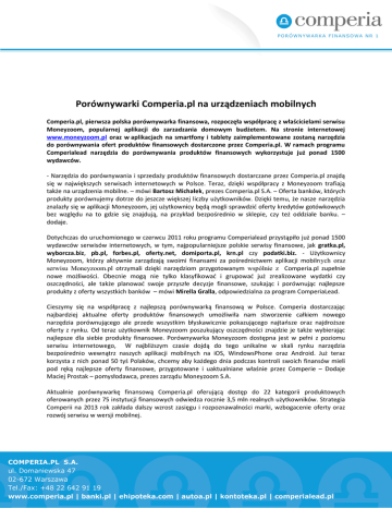 Porównywarki Comperia.pl na urządzeniach mobilnych Comperia.pl, pierwsza polska porównywarka finansowa, rozpoczęła współpracę z właścicielami serwisu Moneyzoom, popularnej aplikacji do zarzadzania domowym budżetem. Na stronie internetowej www.moneyzoom.pl oraz w aplikacjach na smartfony i tablety zaimplementowane zostaną narzędzia do porównywania ofert produktów finansowych dostarczone przez Comperia.pl. W ramach programu Comperialead narzędzia do porównywania produktów finansowych wykorzystuje już ponad 1500 wydawców. - Narzędzia do porównywania i sprzedaży produktów finansowych dostarczane przez Comperia.pl znajdą się w największych serwisach internetowych w Polsce. Teraz, dzięki współpracy z Moneyzoom trafiają także na urządzenia mobilne. – mówi Bartosz Michałek, prezes Comperia.pl S.A. – Oferta banków, których produkty porównujemy dotrze do jeszcze większej liczby użytkowników. Dzięki temu, że nasze narzędzia znalazły się w aplikacji Moneyzoom, jej użytkownicy będą mogli sprawdzić oferty kredytów gotówkowych bez względu na to gdzie się znajdują, na przykład bezpośrednio w sklepie, czy też oddziale banku. – dodaje. Dotychczas do uruchomionego w czerwcu 2011 roku programu Comperialead przystąpiło już ponad 1500 wydawców serwisów internetowych, w tym, najpopularniejsze polskie serwisy finansowe, jak gratka.pl, wyborcza.biz, pb.pl, forbes.pl, oferty.net, domiporta.pl, krn.pl czy podatki.biz. - Użytkownicy Moneyzoom, którzy aktywnie zarządzają swoimi finansami za pośrednictwem aplikacji mobilnych oraz serwisu Moneyzoom.pl otrzymali dzięki narzędziom przygotowanym wspólnie z Comperia.pl zupełnie nowe możliwości. Obecnie mogą nie tylko klasyfikować i grupować już zrealizowane wydatki czy oszczędności, ale także planować swoje przyszłe decyzje finansowe, szukając i porównując najlepsze produkty z oferty wszystkich banków – mówi Mirella Gralla, odpowiedzialna za program ComperiaLead. Cieszymy się na współpracę z najlepszą porównywarką finansową w Polsce. Comperia dostarczając najbardziej aktualne oferty produktów finansowych umożliwiła nam stworzenie całkiem nowego narzędzia porównującego ale przede wszystkim błyskawicznie pokazującego najtańsze oraz najdroższe oferty z rynku. Od teraz użytkownik Moneyzoom poszukujący oszczędności znajdzie je także wybierając najlepsze dla siebie produkty finansowe. Porównywarka Moneyzoom dostępna jest w pełni z poziomu serwisu internetowego, W najbliższym czasie dojdą do tego unikalne w skali rynku narzędzia bezpośrednio wewnątrz naszych aplikacji mobilnych na iOS, WindowsPhone oraz Android. Już teraz korzysta z nich ponad 50 tyś Polaków, chcemy aby każdego dnia podczas kontroli swoich finansów mieli pod ręką najlepsze oferty finansowe, przygotowane i uaktualniane właśnie przez Comperie – Dodaje Maciej Prostak – pomysłodawca, prezes zarządu Moneyzoom S.A. Aktualnie porównywarkę finansową Comperia.pl oferującą dostęp do 22 kategorii produktowych oferowanych przez 75 instytucji finansowych odwiedza rocznie 3,5 mln realnych użytkowników. Strategia Comperii na 2013 rok zakłada dalszy wzrost zasięgu i rozpoznawalności marki, wzbogacenie oferty oraz rozwój serwisu w wersji mobilnej. Comperia.pl S.A., założona w 2008 roku, była pierwszą w Polsce porównywarką produktów finansowych, twórcą tej kategorii w polskim Internecie. Obecnie należy do najczęściej odwiedzanych witryn internetowych w kraju. W skład Grupy Comperia, oprócz porównywarki finansowej Comperia.pl, wchodzi także serwis Banki.pl, portal poświęcony kredytom hipotecznym eHipoteka.com serwis motoryzacyjny Autoa.pl., portal Kontoteka.pl oraz ComperiaLead czyli rozbudowany program partnerski.
