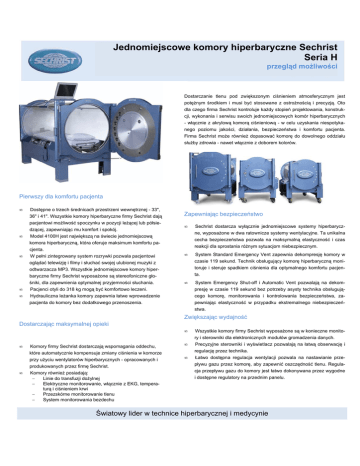 Jednomiejscowe komory hiperbaryczne Sechrist Seria H przegląd możliwości Dostarczanie tlenu pod zwiększonym ciśnieniem atmosferycznym jest potężnym środkiem i musi być stosowane z ostrożnością i precyzją. Oto dla czego firma Sechrist kontroluje każdy stopień projektowania, konstrukcji, wykonania i serwisu swoich jednomiejscowych komór hiperbarycznych - włącznie z akrylową komorą ciśnieniową - w celu uzyskania niespotykanego poziomu jakości, działania, bezpieczeństwa i komfortu pacjenta. Firma Sechrist może również dopasować komorę do dowolnego oddziału służby zdrowia - nawet włącznie z doborem kolorów. Pierwszy dla komfortu pacjenta • Dostępne o trzech średnicach przestrzeni wewnętrznej - 33", 36" i 41". Wszystkie komory hiperbaryczne firmy Sechrist dają pacjentowi możliwość spoczynku w pozycji leżącej lub półsiedzącej, zapewniając mu komfort i spokój. • Zapewniając bezpieczeństwo • Model 4100H jest największą na świecie jednomiejscową cecha bezpieczeństwa pozwala na maksymalną elastyczność i czas komora hiperbaryczną, która oferuje maksimum komfortu pacjenta. • W pełni zintegrowany system rozrywki pozwala pacjentowi reakcji dla sprostania różnym sytuacjom niebezpiecznym. • odtwarzacza MP3. Wszystkie jednomiejscowe komory hiper- toruje i steruje spadkiem ciśnienia dla optymalnego komfortu pacjen- baryczne firmy Sechrist wyposażone są stereofoniczne gło- ta. śniki, dla zapewnienia optymalnej przyjemności słuchania. • System Standard Emergency Vent zapewnia dekompresję komory w czasie 119 sekund. Technik obsługujący komorę hiperbaryczną moni- oglądać telewizję i filmy i słuchać swojej ulubionej muzyki z • Sechrist dostarcza wyłącznie jednomiejscowe systemy hiperbaryczne, wyposażone w dwa ratownicze systemy wentylacyjne. Ta unikalna • Pacjenci otyli do 318 kg mogą być komfortowo leczeni. System Emergency Shut-off i Automatic Vent pozwalają na dekompresję w czasie 119 sekund bez potrzeby asysty technika obsługują- Hydrauliczna leżanka komory zapewnia łatwe wprowadzenie cego komorę, monitorowania i kontrolowania bezpieczeństwa, za- pacjenta do komory bez dodatkowego przenoszenia. pewniając elastyczność w przypadku ekstremalnego niebezpieczeństwa. Zwiększając wydajność Dostarczając maksymalnej opieki • Wszystkie komory firmy Sechrist wyposażone są w konieczne monitory i sterowniki dla elektronicznych modułów gromadzenia danych. • Komory firmy Sechrist dostarczają wspomagania oddechu, które automatycznie kompensuje zmiany ciśnienia w komorze przy użyciu wentylatorów hiperbarycznych - opracowanych i produkowanych przez firmę Sechrist. • Komory również posiadają: − Linie do transfuzji dożylnej − Elektryczne monitorowanie, włącznie z EKG, temperaturą i ciśnieniem krwi − Przezskórne monitorowanie tlenu − System monitorowania bezdechu • Precyzyjne sterowniki i wyświetlacz pozwalają na łatwą obserwację i regulację przez technika. • Łatwo dostępna regulacja wentylacji pozwala na nastawianie przepływu gazu przez komorę, aby zapewnić oszczędność tlenu. Regulacja przepływu gazu do komory jest łatwo dokonywana przez wygodne i dostępne regulatory na przednim panelu. Światowy lider w technice hiperbarycznej i medycynie Jednomiejscowe komory hiperbaryczne Sechrist Seria H dane techniczne Oznaczenia i normy Systemy projektowe, produkcyjne, serwisowe i instalacyjne firmy Sechrist Industries spełniają wymagania normy zapewniania jakości urządzeń medycznych ISO 13485. Ponadto jednomiejscowe komory hiperbaryczne firmy Sechrist są projektowane, wytwarzane, montowane, testowane i instalowane zgodnie z następującymi kodami i normami aktualnego wydania: • • • • • • • • • ASME PVHO-1, Norma bezpieczeństwa komór ciśnieniowych przeznaczonych dla ludzi. ASME Kody do oznaczania komór ciśnieniowych, Rozdział VIII, paragraf I, Komory ciśnieniowe NFPA 99 Pomieszczenia medyczne Zarejestrowano przez National Board of Bojler and Pressure Vessel Inspectors Wymaganie U.S. FDA, 21 Kod Przepisów Federalnych, Część 820 ISO 13485: 2003 Norma zabezpieczenia jakości urządzeń medycznych CMDCAS - Kanadyjski system zapewniania jakości urządzeń medycznych CAN/CSA Std. 22.2 Nr 601.1 IEC 60601-1 Wyłączny przedstawiciel w Polsce: Lifemed Poland Sp.z o.o. ul. Cybernetyki 19b 02-677 Warszawa Tel. 0 22 862 83 75/76 Światowy lider w technice hiperbarycznej i medycynie