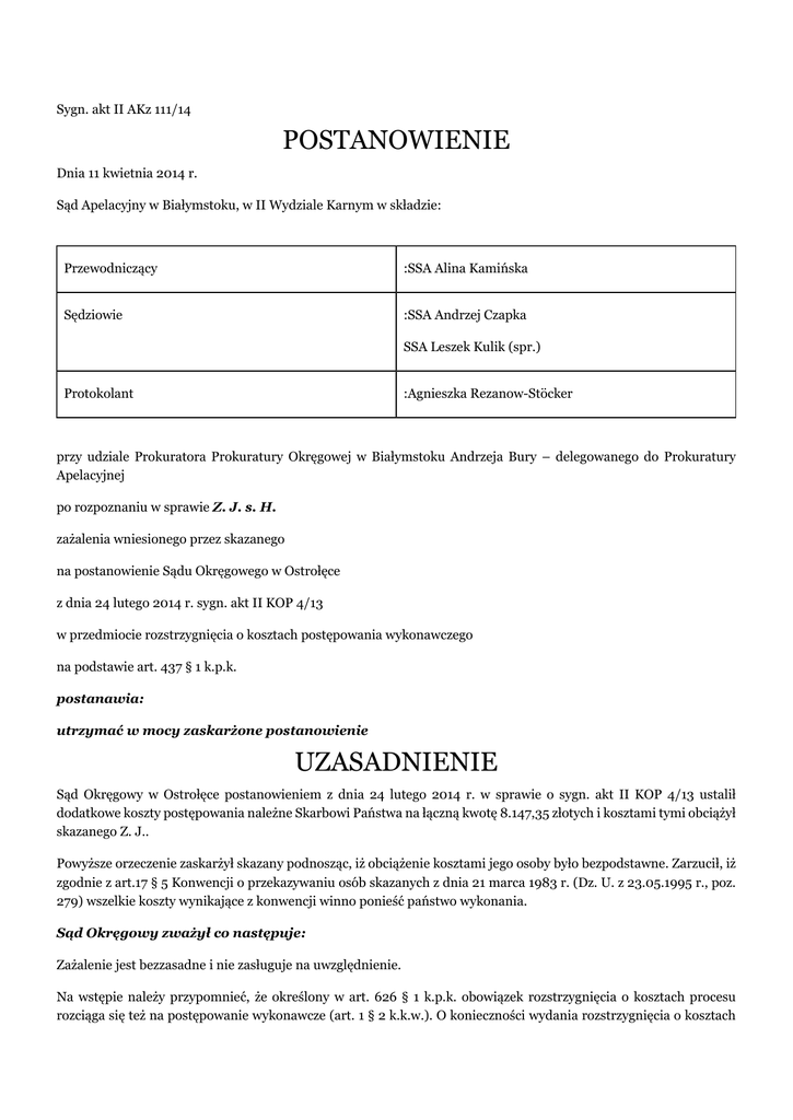 Sygn. akt II AKz 111/14 POSTANOWIENIE Dnia 11 kwietnia 2014 r. Sąd Apelacyjny w Białymstoku, w II Wydziale Karnym w składzie: Przewodniczący :SSA Alina Kamińska Sędziowie :SSA Andrzej Czapka SSA Leszek Kulik (spr.) Protokolant :Agnieszka Rezanow-Stöcker przy udziale Prokuratora Prokuratury Okręgowej w Białymstoku Andrzeja Bury – delegowanego do Prokuratury Apelacyjnej po rozpoznaniu w sprawie Z. J. s. H. zażalenia wniesionego przez skazanego na postanowienie Sądu Okręgowego w Ostrołęce z dnia 24 lutego 2014 r. sygn. akt II KOP 4/13 w przedmiocie rozstrzygnięcia o kosztach postępowania wykonawczego na podstawie art. 437 § 1 k.p.k. postanawia: utrzymać w mocy zaskarżone postanowienie UZASADNIENIE Sąd Okręgowy w Ostrołęce postanowieniem z dnia 24 lutego 2014 r. w sprawie o sygn. akt II KOP 4/13 ustalił dodatkowe koszty postępowania należne Skarbowi Państwa na łączną kwotę 8.147,35 złotych i kosztami tymi obciążył skazanego Z. J.. Powyższe orzeczenie zaskarżył skazany podnosząc, iż obciążenie kosztami jego osoby było bezpodstawne. Zarzucił, iż zgodnie z art.17 § 5 Konwencji o przekazywaniu osób skazanych z dnia 21 marca 1983 r. (Dz. U. z 23.05.1995 r., poz. 279) wszelkie koszty wynikające z konwencji winno ponieść państwo wykonania. Sąd Okręgowy zważył co następuje: Zażalenie jest bezzasadne i nie zasługuje na uwzględnienie. Na wstępie należy przypomnieć, że określony w art. 626 § 1 k.p.k. obowiązek rozstrzygnięcia o kosztach procesu rozciąga się też na postępowanie wykonawcze (art. 1 § 2 k.k.w.). O konieczności wydania rozstrzygnięcia o kosztach postępowania wykonawczego mówi expressis verbis art. 626 § 2 k.p.k. zaznaczając, że orzeczenie w tym przedmiocie wydaje odpowiednio sąd pierwszej instancji lub sąd odwoławczy, tzn. ten sąd, przed którym te koszty powstały. Najczęściej będą to nieznaczne kwoty stanowiące wydatki związane z wykonaniem orzeczenia (art. 618 § 1 pkt 6 k.p.k.), takie jak przykładowo ryczałt za doręczenie wezwań i innych pism. Wydatki te wykładane są tylko tymczasowo przez Skarb Państwa także i w tym stadium procesu. Zdarza się jednak, że wygenerowane na tym etapie koszty postępowania są znaczne, czego przykładem są również wydatki poniesione w sprawie niniejszej. Wydatki związane z wydaniem skazanego przez państwo obce w celu wykonania kary, stanowią koszty postępowania wykonawczego. Kto, w jakiej części i zakresie ponosi te koszty rozstrzyga Sąd pierwszej instancji właściwy do wydania orzeczenia w tym przedmiocie. Sąd Okręgowy w Ostrołęce prawomocnym postanowieniem z dnia 2 grudnia 2013 r. obciążył Z. J. kosztami postępowania w sprawie dotyczącej przejęcia do wykonania w Polsce wyroku Sądu Apelacyjnego w S. (Królestwo Szwecji) w sprawie (...) Koszty związane z wykonaniem przejętego do wykonania w Rzeczypospolitej Polskiej wyroku co do zasady winien więc ponieść skazany. Obciążenie nimi Z. J. było więc w pełni uzasadnione. Od ponoszenia tych kosztów nie zwalnia też skazanego dyspozycja art.17 § 5 Konwencji o przekazywaniu osób skazanych z dnia 21 marca 1983 r. (Dz. U. z 23.05.1995 r., poz. 279) powołana przez skazanego w uzasadnieniu wniesionego zażalenia. Zgodnie z art. 28 ust. 1 i 2 Decyzji Ramowej Rady (...) z dnia 27 listopada 2008 r. o stosowaniu zasady wzajemnego uznawania do wyroków skazujących na karę pozbawienia wolności lub inny środek polegający na pozbawieniu wolności – w celu wykonania tych wyroków w Unii Europejskiej – w przypadku wyroków wydanych po 5 grudnia 2011 r. nie mają zastosowania dotychczas istniejące instrumenty prawne dotyczące przekazywania osób skazanych – to jest Konwencja o przekazywaniu osób skazanych sporządzona w Strasburgu z dnia 21 marca 1983 r. wraz z Protokołem Dodatkowym. Stosownie do art. 24 powołanej Decyzji Ramowej Rady, koszty powstałe w związku ze stosowaniem decyzji ramowej ponoszone są przez państwo wykonujące, z wyjątkiem koszów przekazania osoby skazanej do państwa wykonującego oraz kosztów, które powstały wyłącznie na terytorium, na którym władzę sprawuje państwo wydające. Nie ulega wątpliwości, że przejęty do wykonania wyrok Sądu Apelacyjnego w S. został wydany po dacie 5 grudnia 2011 r., zaś koszty konwoju skazanego są kosztami przekazania jego osoby do państwa wykonującego, których w świetle tych uregulowań nie pokrywa to państwo. Rzecz jednak w tym, że Szwecja nie przystąpiła do powołanej decyzji ramowej i nie jest jej stroną. W konsekwencji w kwestii kosztów postępowania w niniejszej sprawie będą miały zastosowanie przepisy kodeksu postępowania karnego. Stosownie do treści art. 618 § 1 pkt 13 k.p.k. wypłaty dokonane z tytułu realizacji umów międzynarodowych, których Rzeczypospolita Polska jest stroną i postępowań na podstawie działu XIII stanowią wydatki Skarbu Państwa, które w myśl art. 619 § 1 k.p.k. tylko tymczasowo wykłada Skarb Państwa. Tymczasowe pokrycie kosztów przekazania skazanego w celu wykonania wyroku nie zwalnia go zatem od ponoszenia tych kosztów. Z załączonej w aktach sprawy informacji uzyskanej z Biura Finansów KGP w W. wynika, że łączne koszty konwoju skazanego stanowią kwotę 8.147,35 zł, na która składają się koszty przelotu skazanego ze S. w kwocie 7.695,69 zł. i koszty delegacji konwojentów w wysokości 451,66 zł. Reasumując należy stwierdzić, że rozstrzygnięcie o kosztach postepowania wykonawczego, którymi skazany został obciążony, jest merytorycznie słuszne i zgodne z przepisami prawa. Z tych też względów Sąd Apelacyjny orzekł jak w sentencji.