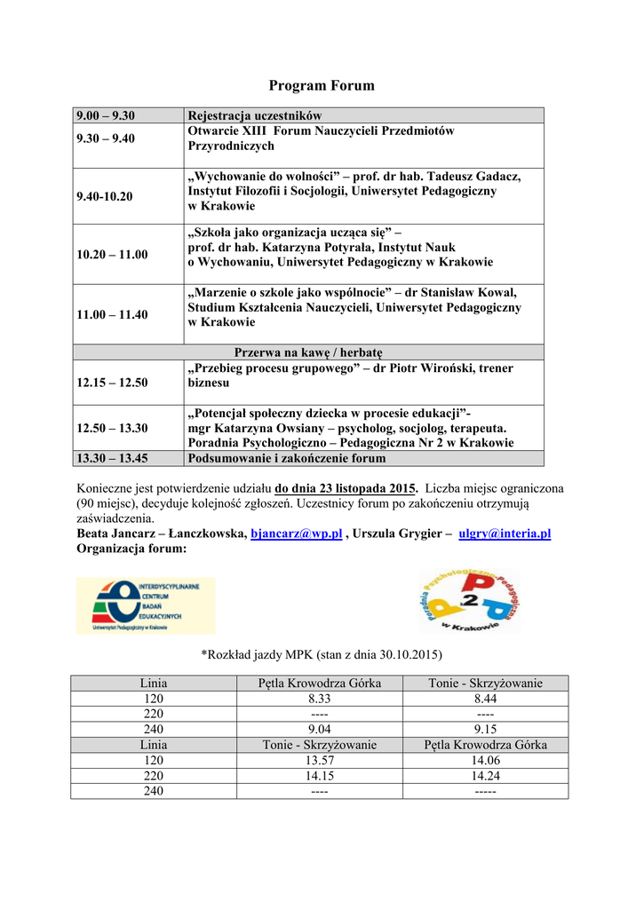 Program Forum 9.00 – 9.30 Rejestracja uczestników Otwarcie XIII Forum Nauczycieli Przedmiotów Przyrodniczych 9.30 – 9.40 „Wychowanie do wolności” – prof. dr hab. Tadeusz Gadacz, Instytut Filozofii i Socjologii, Uniwersytet Pedagogiczny w Krakowie 9.40-10.20 10.20 – 11.00 11.00 – 11.40 12.15 – 12.50 12.50 – 13.30 13.30 – 13.45 „Szkoła jako organizacja ucząca się” – prof. dr hab. Katarzyna Potyrała, Instytut Nauk o Wychowaniu, Uniwersytet Pedagogiczny w Krakowie „Marzenie o szkole jako wspólnocie” – dr Stanisław Kowal, Studium Kształcenia Nauczycieli, Uniwersytet Pedagogiczny w Krakowie Przerwa na kawę / herbatę „Przebieg procesu grupowego” – dr Piotr Wiroński, trener biznesu „Potencjał społeczny dziecka w procesie edukacji”mgr Katarzyna Owsiany – psycholog, socjolog, terapeuta. Poradnia Psychologiczno – Pedagogiczna Nr 2 w Krakowie Podsumowanie i zakończenie forum Konieczne jest potwierdzenie udziału do dnia 23 listopada 2015. Liczba miejsc ograniczona (90 miejsc), decyduje kolejność zgłoszeń. Uczestnicy forum po zakończeniu otrzymują zaświadczenia. Beata Jancarz – Łanczkowska, [email protected] , Urszula Grygier – [email protected] Organizacja forum: *Rozkład jazdy MPK (stan z dnia 30.10.2015) Linia 120 220 240 Linia 120 220 240 Pętla Krowodrza Górka 8.33 ---9.04 Tonie - Skrzyżowanie 13.57 14.15 ---- Tonie - Skrzyżowanie 8.44 ---9.15 Pętla Krowodrza Górka 14.06 14.24 -----