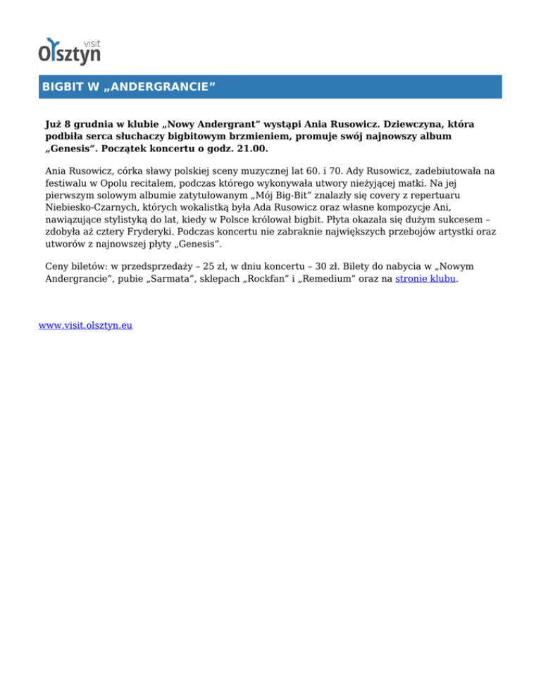 BIGBIT W „ANDERGRANCIE” Już 8 grudnia w klubie „Nowy Andergrant” wystąpi Ania Rusowicz. Dziewczyna, która podbiła serca słuchaczy bigbitowym brzmieniem, promuje swój najnowszy album „Genesis”. Początek koncertu o godz. 21.00. Ania Rusowicz, córka sławy polskiej sceny muzycznej lat 60. i 70. Ady Rusowicz, zadebiutowała na festiwalu w Opolu recitalem, podczas którego wykonywała utwory nieżyjącej matki. Na jej pierwszym solowym albumie zatytułowanym „Mój Big-Bit” znalazły się covery z repertuaru Niebiesko-Czarnych, których wokalistką była Ada Rusowicz oraz własne kompozycje Ani, nawiązujące stylistyką do lat, kiedy w Polsce królował bigbit. Płyta okazała się dużym sukcesem – zdobyła aż cztery Fryderyki. Podczas koncertu nie zabraknie największych przebojów artystki oraz utworów z najnowszej płyty „Genesis”. Ceny biletów: w przedsprzedaży – 25 zł, w dniu koncertu – 30 zł. Bilety do nabycia w „Nowym Andergrancie”, pubie „Sarmata”, sklepach „Rockfan” i „Remedium” oraz na stronie klubu. www.visit.olsztyn.eu