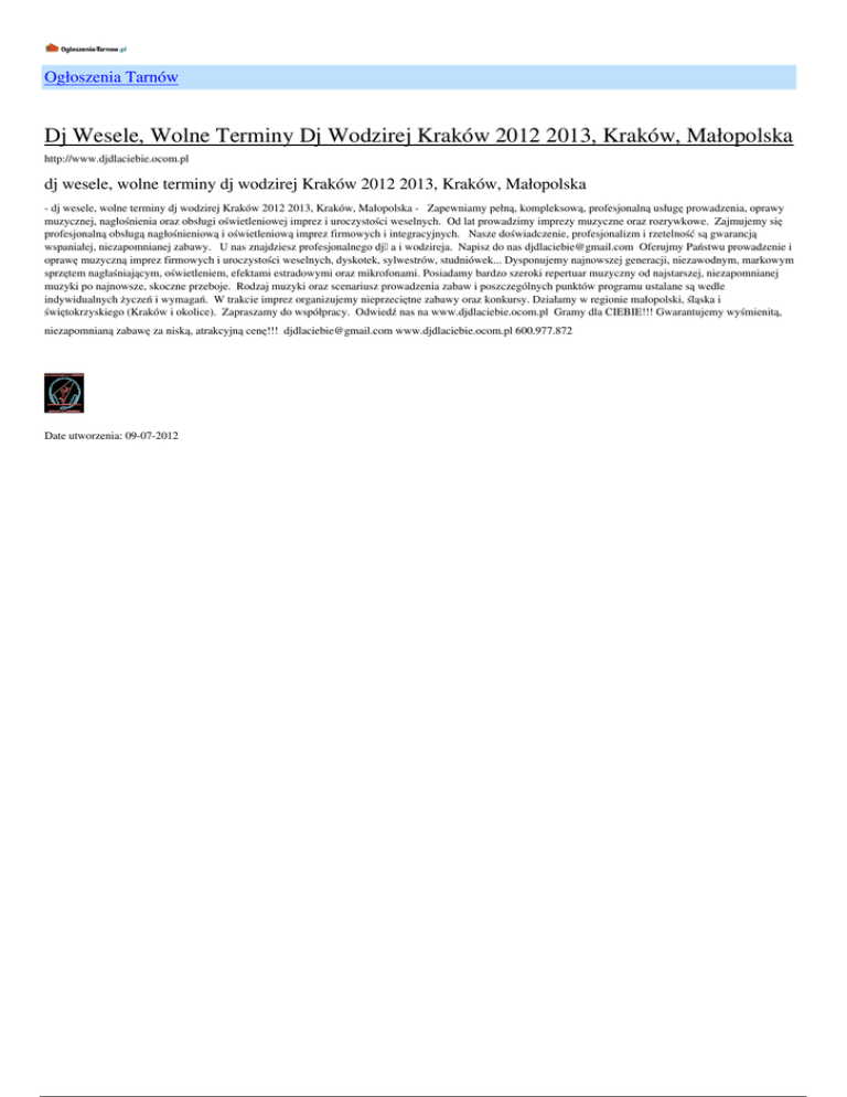 Ogłoszenia Tarnów Dj Wesele, Wolne Terminy Dj Wodzirej Kraków 2012 2013, Kraków, Małopolska http://www.djdlaciebie.ocom.pl dj wesele, wolne terminy dj wodzirej Kraków 2012 2013, Kraków, Małopolska - dj wesele, wolne terminy dj wodzirej Kraków 2012 2013, Kraków, Małopolska - Zapewniamy pełną, kompleksową, profesjonalną usługę prowadzenia, oprawy muzycznej, nagłośnienia oraz obsługi oświetleniowej imprez i uroczystości weselnych. Od lat prowadzimy imprezy muzyczne oraz rozrywkowe. Zajmujemy się profesjonalną obsługą nagłośnieniową i oświetleniową imprez firmowych i integracyjnych. Nasze doświadczenie, profesjonalizm i rzetelność są gwarancją wspaniałej, niezapomnianej zabawy. U nas znajdziesz profesjonalnego dja i wodzireja. Napisz do nas [email protected] Oferujmy Państwu prowadzenie i oprawę muzyczną imprez firmowych i uroczystości weselnych, dyskotek, sylwestrów, studniówek... Dysponujemy najnowszej generacji, niezawodnym, markowym sprzętem nagłaśniającym, oświetleniem, efektami estradowymi oraz mikrofonami. Posiadamy bardzo szeroki repertuar muzyczny od najstarszej, niezapomnianej muzyki po najnowsze, skoczne przeboje. Rodzaj muzyki oraz scenariusz prowadzenia zabaw i poszczególnych punktów programu ustalane są wedle indywidualnych życzeń i wymagań. W trakcie imprez organizujemy nieprzeciętne zabawy oraz konkursy. Działamy w regionie małopolski, śląska i świętokrzyskiego (Kraków i okolice). Zapraszamy do współpracy. Odwiedź nas na www.djdlaciebie.ocom.pl Gramy dla CIEBIE!!! Gwarantujemy wyśmienitą, niezapomnianą zabawę za niską, atrakcyjną cenę!!! [email protected] www.djdlaciebie.ocom.pl 600.977.872 Date utworzenia: 09-07-2012