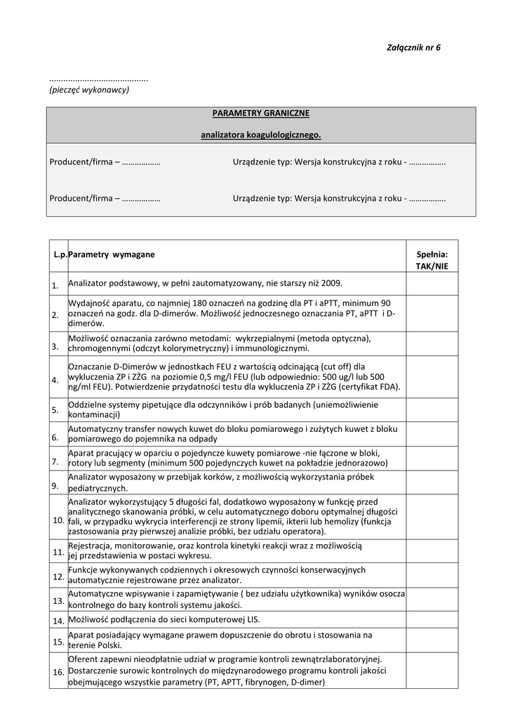 Załącznik nr 6 .......................................... (pieczęć wykonawcy) PARAMETRY GRANICZNE analizatora koagulologicznego. Producent/firma – ……………… Urządzenie typ: Wersja konstrukcyjna z roku ‐ …………….. Producent/firma – ……………… Urządzenie typ: Wersja konstrukcyjna z roku ‐ …………….. L.p. Parametry wymagane 1. Analizator podstawowy, w pełni zautomatyzowany, nie starszy niż 2009. Wydajność aparatu, co najmniej 180 oznaczeń na godzinę dla PT i aPTT, minimum 90 2. oznaczeń na godz. dla D‐dimerów. Możliwość jednoczesnego oznaczania PT, aPTT i D‐ dimerów. Możliwość oznaczania zarówno metodami: wykrzepialnymi (metoda optyczna), 3. chromogennymi (odczyt kolorymetryczny) i immunologicznymi. Oznaczanie D‐Dimerów w jednostkach FEU z wartością odcinającą (cut off) dla 4. wykluczenia ZP i ZŻG na poziomie 0,5 mg/l FEU (lub odpowiednio: 500 ug/l lub 500 ng/ml FEU). Potwierdzenie przydatności testu dla wykluczenia ZP i ZŻG (certyfikat FDA). Oddzielne systemy pipetujące dla odczynników i prób badanych (uniemożliwienie kontaminacji) Automatyczny transfer nowych kuwet do bloku pomiarowego i zużytych kuwet z bloku 6. pomiarowego do pojemnika na odpady Aparat pracujący w oparciu o pojedyncze kuwety pomiarowe ‐nie łączone w bloki, 7. rotory lub segmenty (minimum 500 pojedynczych kuwet na pokładzie jednorazowo) Analizator wyposażony w przebijak korków, z możliwością wykorzystania próbek 9. pediatrycznych. Analizator wykorzystujący 5 długości fal, dodatkowo wyposażony w funkcję przed analitycznego skanowania próbki, w celu automatycznego doboru optymalnej długości 10. fali, w przypadku wykrycia interferencji ze strony lipemii, ikterii lub hemolizy (funkcja zastosowania przy pierwszej analizie próbki, bez udziału operatora). 5. Spełnia: TAK/NIE Rejestracja, monitorowanie, oraz kontrola kinetyki reakcji wraz z możliwością 11. jej przedstawienia w postaci wykresu. Funkcje wykonywanych codziennych i okresowych czynności konserwacyjnych 12. automatycznie rejestrowane przez analizator. Automatyczne wpisywanie i zapamiętywanie ( bez udziału użytkownika) wyników osocza 13. kontrolnego do bazy kontroli systemu jakości. 14. Możliwość podłączenia do sieci komputerowej LIS. Aparat posiadający wymagane prawem dopuszczenie do obrotu i stosowania na 15. terenie Polski. Oferent zapewni nieodpłatnie udział w programie kontroli zewnątrzlaboratoryjnej. 16. Dostarczenie surowic kontrolnych do międzynarodowego programu kontroli jakości obejmującego wszystkie parametry (PT, APTT, fibrynogen, D‐dimer) 17. Automatyczna kalibracja. Graficzne przedstawienie lokalizacji poszczególnych odczynników wraz z 18. monitorowaniem ich objętości z przeliczeniem na ilość testów pozostałych do wykonania Automatyczne powtarzanie pomiaru w przypadku wystąpienia wyników budzących 19. wątpliwości i wyników poza liniowością metody. Wewnętrzny czytnik kodów kreskowych umożliwiający identyfikacje załadowanych na 20. pokład analizatora próbek pacjentów i odczynników. Instalacja, uruchomienie analizatora i szkolenie personelu w laboratorium w zakresie 21. obsługi oraz interpretacji wyników na koszt wykonawcy W zestawie UPS podtrzymujący pracę analizatora w przypadku braku napięcia przez 22. min. 30 minut Wymagania wobec aparatu zastępczego. Aparat fabrycznie nowy, nie starszy niż 2016 r. Kompaktowy manualny analizator do wykonywania oznaczeń z wykorzystaniem metod 23. wykrzepiania. 24. Wykaz parametrów możliwych do oznaczenia na aparacie : PT, APTT. Analizator pracujący na tych samych odczynnikach do oznaczania PT i APTT co 25. analizator podstawowy. Instalacja, uruchomienie analizatora i szkolenie personelu w laboratorium w zakresie 26 obsługi oraz interpretacji wyników na koszt wykonawcy Wymagania wobec odczynników. Wymagany odczynnik do PT w oparciu o tromboplastynę ludzką o ISI 1,0 ± 0,1; Do 27. kontroli oznaczeń D‐Dimer – 2 poziomy kontroli: patologiczna – z wartościami śr. powyżej cut off, oraz prawidłowa – z wartościami poniżej cut off. Stabilność odczynników na pokładzie dla oznaczeń podstawowych: PT, PTT i 28. Fibrynogen: 4 dni. Wymagany odczynnik do PT w oparciu o tromboplastynę ludzką, pochodzenia 29. łożyskowego o ISI 1,0±0,1. 30. Zakres oznaczania fibrynogenu 0,3 do 9,0 g/l. Materiały standardowe, osocza kontrolne: mianowane ,pochodzenia ludzkiego, 31. liofilizowane z możliwością zamrażania (gwarancja producenta). Wyposażenie dodatkowe. Wykonawca zobowiązany jest dostarczyć na czas trwania umowy: a) klimatyzator zewnętrzny do pomieszczenia o wielkości 9m2, potrzebny do prawidłowej pracy analizatora, b) wirówkę MPW – 223E, c) zestaw komputerowy z oprogramowaniem niezbędny do pracy analizatora, d) stół pod analizator podstawowy , w przypadku gdy analizator jest aparatem nastołowym, e) witrynę chłodniczą przeszkloną, drzwi przesuwne, o poj. 1200 l z wyświetlaczem temperatury firmy Bolarus lub innej o parametrach nie słabszych niż wymieniono powyżej. f) Chłodziarko‐zamrażarkę. Pojemność komory chłodniczej min. 221l, pojemność zamrażarki min. 85 l firmy Liebherr lub innej o parametrach nie gorszych niż wymieniono powyżej. Powyższe wymagania należy podeprzeć oficjalnymi dokumentami, typu: opublikowana broszura, ulotka specyfikacyjna, ulotka odczynnikowa, dokument prawny lub wyciąg z instrukcji – dostarczonymi na żądanie zamawiającego. UWAGA! Warunki opisane w kolumnie „Parametry wymagane” stanowią minimum, które sprzęt oferowany przez Wykonawcę musi spełnić. Nie wypełnienie rubryki „TAK/NIE” będzie traktowane jako niespełnienie wymagań Zamawiającego. Oferty, które nie spełnią ww. wymagań zostaną odrzucone jako niezgodne ze Specyfikacją istotnych warunków zamówienia. OCENA PARAMETRÓW TECHNICZNYCH Lp. 1 Oceniane parametry techniczne analizatorów Odczynnik do APTT ciekły 