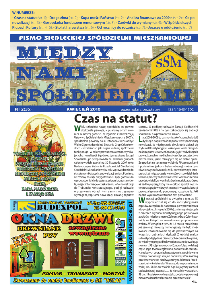 W NUMERZE: - Czas na statut (str. 1); - Droga zima (str. 2); - Kupa mości Państwo (str. 2); - Analiza finansowa za 2009 r. (str. 2); - Co po nowelizacji (str. 3); - Gospodarka funduszem remontowym (str. 3); - Żarówki do wymiany (str. 4); - W Spółdzielczych Klubach Kultury (str. 4 i 5); - Sto lat harcerstwa (str. 6); - Od rocznicy do rocznicy (str. 7); - Jeszcze o oddłużeniu (str. 7) Czas na statut? W Wszelkiej POMYŚLNOŚCI, z okazji Świąt Wielkanocnych, wszystkim Członkom Siedleckiej Spółdzielni Mieszkaniowej życzą Rada Nadzorcza i Zarząd SSM MIĘDZY NAMI SPÓŁDZIELCAMI ielu członków naszej spółdzielni na pewno doskonale pamięta, – pisaliśmy o tym również w naszej gazecie- że zgodnie z nowelizacją Ustawy o Spółdzielniach Mieszkaniowych z 2007 r. spółdzielnie powinny do 30 listopada 2007 r. odbyć Walne Zgromadzenia lub Zebrania Grup Członkowskich - w zależności jaki organ w danej spółdzielni funkcjonuje- w celu wprowadzenia zmian wynikających z nowelizacji. Zgodnie z tym zapisem, Zarząd Spółdzielni, po przeprowadzeniu zebrań w grupach członkowskich zwołał na 30 listopada 2007 roku Nadzwyczajne Zebranie Przedstawicieli Siedleckiej Spółdzielni Mieszkaniowej w celu wprowadzenia do statutu wynikających z nowelizacji zmian. Pomimo, że zmiany zostały przygotowane i były gotowe do wprowadzenia ich do statutu, zebrani przedstawiciele, mając informację o zaskarżeniu w/w nowelizacji do Trybunału Konstytucyjnego, podjęli uchwałę o przerwaniu obrad i tym samym wstrzymano wymaganą zapisami nowelizacji zmianę zapisów KWIECIEŃ 2010 statutu. O podjętej uchwale Zarząd Spółdzielni zawiadomił KRS i na tym zakończyły się zabiegi spółdzielni o wprowadzenie zmian. ata 2008-2009 to pasmo niezakończonych do dziś dyskusji o poprawności zapisów we wspomnianej nowelizacji. W międzyczasie dwukrotnie zbierał się Trybunał Konstytucyjny i wskazywał wiele niezgodności zapisów ustawy z Konstytucją RP. W dyskusjach prowadzonych w mediach usłyszeć i przeczytać było można wiele, jakże różniących się od siebie opinii. Ze spotkań na ten temat w Sejmie RP z prawnikami i posłami (na jednym byłem obecny) można było również wysnuć wniosek, że ilu prawników, tyle interpretacji. W między czasie w niektórych spółdzielniach toczono procesy sądowe (na temat ważności zebrań przedstawicieli), w wyniku których musiał zabrać głos aż Sąd Najwyższy, który nie w całości zgodził się z interpretacją sądów niższych instancji i w wyniku kasacji przekazał sprawę do ponownego rozpatrzenia. Jaki będzie wynik rozpraw trudno dziś przewidzieć. naszej spółdzielni w związku z tym, że TK wypowiedział się co do konstytucyjności zapisów, zarząd i rada nadzorcza, po wprowadzeniu (do projektu z listopada 2007r) zmian wynikających z orzeczeń Trybunał Konstytucyjnego postanowili zwołać w miesiącu marcu Zebrania Grup Członkowskich, na których zaprezentowano proponowane zmiany. W związku z tym, że 12 marca musieliśmy już zamknąć niniejszy numer gazety nie było możliwości ustosunkowania się do prowadzonych na wszystkich zebraniach dyskusji. Z krótkiej analizy uchwał podjętych na pierwszych zebraniach wynika, że w jednym przypadku kwestionowano (powołując się na art. 58 kc) prawomocność zebrań, lecz w dalszej części jego trwania zgłaszano poprawki do statutu. Na odbytych zebraniach pozytywnie zaopiniowano zmiany, proponując kolejne poprawki, które zostaną przedstawione na Nadzwyczajnym Zebraniu Przedstawicieli w kwietniu br. Wracając do wspomnianego wyżej art. 58 kc, to właśnie Sąd Najwyższy zarzucił sądowi niższej instancji, „... że nietrafnie wskazał art. 58 par. 1 kodeksu cywilnego jako podstawę rzekomej nieważności uchwał zebrania przedstawicieli." H.Ł.1 L W Aktualności Droga zima Kupa… mości Państwo! W jednym z ostatnich numerów Gazety Stołecznej przeczytałem „- Nie chcemy, by Warszawa utonęła w g…… - złorzeczą matki małych dzieci, które wracają ubabrane ze spacerów.” Niestety, tak samo jest w Siedlcach. Dużą sztuką jest przejść przez plac, czy trawnik, by nie wdepnąć w psią kupę. Niektórzy z „mieszczuchów” zapomnieli, że plac zabaw, czy trawnik pod blokiem, to nie podwórko w zagrodzie, po którym chodzą tylko sami i to co ewentualnie z podwórka zaniosą co najwyżej do swojego domu. Kiedy zwróciłem uwagę jednemu z posiadaczy czworonoga, gdy jego pupil załatwiał się na osiedlowym trawniku, to usłyszałem „od…..rz się pan, albo załatw pan żeby były za darmo (jak podobno w innych miastach) zestawy do sprzątania i pojemniki, do których mógłbym to wyrzucić” Niestety - trochę racji miał. Choć nie do końca, gdyż na wielu osiedlach są miejsca wyznaczone dla psich spacerów, są również osiedlowe śmietniki, do których można sprzątniętą kupę wyrzucić. Ponoć dla chętnego nic trudnego. Tylko trzeba proszę Pana chcieć. Myślę, że duże pole do popisu mają tu niektóre służby miejskie, gdyż Przyszła w grudniu, taka prawdziwa, tuż po Świętach Bożego Narodzenia. Jak podają meteorolodzy, była to najbardziej sroga zima od 31 lat, czyli od pamiętnej zimy, nazwanej „stulecia” w 1979r. Nie ulega wątpliwości, że zima ta przysporzyła nam mieszkańcom spółdzielczych zasobów, wiele kłopotów – szczególnie zmotoryzowanym – jak również spowodowała wiele dodatkowych wydatków, które spółdzielnia musiała ponieść. Według wstępnych wyliczeń, na usuwanie skutków tej najdłuższej od wielu lat zimy spółdzielnia wydała dodatkowo ponad 200 tys. zł. Na pewno nie wszyscy byliśmy zadowoleni z pracy poszczególnych administracji w tym trudnym okresie, ale w porównaniu z niektórymi ulicami miejskimi, nasze osiedlowe wyglądały przyzwoicie. Wielu naszym mieszkańcom dały się we znaki przeciekające dachy, ale w miarę posiadanych środków i możliwości służby spó