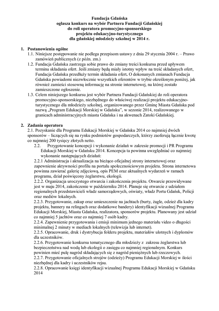 Fundacja Gdańska ogłasza konkurs na wybór Partnera Fundacji Gdańskiej do roli operatora promocyjno-sponsorskiego projektu edukacyjno-turystycznego dla gdańskiej młodzieży szkolnej w 2014 r. 1. Postanowienia ogólne 1.1. Niniejsze postępowanie nie podlega przepisom ustawy z dnia 29 stycznia 2004 r. – Prawo zamówień publicznych (z późn. zm.) 1.2. Fundacja Gdańska zastrzega sobie prawo do zmiany treści konkursu przed upływem terminu składania ofert. Jeśli zmiany będą miały istotny wpływ na treść składanych ofert, Fundacja Gdańska przedłuży termin składania ofert. O dokonanych zmianach Fundacja Gdańska powiadomi niezwłocznie wszystkich oferentów w trybie określonym poniżej, jak również zamieści stosowną informację na stronie internetowej, na której zostało zamieszczone ogłoszenie. 1.3. Celem niniejszego konkursu jest wybór Partnera Fundacji Gdańskiej do roli operatora promocyjno-sponsorskiego, niezbędnego do właściwej realizacji projektu edukacyjnoturystycznego dla młodzieży szkolnej, organizowanego przez Gminę Miasta Gdańska pod nazwą „Program Edukacji Morskiej w Gdańsku”, w sezonie 2014, realizowanego w granicach administracyjnych miasta Gdańska i na akwenach Zatoki Gdańskiej. 2. Zadania operatora 2.1. Pozyskanie dla Programu Edukacji Morskiej w Gdańsku 2014 co najmniej dwóch sponsorów – liczących się na rynku podmiotów gospodarczych, którzy zaoferują łącznie kwotę co najmniej 200 tysięcy złotych netto. 2.2. Przygotowanie koncepcji i wykonanie działań w zakresie promocji i PR Programu Edukacji Morskiej w Gdańsku 2014. Koncepcja ta powinna uwzględniać co najmniej wykonanie następujących działań: 2.2.1 Administracja i aktualizacja na bieżąco oficjalnej strony internetowej oraz zapewnienie aktywności profilu na portalu społecznościowym projektu. Strona internetowa powinna zawierać galerię zdjęciową, opis PEM oraz aktualnych wydarzeń w ramach programu, dział poświęcony żeglarstwu, ekologii. 2.2.2. Organizacja uroczystego otwarcia i zakończenia projektu. Otwarcie przewidywane jest w maju 2014, zakończenie w październiku 2014. Planuje się otwarcie z udziałem regionalnych przedstawicieli władz samorządowych, oświaty, władz Portu Gdańsk, Policji oraz mediów lokalnych. 2.2.3. Przygotowanie, zakup oraz umieszczenie na jachtach (burty, żagle, odzież dla kadry projektu, bannery na relingach oraz dodatkowe bandery) identyfikacji wizualnej Programu Edukacji Morskiej, Miasta Gdańska, realizatora, sponsorów projektu. Planowany jest udział co najmniej 5 jachtów oraz co najmniej 7 osób kadry. 2.2.4. Zapewnienie przygotowania i emisji minimum jednego materiału video o długości minimalnej 2 minuty w mediach lokalnych (telewizja lub internet). 2.2.5. Opracowanie, druk i dystrybucja folderu projektu, materiałów ulotnych i dyplomów dla uczestników. 2.2.6. Przygotowanie konkursu tematycznego dla młodzieży z zakresu żeglarstwa lub bezpieczeństwa nad wodą lub ekologii o zasięgu co najmniej regionalnym. Konkurs powinien mieć pulę nagród składających się z nagród pieniężnych lub rzeczowych. 2.2.7. Przygotowanie oficjalnych strojów (odzieży) Programu Edukacji Morskiej w ilości niezbędnej dla kadry i uczestników rejsu. 2.2.8. Opracowanie księgi identyfikacji wizualnej Programu Edukacji Morskiej w Gdańsku 2014 3. Opis operatora: 3.1.Operator musi prowadzić działalność gospodarczą w dziedzinie marketingu, promocji, reklamy, PR lub pokrewnym od co najmniej 3 lat. 3.2.Operator musi być płatnikiem podatku VAT. 3.3.Operator musi posiadać udokumentowane doświadczenie w realizacji usług polegających na realizacji usługi promocji marki (minimum 2 usługi). 4. Warunki współpracy 4.1.Koszty wszystkich działań wymienionych w pkt. 2 ponosić będzie operator ze środków pozyskanych od sponsorów na podstawie odrębnie zawartych umów. Do ww. kosztów zalicza się również nabywanie praw autorskich. 4.2.Fundacja Gdańska nie przewiduje bezpośredniego zawierania umów ze sponsorami. 4.3.Operator będzie wykonywać swoje obowiązki w imieniu i na rzecz Fundacji Gdańskiej, pod nadzorem osób wyznaczonych przez Fundację w oparciu o umowę. 4.4.Fundacja Gdańska w okresach od dnia zawarcia umowy do 27.06.2014 r. oraz od 5.09.2014 r. do 16.10.2014 r. udostępni operatorowi na wyłączność nośniki, o których mowa w pkt 2.2.3. powyżej. Przy czym dokładny harmonogram udostępnienia nośników zostanie uzgodniony w dniu podpisania umowy. 4.5.Fundacja Gdańska w okresie od dnia zawarcia umowy do 17.10.2014 r. udostępni operatorowi na wyłączność prawo do posługiwania się marką Programu Edukacji Morskiej w zakresie promocji, PR i świadczeń realizowanych dla sponsorów. 4.6.Operator zobowiązany będzie do umieszczania we wszystkich publikacjach papierowych i elektronicznych, materiałach promocyjnych oraz identyfikacji wizualnej na jachtach, a także na oficjalnych strojach (odzieży) projektu: logo Miasta Gdańska wraz z logo Programu Edukacji Morskiej w Gdańsku, logo realizatora, logo sponsorów Programu, logo partnerów Programu 5. Opłata za udział w projekcie 5.1.Operator będzie płacił Fundacji Gdańskiej czynsz za prawo do posługiwania się marką Programu Edukacji Morskiej w Gdańsku 2014 oraz wykorzystanie powierzchni reklamowej na burtach i żaglach jachtów, odzieży dla kadry projektu, bannerach na relingach oraz dodatkowych banderach jachtów biorących udział w PEM, do celów realizacji kampanii promocyjnej, o której mowa w pkt. 2.2, w tym również realizacji świadczeń dla pozyskanych sponsorów. 5.2.Kwota czynszu wyrażona w kwocie netto będzie przedmiotem oferty złożonej przez operatora. 5.3.Propozycja sposobu płatności czynszu będzie przedmiotem oferty złożonej przez operatora. 6. Składanie ofert. 6.1.Pisemne oferty w zamkniętych kopertach z napisem: „Konkurs na wybór Partnera Fundacji Gdańskiej do roli operatora promocyjno-sp