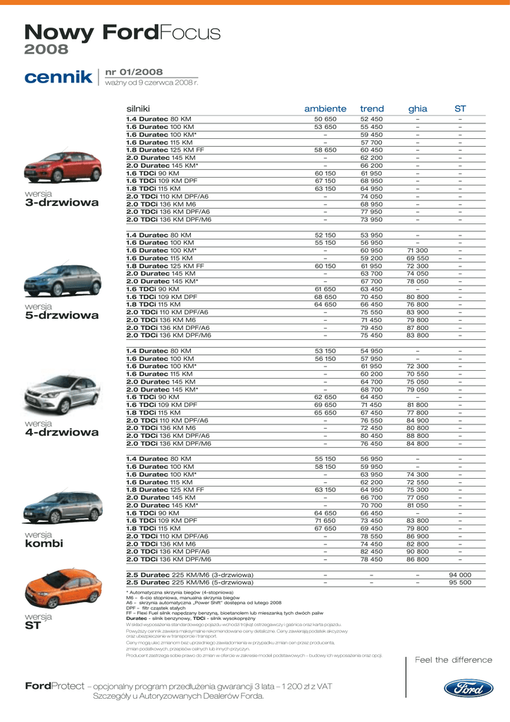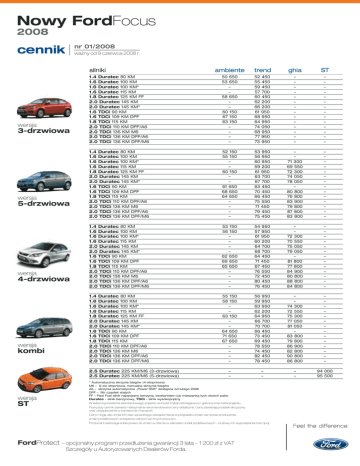 Nowy FordFocus 2008 nr 01/2008 cennik wa˝ny od 9 czerwca 2008 r. silniki wersja 3-drzwiowa wersja 5-drzwiowa wersja 4-drzwiowa wersja kombi ambiente trend ghia ST 1.4 Duratec 80 KM 1.6 Duratec 100 KM 1.6 Duratec 100 KM* 1.6 Duratec 115 KM 1.8 Duratec 125 KM FF 2.0 Duratec 145 KM 2.0 Duratec 145 KM* 1.6 TDCi 90 KM 1.6 TDCi 109 KM DPF 1.8 TDCi 115 KM 2.0 TDCi 110 KM DPF/A6 2.0 TDCi 136 KM M6 2.0 TDCi 136 KM DPF/A6 2.0 TDCi 136 KM DPF/M6 50 650 53 650 – – 58 650 – – 60 150 67 150 63 150 – – – – 52 450 55 450 59 450 57 700 60 450 62 200 66 200 61 950 68 950 64 950 74 050 68 950 77 950 73 950 – – – – – – – – – – – – – – – – – – – – – – – – – – – – 1.4 Duratec 80 KM 1.6 Duratec 100 KM 1.6 Duratec 100 KM* 1.6 Duratec 115 KM 1.8 Duratec 125 KM FF 2.0 Duratec 145 KM 2.0 Duratec 145 KM* 1.6 TDCi 90 KM 1.6 TDCi 109 KM DPF 1.8 TDCi 115 KM 2.0 TDCi 110 KM DPF/A6 2.0 TDCi 136 KM M6 2.0 TDCi 136 KM DPF/A6 2.0 TDCi 136 KM DPF/M6 52 150 55 150 – – 60 150 – – 61 650 68 650 64 650 – – – – 53 950 56 950 60 950 59 200 61 950 63 700 67 700 63 450 70 450 66 450 75 550 71 450 79 450 75 450 – – 71 300 69 550 72 300 74 050 78 050 – 80 800 76 800 83 900 79 800 87 800 83 800 – – – – – – – – – – – – – – 1.4 Duratec 80 KM 1.6 Duratec 100 KM 1.6 Duratec 100 KM* 1.6 Duratec 115 KM 2.0 Duratec 145 KM 2.0 Duratec 145 KM* 1.6 TDCi 90 KM 1.6 TDCi 109 KM DPF 1.8 TDCi 115 KM 2.0 TDCi 110 KM DPF/A6 2.0 TDCi 136 KM M6 2.0 TDCi 136 KM DPF/A6 2.0 TDCi 136 KM DPF/M6 53 150 56 150 – – – – 62 650 69 650 65 650 – – – – 54 950 57 950 61 950 60 200 64 700 68 700 64 450 71 450 67 450 76 550 72 450 80 450 76 450 – – 72 300 70 550 75 050 79 050 – 81 800 77 800 84 900 80 800 88 800 84 800 – – – – – – – – – – – – – 1.4 Duratec 80 KM 1.6 Duratec 100 KM 1.6 Duratec 100 KM* 1.6 Duratec 115 KM 1.8 Duratec 125 KM FF 2.0 Duratec 145 KM 2.0 Duratec 145 KM* 1.6 TDCi 90 KM 1.6 TDCi 109 KM DPF 1.8 TDCi 115 KM 2.0 TDCi 110 KM DPF/A6 2.0 TDCi 136 KM M6 2.0 TDCi 136 KM DPF/A6 2.0 TDCi 136 KM DPF/M6 55 150 58 150 – – 63 150 – – 64 650 71 650 67 650 – – – – 56 950 59 950 63 950 62 200 64 950 66 700 70 700 66 450 73 450 69 450 78 550 74 450 82 450 78 450 – – 74 300 72 550 75 300 77 050 81 050 – 83 800 79 800 86 900 82 800 90 800 86 800 – – – – – – – – – – – – – – – – – – – – 94 000 95 500 2.5 Duratec 225 KM/M6 (3-drzwiowa) 2.5 Duratec 225 KM/M6 (5-drzwiowa) wersja ST * Automatyczna skrzynia biegów (4-stopniowa) M6 – 6–cio stopniowa, manualna skrzynia biegów A6 – skrzynia automatyczna „Power Shift” dost´pna od lutego 2008 DPF – filtr czàstek sta∏ych FF – Flexi Fuel silnik nap´dzany benzynà, bioetanolem lub mieszankà tych dwóch paliw Duratec - silnik benzynowy, TDCi - silnik wysokopr´˝ny W sk∏ad wyposa˝enia standardowego pojazdu wchodzi trójkàt ostrzegawczy i gaÊnica oraz karta pojazdu. Powy˝szy cennik zawiera maksymalne rekomendowane ceny detaliczne. Ceny zawierajà podatek akcyzowy oraz ubezpieczenie w transporcie i transport. Ceny mogà ulec zmianom bez uprzedniego zawiadomienia w przypadku zmian cen przez producenta, zmian podatkowych, przepisów celnych lub innych przyczyn. Producent zastrzega sobie prawo do zmian w ofercie w zakresie modeli podstawowych – budowy ich wyposa˝enia oraz opcji. FordProtect – opcjonalny program przed∏u˝enia gwarancji 3 lata – 1 200 z∏ z VAT Szczegó∏y u Autoryzowanych Dealerów Forda. Nowy FordFocus 2008 wyposa˝enie bezpieczeƒstwo Poduszki powietrzne czo∏owe kierowcy i pasa˝era iente ambs Boczne poduszki powietrzne kierowcy i pasa˝era(12) Boczne kurtyny powietrzne(15, 16, 17) Boczne kurtyny powietrzne i poduszki boczne(12) Przednie Êwiat∏a przeciwmgielne(16) Spryskiwacze reflektorów System reflektorów adaptacyjnych (dla wersji 3–,5–drzwiowych i kombi, tylne Êwiat∏a w technologii LED) Lampy ksenonowe z samocz.reg.kàta ustawienia i spryskiwaczami i lampami przeciwmgielnymi (wersja 4–drzwiowa) Lampy ksenonowe z samocz.reg.kàta ustawienia i spryskiwaczami i lampami przeciwmgielnymi, tylne Êwiat∏a w technologii LED (wersje 3–,5–drzwi i kombi) System kontroli ciÊnienia w ogumieniu System ABS (z EBD) Elektroniczny uk∏ad ESP z uk∏adem przeciwpoÊlizgowym TCS + EBA d tren ghia ST 1 100 – 2600 800 900 s s 1500 – 800 900 s s 1500 – s 900 s s s – s 900 – 1 900 1 900 1900 3 600 3 600 2 800 – 3 800 2 000 s s 3 800 2 000 s s 3 000 2 000 s s 3 000 2 000 s s s s 4 500 2 500(9) / 7 000 100 800 s s s s 2 500 s s s s s s 2 500 – – s 1 000 – 1 000 1 400 s s s s s 1 400 s s 1 000 1 000 1 000 2 000 s 2 900 700 900 – 2 000 s 2 900 700 900 350 – s 2 900 – 900 – 700 2200 1 300 500 1 000 2 100 1 100 – 400 110 1 900 500 700 2 200 800 s 500 2 100 s 6 100 s 110 1 900 500 – – s s 500 2 100 – – s 110 – s 150 s s 700 – 150 s s 700 4 700 150 s s 700 2 800 150 s s 700 3 400 – 5 800 3 900 4 500 – 6 200 4 300 4 900 1 100 1 100 1 100 – – 1 500 1 500 1 500 komfort Wspomaganie kierownicy s Komputer pok∏adowy – Klimatyzacja(1, 14, 15, 16) 4 500 Klimatyzacja z automatycznà regulacjà temperatury(15, 16, 17) – Ch∏odzony schowek podr´czny – Podgrzewana przednia szyba(15, 16) – Elektrycznie sterowane szyby przednich drzwi s Elektrycznie sterowane szyby przednich drzwi – opuszczane i podnoszone jednym naciÊni´ciem przycisku i funkcjà ca∏kowitego otwierania i zamykania szyb(5) – Elektrycznie sterowane szyby przednich i tylnych drzwi – opuszczane i podnoszone jednym naciÊni´ciem przycisku i funkcjà ca∏kowitego otwierania i zamykania szyb(6) – Podgrzewane lusterka boczne 100 Lusterka boczne – sterowane elektrycznie s Lusterka boczne – sterowane i podgrzewane elektrycznie, obudowy w kolorze nadwozia, (7, 12) z lampkami oÊwietlajacymi pod∏o˝e – Lusterka boczne – sterowane i p