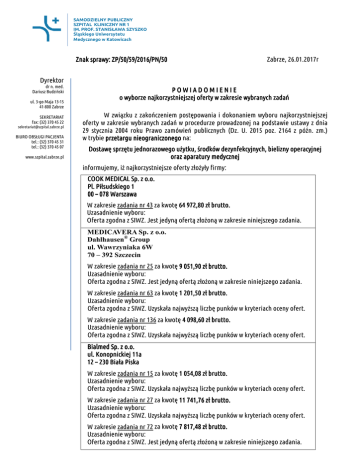 SAMODZIELNY PUBLICZNY SZPITAL KLINICZNY NR 1 IM. PROF. STANISŁAWA SZYSZKO Śląskiego Uniwersytetu Medycznego w Katowicach Znak sprawy: ZP/50/59/2016/PN/50 Zabrze, 26.01.2017r Dyrektor dr n. med. Dariusz Budziński ul. 3-go Maja 13-15 41-800 Zabrze SEKRETARIAT fax: (32) 370 45 22 [email protected] BIURO OBSŁUGI PACJENTA tel.: (32) 370 45 31 tel.: (32) 370 45 07 www.szpital.zabrze.pl POWIADOMIENIE o wyborze najkorzystniejszej oferty w zakresie wybranych zadań W związku z zakończeniem postępowania i dokonaniem wyboru najkorzystniejszej oferty w zakresie wybranych zadań w procedurze prowadzonej na podstawie ustawy z dnia 29 stycznia 2004 roku Prawo zamówień publicznych (Dz. U. 2015 poz. 2164 z późn. zm.) w trybie przetargu przetargu nieograniczonego na: operacyjnej cyjnej Dostawę sprzętu jednorazowego użytku, środków dezynfekcyjnych, bielizny opera oraz aparatury medycznej informujemy, iż najkorzystniejsze oferty złożyły firmy: COOK MEDICAL Sp. z o.o. Pl. Piłsudskiego 1 00 – 078 Warszawa W zakresie zadania nr 43 za kwotę 64 972,80 972,80 zł brutto. brutto. Uzasadnienie wyboru: Oferta zgodna z SIWZ. Jest jedyną ofertą złożoną w zakresie niniejszego zadania. MEDICAVERA Sp. z o.o. Dahlhausen® Group ul. Wawrzyniaka 6W 70 – 392 Szczecin W zakresie zadania nr 25 za kwotę 9 051,90 zł brutto. Uzasadnienie wyboru: Oferta zgodna z SIWZ. Jest jedyną ofertą złożoną w zakresie niniejszego zadania. W zakresie zadania nr 63 za kwotę 1 201,50 zł brutto. Uzasadnienie wyboru: Oferta zgodna z SIWZ. Uzyskała najwyższą liczbę punków w kryteriach oceny ofert. W zakresie zadania nr 136 za kwotę 4 098,60 zł brutto. Uzasadnienie wyboru: Oferta zgodna z SIWZ. Uzyskała najwyższą liczbę punków w kryteriach oceny ofert. Bialmed Sp. z o.o. ul. Konopnickiej 11a 12 – 230 Biała Piska W zakresie zadania nr 15 za kwotę 1 054,08 zł brutto. Uzasadnienie wyboru: Oferta zgodna z SIWZ. Uzyskała najwyższą liczbę punków w kryteriach oceny ofert. W zakresie zadania nr 27 za kwotę 11 741,76 zł brutto. Uzasadnienie wyboru: Oferta zgodna z SIWZ. Uzyskała najwyższą liczbę punków w kryteriach oceny ofert. W zakresie zadania nr 72 za kwotę 7 817,48 zł brutto. brutto. Uzasadnienie wyboru: Oferta zgodna z SIWZ. Jest jedyną ofertą złożoną w zakresie niniejszego zadania. Billmed Sp. z o.o. ul. Krypska 24/1 04 – 082 Warszawa W zakresie zadania nr 37 za kwotę 1 123,20 zł brutto. Uzasadnienie wyboru: Oferta zgodna z SIWZ. Uzyskała najwyższą liczbę punków w kryteriach oceny ofert. W zakresie zadania nr 41 za kwotę 16 632,00 zł brutto. Uzasadnienie wyboru: Oferta zgodna z SIWZ. Uzyskała najwyższą liczbę punków w kryteriach oceny ofert. W zakresie zadania nr 48 za kwotę 34 230,60 230,60 zł brutto. Uzasadnienie wyboru: Oferta zgodna z SIWZ. Uzyskała najwyższą liczbę punków w kryteriach oceny ofert. VYGON Polska Sp. z o.o. ul. Francuska 39/6 03 – 905 Warszawa W zakresie zadania nr 33 za kwotę 18 576,00 zł brutto. Uzasadnienie wyboru: Oferta zgodna z SIWZ. Jest jedyną ofertą złożoną w zakresie niniejszego zadania. W zakresie zadania nr 45 za kwotę 4 644,00 zł brutto. Uzasadnienie wyboru: Oferta zgodna z SIWZ. Jest jedyną ofertą złożoną w zakresie niniejszego zadania. W zakresie zadania nr 47 za kwotę 17 496,00 zł brutto. Uzasadnienie wyboru: Oferta zgodna z SIWZ. Jest jedyną ofertą złożoną w zakresie niniejszego zadania. W zakresie zadania nr 71 za kwotę 13 500,00 zł brutto. Uzasadnienie wyboru: Oferta zgodna z SIWZ. Jest jedyną ofertą złożoną w zakresie niniejszego zadania. SKAMEX Sp. z o.o. Sp. K. ul. Częstochowska 38/52 93 – 121 Łódź W zakresie zadania nr 4 za kwotę 149 796,00 zł brutto. Uzasadnienie wyboru: Oferta zgodna z SIWZ. Jest jedyną ofertą złożoną w zakresie niniejszego zadania. W zakresie zadania nr 34 za kwotę 2 214,00 zł brutto. Uzasadnienie wyboru: Oferta zgodna z SIWZ. Jest jedyną ofertą złożoną w zakresie niniejszego zadania. W zakresie zadania nr 44 za kwotę 7 668,00 zł brutto. Uzasadnienie wyboru: Oferta zgodna z SIWZ. Jest jedyną ofertą złożoną w zakresie niniejszego zadania. W zakresie zadania nr 49 za kwotę 5 832,00 zł brutto. Uzasadnienie wyboru: Oferta zgodna z SIWZ. Uzyskała najwyższą liczbę punków w kryteriach oceny ofert. W zakresie zadania nr 69 za kwotę 25 488,00 488,00 zł brutto. Uzasadnienie wyboru: Oferta zgodna z SIWZ. Jest jedyną ofertą złożoną w zakresie niniejszego zadania. 2 W zakresie zadania nr 76 za kwotę 3 942,00 zł brutto. Uzasadnienie wyboru: Oferta zgodna z SIWZ. Uzyskała najwyższą liczbę punków w kryteriach oceny ofert. POLMIL Sp. z o.o. S.K.A. ul. Przemysłowa 8 85 – 758 Bydgoszcz W zakresie zadania nr 40 za kwotę 8 888,40 zł brutto. Uzasadnienie wyboru: Oferta zgodna z SIWZ. Uzyskała najwyższą liczbę punków w kryteriach oceny ofert. W zakresie zadania nr 42 za kwotę 22 377,60 zł brutto. Uzasadnienie wyboru: Oferta zgodna z SIWZ. Uzyskała najwyższą liczbę punków w kryteriach oceny ofert. W zakresie zadania nr 61 za kwotę 97 783,20 zł brutto. Uzasadnienie wyboru: Oferta zgodna z SIWZ. Uzyskała najwyższą liczbę punków w kryteriach oceny ofert. W zakresie zadania nr 80 za kwotę 24 640,20 zł brutto. Uzasadnienie wyboru: Oferta zgodna z SIWZ. Uzyskała najwyższą liczbę punków w kryteriach oceny ofert. W zakresie zadania nr 133 za kwotę 4 167,72 zł brutto. Uzasadnienie wyboru: Oferta zgodna z SIWZ. Jest jedyną ofertą złożoną w zakresie niniejszego zadania. Dräger Polska Sp. z o.o. ul. Sułkowskiego 18a 85 – 655 Bydgoszcz W zakresie zadania nr 3 za kwotę 91 389,60 zł brutto. brutto. Uzasadnienie wyboru: Oferta zgodna z SIWZ. Jest jedyną ofertą złożoną w zakresie niniejszego zadania. Medtronic Poland Sp. z o.o. ul. Polna 11 00 – 633 Warszawa W zakresie zadania nr 16 za kwotę 122 914,80 zł brutto. Uzasadnienie wyboru: Oferta zgodna z SIWZ. Jest jedyną ofertą złożoną w zakresie niniejs