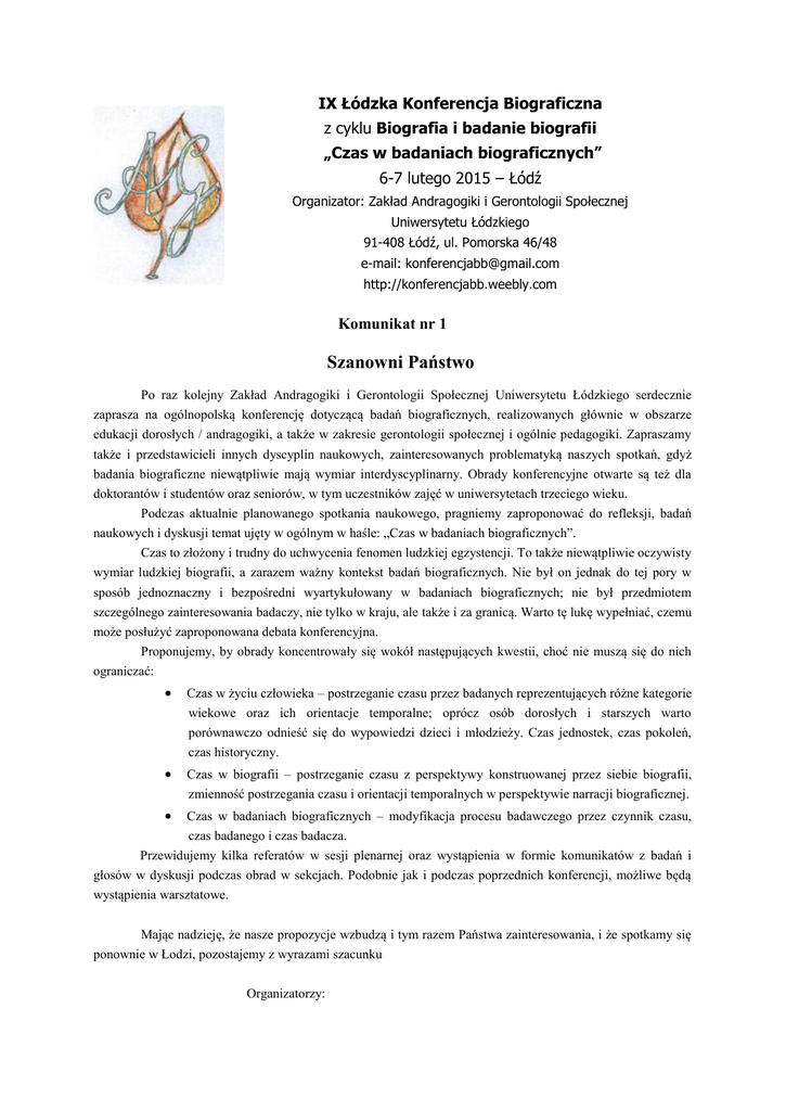 IX Łódzka Konferencja Biograficzna z cyklu Biografia i badanie biografii „Czas w badaniach biograficznych” 6-7 lutego 2015 – Łódź Organizator: Zakład Andragogiki i Gerontologii Społecznej Uniwersytetu Łódzkiego 91-408 Łódź, ul. Pomorska 46/48 e-mail: [email protected] http://konferencjabb.weebly.com Komunikat nr 1 Szanowni Państwo Po raz kolejny Zakład Andragogiki i Gerontologii Społecznej Uniwersytetu Łódzkiego serdecznie zaprasza na ogólnopolską konferencję dotyczącą badań biograficznych, realizowanych głównie w obszarze edukacji dorosłych / andragogiki, a także w zakresie gerontologii społecznej i ogólnie pedagogiki. Zapraszamy także i przedstawicieli innych dyscyplin naukowych, zainteresowanych problematyką naszych spotkań, gdyż badania biograficzne niewątpliwie mają wymiar interdyscyplinarny. Obrady konferencyjne otwarte są też dla doktorantów i studentów oraz seniorów, w tym uczestników zajęć w uniwersytetach trzeciego wieku. Podczas aktualnie planowanego spotkania naukowego, pragniemy zaproponować do refleksji, badań naukowych i dyskusji temat ujęty w ogólnym w haśle: „Czas w badaniach biograficznych”. Czas to złożony i trudny do uchwycenia fenomen ludzkiej egzystencji. To także niewątpliwie oczywisty wymiar ludzkiej biografii, a zarazem ważny kontekst badań biograficznych. Nie był on jednak do tej pory w sposób jednoznaczny i bezpośredni wyartykułowany w badaniach biograficznych; nie był przedmiotem szczególnego zainteresowania badaczy, nie tylko w kraju, ale także i za granicą. Warto tę lukę wypełniać, czemu może posłużyć zaproponowana debata konferencyjna. Proponujemy, by obrady koncentrowały się wokół następujących kwestii, choć nie muszą się do nich ograniczać: Czas w życiu człowieka – postrzeganie czasu przez badanych reprezentujących różne kategorie wiekowe oraz ich orientacje temporalne; oprócz osób dorosłych i starszych warto porównawczo odnieść się do wypowiedzi dzieci i młodzieży. Czas jednostek, czas pokoleń, czas historyczny. Czas w biografii – postrzeganie czasu z perspektywy konstruowanej przez siebie biografii, zmienność postrzegania czasu i orientacji temporalnych w perspektywie narracji biograficznej. Czas w badaniach biograficznych – modyfikacja procesu badawczego przez czynnik czasu, czas badanego i czas badacza. Przewidujemy kilka referatów w sesji plenarnej oraz wystąpienia w formie komunikatów z badań i głosów w dyskusji podczas obrad w sekcjach. Podobnie jak i podczas poprzednich konferencji, możliwe będą wystąpienia warsztatowe. Mając nadzieję, że nasze propozycje wzbudzą i tym razem Państwa zainteresowania, i że spotkamy się ponownie w Łodzi, pozostajemy z wyrazami szacunku Organizatorzy: prof. dr hab. Elżbieta Dubas, dr Joanna Stelmaszczyk, dr Anna Gutowska. IX Łódzka Konferencja Biograficzna Biografia i badanie biografii „Czas w badaniach biograficznych” 6-7 lutego 2015 – Łódź Organizator: Zakład Andragogiki i Gerontologii Społecznej Uniwersytetu Łódzkiego 91-408 Łódź, ul. Pomorska 46/48 [email protected], http://konferencjabb.weebly.com/ Informacje ogólne Kierownik naukowy konferencji: prof. dr hab. Elżbieta Dubas Sekretarze konferencji: dr Joanna Stelmaszczyk, dr Anna Gutowska Miejsce konferencji: Centrum Szkoleniowo-Konferencyjne Uniwersytetu Łódzkiego, Łódź, ul. Rogowska 26 (0-42) 659-87-51 Ustalenia organizacyjne: Zgłoszenia udziału w konferencji (oddzielnie dla każdego uczestnika) wraz z tytułem wystąpienia/prezentacji i głównymi tezami należy przesłać na adres Organizatora do końca listopada 2014 r. Przewidujemy wpisowe w wysokości 270 zł (100 zł dla studentów studiów doktoranckich), które przeznaczymy na przygotowanie materiałów konferencyjnych oraz druk publikacji. Wpłaty prosimy wykonywać w 2015 r. Czas trwania wystąpień: komunikatów z badań max. 10 minut, referatów max. 20 minut. Organizatorzy zastrzegają sobie prawo do niewielkich zmian tego czasu. Czas trwania warsztatów do ustalenia z Prowadzącym (ok. 2 godz. lub dłużej). 3 . Program konferencji zostanie przesłany około połowy stycznia 2015 r. 4 . Na życzenie uczestników organizatorzy mogą zarezerwować nocleg w Centrum Konferencyjnym UŁ w cenie 110 zł za pokój 1-osobowy lub 160 zł za pokój 2-osobowy lub tzw. studio 80 zł za pokój 1-osobowy lub 120 zł za pokój 2-osobowy. Opłaty za noclegi należy uiszczać na miejscu, w CK. 5 . Propozycją organizatorów jest wspólny obiad w pobliskiej restauracji. Pozwoli nam to na swobodny wybór menu zgodnie z indywidualnymi upodobaniami kulinarnymi. Dodatkowe informacje i adresy konta ktowe: Tel. 607-801-074 – sekretarz konferencji dr Joanny Stelmaszczyk Tel. 608-286-997 – sekretarz konferencji dr Anna Gutowska Poczta elektroniczna: [email protected] – skrzynka działa przede wszystkim w okresie około konferencyjnym, tu prosimy nadsyłać zgłoszenia. [email protected] – skrzynka dr Joanny Stelmaszczyk [email protected] – skrzynka Zakładu Andragogiki i Gerontologii Społecznej Wpisowe w kwocie 270 zł (100 zł dla studentów studiów doktoranckich) należy wpłacić na konto Uniwersytetu Łódzkiego (Bank Polska Kasa Opieki S. A. II oddział w Łodzi – 14 1240 3028 1111 0010 0434 7782) w terminie 1-20 stycznia 2015 r. z dopiskiem: biograficzność. Studenci (1 i 2 stopnia) zostają zwolnieni z opłaty wpisowego. Wskazówki edytorskie dla tekstów do druku: Literatura przywoływana w opracowywanych tekstach : zamieszczona na końcu opracowania w porządku alfabetycznym według poniższych wzorów: 1) dla opracowań książkowych: Frindt A., 2005, Czy warto być dorosłym?, Wydawnictwo Akademickie „Żak”, Warszawa. 2) dla prac zbiorowych: Halicka M., Halicki J.(red.) 2006, Zostawić ślad na ziemi Księga pamiątkowa dedykowana Profesorowi Wojciechowi Pędichowi w 80 rocznicę urodzin i 55 rocznicę pracy naukowej, Wydawnictwo Uniwersy