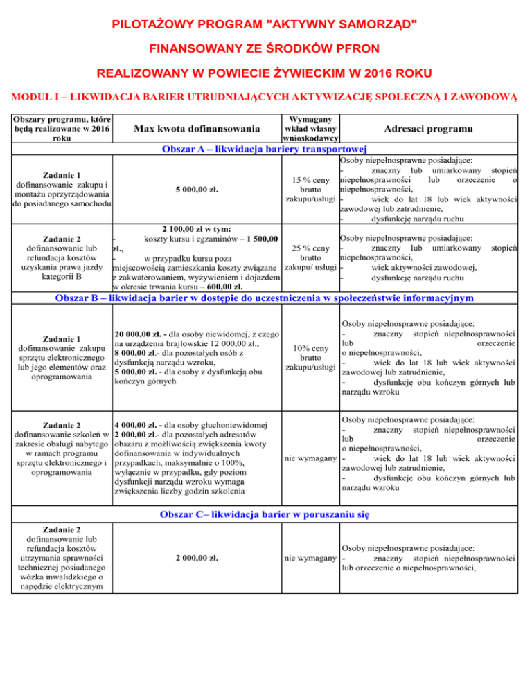 PILOTAŻOWY PROGRAM "AKTYWNY SAMORZĄD" FINANSOWANY ZE ŚRODKÓW PFRON REALIZOWANY W POWIECIE ŻYWIECKIM W 2016 ROKU MODUŁ I – LIKWIDACJA BARIER UTRUDNIAJĄCYCH AKTYWIZACJĘ SPOŁECZNĄ I ZAWODOWĄ Obszary programu, które będą realizowane w 2016 roku Max kwota dofinansowania Wymagany wkład własny wnioskodawcy Adresaci programu Obszar A – likwidacja bariery transportowej Zadanie 1 dofinansowanie zakupu i montażu oprzyrządowania do posiadanego samochodu Zadanie 2 dofinansowanie lub refundacja kosztów uzyskania prawa jazdy kategorii B 5 000,00 zł. Osoby niepełnosprawne posiadające: znaczny lub umiarkowany stopień lub orzeczenie o 15 % ceny niepełnosprawności niepełnosprawności, brutto zakupu/usługi wiek do lat 18 lub wiek aktywności zawodowej lub zatrudnienie, dysfunkcję narządu ruchu 2 100,00 zł w tym: koszty kursu i egzaminów – 1 500,00 Osoby niepełnosprawne posiadające: znaczny lub umiarkowany 25 % ceny niepełnosprawności, brutto w przypadku kursu poza wiek aktywności zawodowej, miejscowością zamieszkania koszty związane zakupu/ usługi z zakwaterowaniem, wyżywieniem i dojazdem dysfunkcję narządu ruchu w okresie trwania kursu – 600,00 zł. - zł., stopień Obszar B – likwidacja barier w dostępie do uczestniczenia w społeczeństwie informacyjnym Osoby niepełnosprawne posiadające: znaczny stopień niepełnosprawności 20 000,00 zł. - dla osoby niewidomej, z czego Zadanie 1 lub orzeczenie na urządzenia brajlowskie 12 000,00 zł., dofinansowanie zakupu 10% ceny o niepełnosprawności, 8 000,00 zł.- dla pozostałych osób z sprzętu elektronicznego brutto dysfunkcją narządu wzroku, wiek do lat 18 lub wiek aktywności lub jego elementów oraz zakupu/usługi 5 000,00 zł. - dla osoby z dysfunkcją obu zawodowej lub zatrudnienie, oprogramowania kończyn górnych dysfunkcję obu kończyn górnych lub narządu wzroku Zadanie 2 dofinansowanie szkoleń w zakresie obsługi nabytego w ramach programu sprzętu elektronicznego i oprogramowania 4 000,00 zł. - dla osoby głuchoniewidomej 2 000,00 zł.- dla pozostałych adresatów obszaru z możliwością zwiększenia kwoty dofinansowania w indywidualnych przypadkach, maksymalnie o 100%, wyłącznie w przypadku, gdy poziom dysfunkcji narządu wzroku wymaga zwiększenia liczby godzin szkolenia Osoby niepełnosprawne posiadające: znaczny stopień niepełnosprawności lub orzeczenie o niepełnosprawności, nie wymagany wiek do lat 18 lub wiek aktywności zawodowej lub zatrudnienie, dysfunkcję obu kończyn górnych lub narządu wzroku Obszar C– likwidacja barier w poruszaniu się Zadanie 2 dofinansowanie lub refundacja kosztów utrzymania sprawności technicznej posiadanego wózka inwalidzkiego o napędzie elektrycznym 2 000,00 zł. Osoby niepełnosprawne posiadające: nie wymagany znaczny stopień niepełnosprawności lub orzeczenie o niepełnosprawności, dla protezy na III poziomie jakości, po amputacji: 9 000,00 zł. – w zakresie ręki, 20 000,00 zł.- przedramienia, 26 000,00 zł. – ramienia i wyłuszczenia w stawie barkowym, 14 000,00 zł. – na poziomie podudzia, 20 000,00 zł. – na wysokości uda ( także przez Zadanie 3 staw kolanowy), dofinansowanie zakupu 25 000,00 zł. – uda i wyłuszczeniu w stawie protezy kończyny, w której biodrowym, zastosowano nowoczesne z możliwością zwiększenia kwoty 10 % ceny rozwiązania techniczne tj. dofinansowania w wyjątkowych przypadkach i brutto protezy co najmniej na III wyłącznie wtedy, gdy celowość zwiększenia zakupu/ usługi poziomie jakości jakości protezy do poziomu IV ( dla zdolności do pracy wnioskodawcy) zostanie zarekomendowana przez eksperta PFRON Osoby niepełnosprawne posiadające: stopień niepełnosprawności, wiek aktywności zawodowej lub zatrudnienie, potwierdzoną opinią eksperta PFRON stabilność pro procesu chorobowego, potwierdzone opinią eksperta PFRON rokowania uzyskania zdolności do pracy w wyniku wsparcia udzielonego w programie 200,00 zł. - refundacja kosztów dojazdu adresata programu na spotkanie z ekspertem PFRON lub kosztów dojazdu eksperta PFRON na spotkanie z adresatem programu Zadanie 4 dofinansowanie lub refundacja kosztów utrzymania sprawności technicznej posiadanej protezy kończyny (co najmniej na III poziomie jakości) Osoby niepełnosprawne posiadające: stopień niepełnosprawności, wiek aktywności zawodowej lub 10 % ceny zatrudnienie, brutto potwierdzoną opinią eksperta PFRON zakupu/ usługi stabilność pro procesu chorobowego, potwierdzone opinią eksperta PFRON rokowania uzyskania zdolności do pracy w wyniku wsparcia udzielonego w programie - do 30% kwot, o których mowa w zadaniu 3 Obszar D– pomoc w utrzymaniu aktywności zawodowej poprzez zapewnienie opieki nad jedną ( każdą ) osobą zależną dofinansowanie lub refundacja kosztów opieki nad osobą zależną ( opłata 200,00 zł. miesięcznie, jednak nie więcej niż za pobyt dziecka w żłobku 2 400,00 zł. w ciągu roku – tytułem kosztów lub przedszkolu albo inny opieki nad jedną ( każdą) osobą zależną koszt zapewnienia opieki nad dzieckiem) Osoby niepełnosprawne posiadające: znaczny lub umiarkowany stopień 15 % ceny niepełnosprawności, brutto aktywność zawodową, zakupu/ usługi pełniące rolę opiekuna prawnego dziecka - MODUŁ II – POMOC W UZYSKANIU WYKSZTAŁCENIA NA POZIOMIE WYŻSZYM – poprzez dofinansowanie kosztów edukacji w szkole policealnej, kolegium lub w szkole wyższej ( studia pierwszego i drugiego stopnia, jednolite studia magisterskie, studia podyplomowe lub doktoranckie prowadzone przez szkoły wyższe).
