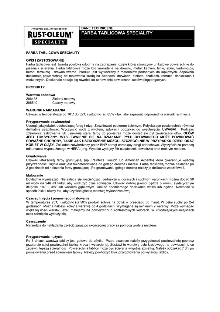 DANE TECHNICZNE FARBA TABLICOWA SPECIALITY FARBA TABLICOWA SPECIALITY OPIS I ZASTOSOWANIE Farba tablicowa jest twardą powłoką odporną na zadrapania, dzięki której stworzymy unikatowe powierzchnie do pisania i ścierania. Farba tablicowa może być nakładana na drewno, metal, kamień, tynki, szkło, karton-gips, beton, terrakotę i drewno twarde. Produkt jest wytwarzany z materiałów podobnych do łupkowych. Zapewnia doskonałą powierzchnię do malowania kredą na ścianach, drzwiach, stołach, szafkach, ramach, doniczkach i wielu innych. Doskonale nadaje się również do odnowienia powierzchni stołów pingpongowych. PRODUKTY Warstwa końcowa 206438 Zielony matowy 206540 Czarny matowy WARUNKI NAKŁADANIA Używać w temperaturze od 10°C do 32°C i wilgotno ści 85% - tak, aby zapewnić odpowiednia warunki schnięcia. Przygotowanie powierzchni Usunąć jakąkolwiek odchodzącą farbę i rdzę. Zeszlifować papierem ściernym. Połyskujące powierzchnie również delikatnie zeszlifować. Wyczyścić wodą z mydłem, spłukać i odczekać do wyschnięcia. UWAGA! Podczas zdzierania, szlifowania lub usuwania starej farby do powietrza może dostać się pył zawierający ołów. OŁÓW JEST TOKSYCZNY. WYS. TAWIENIE SIĘ NA DZIAŁANIE PYŁU OŁOWIANEGO MOŻE POWIDOWAĆ POWAŻNE CHOROBY, TAKIE JAK USZKODZENIE MÓZGU, SZCZEGÓLNIE W PRZYPADKU DZIECI ORAZ KOBIET W CIĄŻY. Zakładać zatwierdzony przez BHP sprzęt chroniący drogi oddechowe. Wyczyścić za pomocą odkurzacza wyposażonego w HEPA (ang. Wysoko wydajny filtr cząsteczek powietrza) oraz mokrym mopem. Gruntowanie Używać lateksowej farby gruntującej (np. Painter’s Touuch lub American Accents) która gwarantuje wysoką przyczepność i krycie oraz jest rekomendowana do gołego drewna i metalu. Farbę tablicową można nakładać po 2 godzinach od nałożenia farby gruntującej. Po gruntowaniu gołego drewna należy je delikatnie zeszlifować. Malowanie Dokładnie wymieszać. Nie zaleca się rozcieńczać. Jednakże w gorących i suchych warunkach można dodać 59 ml wody na 946 ml farby, aby wydłużyć czas schnięcia. Używać dobrej jakości pędzla o włosiu syntetycznym długości 1/4” – 3/8” lub wałkiem gąbkowym. Unikać nadmiernego dociskania wałka lub pędzla. Nakładać w sposób lekki i równy tak, aby uzyskać gładką warstwę wykończeniową. Czas schnięcia i ponownego malowania W temperaturze 25°C i wilgotno ści 50% produkt schnie na dotyk w przeciągu 30 minut. W pełni suchy po 2-4 godzinach. Można nałożyć kolejną warstwę po 4 godzinach. Wymagane są minimum 2 warstwy. Może wymagać większej ilości warstw, jeżeli malujemy na powierzchni o kontrastowych kolorach. W chłodniejszych miejscach czas schnięcia wydłuży się. Czyszczenie Narzędzia do nakładania czyścić zaraz po skończonej pracy za pomocą wody z mydłem. Przygotowanie i użycie Po 3 dniach warstwa tablicy jest gotowa do użytku. Przed pisaniem należy przygotować powierzchnię poprzez przetarcie całej powierzchni tablicy kredą i wytarcie jej. Zostawi to warstwę pyłu kredowego na powierzchni, co zapewni lepszą ścieralność. Powierzchnia tablicy może być ścierana wilgotną szmatką. Należy odczekać 7 dni po pomalowaniu przed ścieraniem tablicy. Należy powtórzyć krok przygotowania po wytarciu tablicy. Dane techniczne Właściwości fizyczne Czarny mat Zielony mat Akryl modyfikowany Akryl modyfikowany Rodzaj pigmentu TiO2, sjenit nefelitowy TiO2, sjenit nefelitowy Rozpuszczalnik Woda, Glikol, Ester Alkohol 1,29 kg/L Woda, Glikol, Ester Alkohol 1,29 kg/L 54,4% 54,9% 41% 41,6% <250 g/l <250 g/l Zalecana grubość suchej warstwy filmu 32,5 – 50 µ 32,5 – 50 µ Grubość mokrej warstwy w celu uzyskania zalecanej grubości suchej warstwy filmu (materiał nierozcieńczony) 80 – 122,5 µ 80 – 122,5 µ Teoretyczna wydajność przy 25µ suchej warstwy filmu 16,46 m2/l 16,8 m2/l Praktyczna wydajność przy zalecanej suchej warstwie filmu (zakłada 15% stratę materiału) 8 – 11 m2/900 ml* (*oparte na rzeczywistym nakładaniu) 30 minut 8 – 11 m2/900 ml* (*oparte na rzeczywistym nakładaniu) 30 minut 2 godziny 2 godziny 4 godziny 4 godziny Nie dostępne Nie dostępne 5 lat 5 lat Rodzaj żywicy Waga Na litr Substancje stałe Wagowo Objętościowo Lotne związki organiczne Czasy schnięcia przy 21°C i 50% wilgotno ści względnej Na dotyk Do obchodzenia Do nałożenia warstwy kolejnej Ognioodporność Przydatność Informacje dotyczące bezpieczeństwa Temperatura zapłonu Zawiera Ostrzeżenie! >93°C Dodatkowe informacje w karcie charakterystyki Dane techniczne i zalecenia przedstawione w niniejszym dokumencie są prawidłowe na dzień sporządzenia dokumentu i stan dostępnej wiedzy oraz podane w najlepszej wierze. Wszystkie zalecenia i informacje przedstawione w tym dokumencie nie stanowią jakiejkolwiek gwarancji względem działania produktu. Z uwagi na fakt, że warunki zastosowania materiału są poza kontrolą producenta, producent gwarantuje, że produkt spełnia standardy jakości producenta materiału. Producent ogranicza swoją odpowiedzialność wyłącznie do wymiany wadliwego materiału. Producent zastrzega sobie prawo do zmiany wszystkich informacji technicznych bez uprzedniego informowania. Dystrybucja w Polsce: Spinex-Stępniak Sp.j www.spinex.pl www.unitedpaints.pl