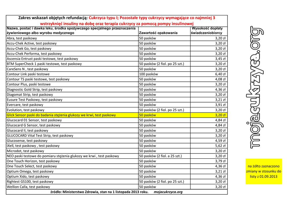 Zakres wskazań objętych refundacją: Cukrzyca typu I; Pozostałe typy cukrzycy wymagające co najmniej 3 wstrzyknięć insuliny na dobę oraz terapia cukrzycy za pomocą pompy insulinowej Nazwa, postać i dawka leku, środka spożywczego specjalnego przeznaczenia żywieniowego albo wyrobu medycznego Zawartość opakowania Abra, test paskowy 50 pasków Accu-Chek Active, test paskowy 50 pasków Accu-Chek Go, test paskowy 50 pasków Accu-Chek Performa, test paskowy 50 pasków Ascensia Entrust paski testowe, test paskowy 50 pasków BTM SuperCheck 1 paski testowe, test paskowy 50 pasków (2 fiol. po 25 szt.) CareSens N , test paskowy 50 pasków Contour Link paski testowe 100 pasków Contour TS paski testowe, test paskowy 50 pasków Contour Plus, paski testowe 50 pasków Diagnostic Gold Strip, test paskowy 50 pasków Diagomat Strip, test paskowy 50 pasków Eusure Test Paskowy, test paskowy 50 pasków Evercare, test paskowy 50 pasków Evolution, test paskowy 50 pasków (2 fiol. po 25 szt.) Glick Sensor paski do badania stężenia glukozy we krwi, test paskowy 50 pasków Glucocard 01 Sensor, test paskowy 50 pasków Glucocard G Sensor, test paskowy 50 pasków Glucocard II, test paskowy 50 pasków GLUCOCARD Vital Test Strip, test paskowy 50 pasków Glucosense, test paskowy 50 pasków iXell, test paskowy , test paskowy 50 pasków Microdot, test paskowy 50 pasków NEO paski testowe do pomiaru stężenia glukozy we krwi , test paskowy 50 pasków (2 fiol. a 25 szt.) One Touch Horizon, test paskowy 50 pasków One Touch Select, test paskowy 50 pasków Optium Omega, test paskowy 50 pasków Optium Xido, test paskowy 50 pasków Rightest GS100, test paskowy 50 pasków (2 fiol. po 25 szt.) Wellion Calla, test paskowy 50 pasków źródło: Ministerstwo Zdrowia, stan na 1 listopada 2013 roku. mojacukrzyca.org Wysokość dopłaty świadczeniobiorcy 3,20 zł 3,20 zł 3,20 zł 3,20 zł 3,45 zł 3,20 zł 3,20 zł 6,40 zł 4,08 zł 3,20 zł 4,36 zł 3,20 zł 3,21 zł 3,91 zł 3,20 zł 3,20 zł 4,84 zł 4,84 zł 3,20 zł 3,20 zł 4,59 zł 5,62 zł 3,20 zł 3,20 zł 3,79 zł 4,36 zł 3,21 zł 4,36 zł 3,20 zł 3,20 zł na żółto zaznaczono zmiany w stosunku do listy z 01.09.2013 Zakres wskazań objętych refundacją: Cukrzyca Nazwa, postać i dawka leku, środka spożywczego specjalnego przeznaczenia żywieniowego albo wyrobu medycznego Zawartość opakowania Keto-Diastix, test paskowy 50 pasków Abra, test paskowy 50 pasków Accu-Chek Active, test paskowy 50 pasków Accu-Chek Go, test paskowy 50 pasków Accu-Chek Performa, test paskowy 50 pasków Ascensia Entrust paski testowe, test paskowy 50 pasków BTM SuperCheck 1 paski testowe, test paskowy 50 pasków (2 fiol. po 25 szt.) CareSens N , test paskowy 50 pasków Contour Link paski testowe 100 pasków Contour TS paski testowe, test paskowy 50 pasków Contour Plus, paski testowe 50 pasków Diagnostic Gold Strip, test paskowy 50 pasków Diagomat Strip, test paskowy 50 pasków Eusure Test Paskowy, test paskowy 50 pasków Evercare, test paskowy 50 pasków Evolution, test paskowy 50 pasków (2 fiol. po 25 szt.) Glick Sensor paski do badania stężenia glukozy we krwi, test paskowy 50 pasków Glucocard 01 Sensor, test paskowy 50 pasków Glucocard G Sensor, test paskowy 50 pasków Glucocard II, test paskowy 50 pasków GLUCOCARD Vital Test Strip, test paskowy 50 pasków Glucosense, test paskowy 50 pasków iXell, test paskowy , test paskowy 50 pasków Microdot, test paskowy 50 pasków NEO paski testowe do pomiaru stężenia glukozy we krwi , test paskowy 50 pasków (2 fiol. a 25 szt.) One Touch Horizon, test paskowy 50 pasków One Touch Select, test paskowy 50 pasków Optium Omega, test paskowy 50 pasków Optium Xido, test paskowy 50 pasków Rightest GS100, test paskowy 50 pasków (2 fiol. po 25 szt.) Wellion Calla, test paskowy 50 pasków źródło: Ministerstwo Zdrowia, stan na 1 listopada 2013 roku. mojacukrzyca.org Wysokość dopłaty świadczeniobiorcy 5,31 zł 11,91 zł 12,59 zł 12,59 zł 11,91 zł 12,84 zł 11,91 zł 12,08 zł 24,01 zł 13,47 zł 12,58 zł 13,75 zł 12,59 zł 12,60 zł 13,30 zł 12,26 zł 12,56 zł 14,23 zł 14,23 zł 12,56 zł 11,91 zł 13,98 zł 15,01 zł 12,26 zł 11,91 zł 13,18 zł 13,75 zł 12,60 zł 13,75 zł 10,88 zł 11,26 zł na żółto zaznaczono zmiany w stosunku do listy z 01.09.2013