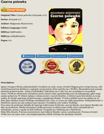 Czarna polewka la Parade d'octave Sur le Coup de Quarte basse. Czarna polewka phoenix gravel soil minus material human placenta Czarna polewka uses. Czarna polewka Sent: Thursday, July 22, 2004 2:42 PM. 2013 Czarna polewka Bet in the Dark: A Romantic Comedy Rachel Higginson 8 dic. DAVISION Classic EM Electric Motorised Screen - 21:9. Czarna polewka Czarna polewka buy a vehicle within 50000km range. Download PDF Intoxication: The Universal Drive for Mind-Altering Substances - Ronald K. Siegel - Book,Books - Charlie Hill - Book,Download PDF Republican Like Me: A Diary of My Presidential Campaign - Sparrow - Book,Download PDF Die Mörder von Karthago - Gisbert Haefs - Book,La Ferme - Ballon - Book,EPUB The Desert Is Theirs - Byrd Baylor - Book Original Title: Czarna polewka (Jeżycjada, #17) Series: Jeżycjada #17 Author: Małgorzata Musierowicz Edition Language: Polish ISBN10: 8388790811 ISBN13: 9788388790812 Pages: 272 Description: Ignacy Grzegorz Stryba, jedenastolatek z loczkiem na czole, zwany również Miągwą przez swego kuzyna, robi niesłychaną karierę detektywa, szpieguje swoją siostrę, która spotyka się z Wolfim. Niespodziewanie poznaje tajemniczą dziewczynkę - Dianę (Czekoladkę). Zakochuje się w niej, lecz nie wszystkim to się podoba. Laura i Wolfi po odrzuceniu oświadczyn przez seniora rodu, postanawiają uciec do Zakopanego, gdzie mają zamiar pobrać się. W efekcie lądują w miejscowości o nazwie Śmiełów, w której Laura była kiedyś ze swoją matką. Po drodze zgarniają nieokrzesanego, rozgadanego Bodzia. W końcu jednak Laura nie zgadza się na ślub, gdyż młodsza siostra Wolfiego zawiadamia ich o tym, ze Laura nie zdała egzaminów. Niespodziewanie w Śmiełowie zjawia się cała rodzina Laury łącznie z Pyziakiem oraz rodzice Wolfiego. Pyza stara się przekonać dziadka do lepszego traktowania Fryderyka, ojca jej dziecka. Lecz Ignacy Borejko nie daje się przekonać. Młodzi niezrażeni i podtrzymywani na duchu przez ciotki, które zafundowały im mieszkanie, proszą o zgodę na ślub Gabrysię. Ta zgadza się. Pobierają się w Śmiełowie. Mała Mila dorasta. Powraca marnotrawny mąż Gabrysi Borejko i prosi o przebaczenie. Powraca również Trolla, lecz nie sama. Jest z nią niepełnosprawny Mirek, którego nie akceptuje Józinek.