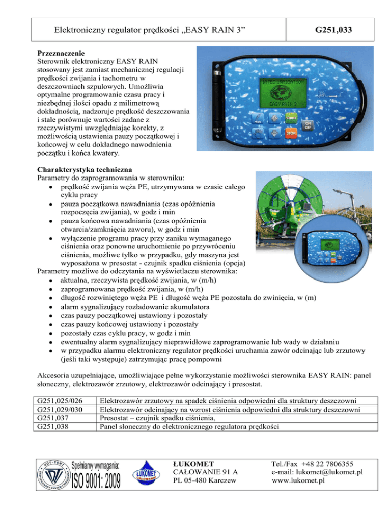 Elektroniczny regulator prędkości „EASY RAIN 3” G251,033 Przeznaczenie Sterownik elektroniczny EASY RAIN stosowany jest zamiast mechanicznej regulacji prędkości zwijania i tachometru w deszczowniach szpulowych. Umożliwia optymalne programowanie czasu pracy i niezbędnej ilości opadu z milimetrową dokładnością, nadzoruje prędkość deszczowania i stale porównuje wartości zadane z rzeczywistymi uwzględniając korekty, z możliwością ustawienia pauzy początkowej i końcowej w celu dokładnego nawodnienia początku i końca kwatery. Charakterystyka techniczna Parametry do zaprogramowania w sterowniku: prędkość zwijania węża PE, utrzymywana w czasie całego cyklu pracy pauza początkowa nawadniania (czas opóźnienia rozpoczęcia zwijania), w godz i min pauza końcowa nawadniania (czas opóźnienia otwarcia/zamknięcia zaworu), w godz i min wyłączenie programu pracy przy zaniku wymaganego ciśnienia oraz ponowne uruchomienie po przywróceniu ciśnienia, możliwe tylko w przypadku, gdy maszyna jest wyposażona w presostat - czujnik spadku ciśnienia (opcja) Parametry możliwe do odczytania na wyświetlaczu sterownika: aktualna, rzeczywista prędkość zwijania, w (m/h) zaprogramowana prędkość zwijania, w (m/h) długość rozwiniętego węża PE i długość węża PE pozostała do zwinięcia, w (m) alarm sygnalizujący rozładowanie akumulatora czas pauzy początkowej ustawiony i pozostały czas pauzy końcowej ustawiony i pozostały pozostały czas cyklu pracy, w godz i min ewentualny alarm sygnalizujący nieprawidłowe zaprogramowanie lub wady w działaniu w przypadku alarmu elektroniczny regulator prędkości uruchamia zawór odcinając lub zrzutowy (jeśli taki występuje) zatrzymując pracę pompowni Akcesoria uzupełniające, umożliwiające pełne wykorzystanie możliwości sterownika EASY RAIN: panel słoneczny, elektrozawór zrzutowy, elektrozawór odcinający i presostat. G251,025/026 G251,029/030 G251,037 G251,038 Elektrozawór zrzutowy na spadek ciśnienia odpowiedni dla struktury deszczowni Elektrozawór odcinający na wzrost ciśnienia odpowiedni dla struktury deszczowni Presostat – czujnik spadku ciśnienia, Panel słoneczny do elektronicznego regulatora prędkości ŁUKOMET CAŁOWANIE 91 A PL 05-480 Karczew Tel./Fax +48 22 7806355 e-mail: [email protected] www.lukomet.pl
