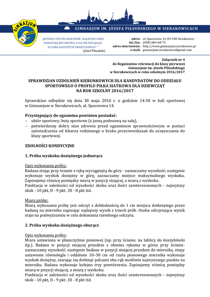 GIMNAZJUM IM. JÓZEFA PIŁSUDSKIEGO W SIERAKOWICACH „JEDYNIE CZYN MA ZNACZENIE. NAJLEPSZE CHĘCI POZOSTAJĄ BEZ SKUTKU, O ILE NIE POCIĄGAJĄ ZA SOBĄ NASTĘPSTW PRAKTYCZNYCH .” (Józef Piłsudski) adres: tel./fax: adres internetowy: e-mail: ul. Spacerowa 14, 83-340 Sierakowice (058) 684-68-75 http://www.gimnazjum.sierakowice.pl [email protected] Załącznik nr 4 do Regulaminu rekrutacji do klasy pierwszej Gimnazjum im. Józefa Piłsudskiego w Sierakowicach w roku szkolnym 2016/2017 SPRAWDZIAN UZDOLNIEŃ KIERUNKOWYCH DLA KANDYDATÓW DO ODDZIAŁU SPORTOWEGO O PROFILU PIŁKA SIATKOWA DLA DZIEWCZĄT NA ROK SZKOLNY 2016/2017 Sprawdzian odbędzie się dnia 30 maja 2016 r. o godzinie 14:30 w hali sportowej w Gimnazjum w Sierakowicach, ul. Spacerowa 14. Przystępujący do egzaminu powinien posiadać: ubiór sportowy, buty sportowe (z jasną podeszwą na salę), potwierdzony dobry stan zdrowia przed egzaminem sprawnościowym w postaci zaświadczenia od lekarza rodzinnego o braku przeciwwskazań do uczęszczania do klasy sportowej. ZDOLNOŚCI KONDYCYJNE 1. Próba wyskoku dosiężnego jednorącz Opis wykonania próby: Badana stojąc przy ścianie z ręką wyciągniętą do góry - zaznaczamy wysokość, następnie wykonuje wyskok dosiężny w górę, zaznaczamy miejsce maksymalnego wyskoku. Zapisujemy różnicę pomiędzy miarą w pozycji stojącej, a miarą z wyskoku. Punktacja w zależności od wysokości skoku oraz ilości zainteresowanych - najwyższy skok - 10 pkt, II - 9 pkt , III - 8 pkt itd. Miara próby: Miarą wykonania próby jest odczyt z dokładnością do 1 cm miejsca dotkniętego przez badaną na mierniku zapisując najlepszy wynik z trzech prób. Osoba odczytująca wynik staje na podwyższeniu w celu dokonania rzetelnego odczytu. 2. Próba wyskoku dosiężnego oburącz Opis wykonania próby: Miara ustawiona w płaszczyźnie pionowej (np. przy ścianie, na tablicy do koszykówki itp.). Badana w pozycji stojącej przodem z obiema rękoma w górze przy ścianiezaznaczamy wysokość, następnie badana w pozycji stojącej przodem do miernika, stopy ustawione równolegle i oddalone 10–30 cm od rzutu pionowego miernika wykonuje wyskok dosiężny, starając się dotknąć palcami obu rąk możliwie najwyższego punktu na mierniku. Badana wykonuje kolejno trzy powtórzenia. Zapisujemy różnicę pomiędzy miarą w pozycji stojącej, a miarą z wyskoku. Punktacja w zależności od wysokości skoku oraz ilości zainteresowanych - najwyższy skok - 10 pkt, II - 9 pkt , III - 8 pkt itd. Miara próby: Miarą wykonania próby jest odczyt z dokładnością do 1 cm miejsca dotkniętego przez badaną na mierniku zapisując najlepszy wynik z trzech prób. Pod uwagę bierze się niższą wysokość zasięgu jednej z rąk (w przypadku różnych wysokości). Osoba odczytująca wynik staje na podwyższeniu w celu dokonania rzetelnego odczytu. 3. Próba odbicia piłki sposobem górnym, dolnym po podaniu przez trenera Opis wykonania próby: Po podaniu trenera zawodnik odbija piłkę siatkową sposobem raz górnym raz dolnym przez siatkę. Zawodnik ustawiony na polu ataku. Oceniana jest technika odbić, postawa siatkarska. Ocena próby: Ocena trenera w skali od 1-6 pkt. 4. Próba zagrywki Opis wykonania próby: Ocena wykonania zagrywki. zagrywki. Ilość prób – 3. Zawodnik ma możliwość wyboru rodzaju wykonania Ocena próby: Zagrywka tenisowa wykonana prawidłowo 2 pkt, zagrywka sposobem dolnym, bądź bocznym – 1 pkt. 5. Próba siły dynamicznej mięśni obręczy barkowej Opis wykonania próby: Badana wykonuje rzut piłką lekarską 1 kg oburącz zza głowy stojąc (stopy równolegle) przed linią. Wykonywane są trzy próby. Po rzucie badana może przekroczyć linię, gdy piłka upadnie na boisko. Miara próby: Miarą wykonania próby jest odległość rzutu, mierzona z dokładnością do 0,1 m. Zapisywany jest wynik najlepszy. Punktacja w zależności od długości rzutu oraz ilości zainteresowanych – najdalszy rzut 10 pkt, II - 9 pkt , III - 8 pkt, itd. Sprzęt i pomoce: piłka lekarska 1 kg, taśma miernicza. 6. Próba wytrzymałości szybkościowej biegowej Opis wykonania próby: Bieg wahadłowy na dystansie 150 m po przekątnej boiska. Badana z pozycji stojąc (stopy równolegle) zza linii start w dowolnym momencie rozpoczyna bieg. Pokonuje dystans 6 x 25 m obiegając stojaki. Miara próby: Punktacja w zależności od uzyskanego czasu oraz ilości zainteresowanych – najlepszy czas - 10 pkt, II - 9 pkt , III - 8 pkt itd.